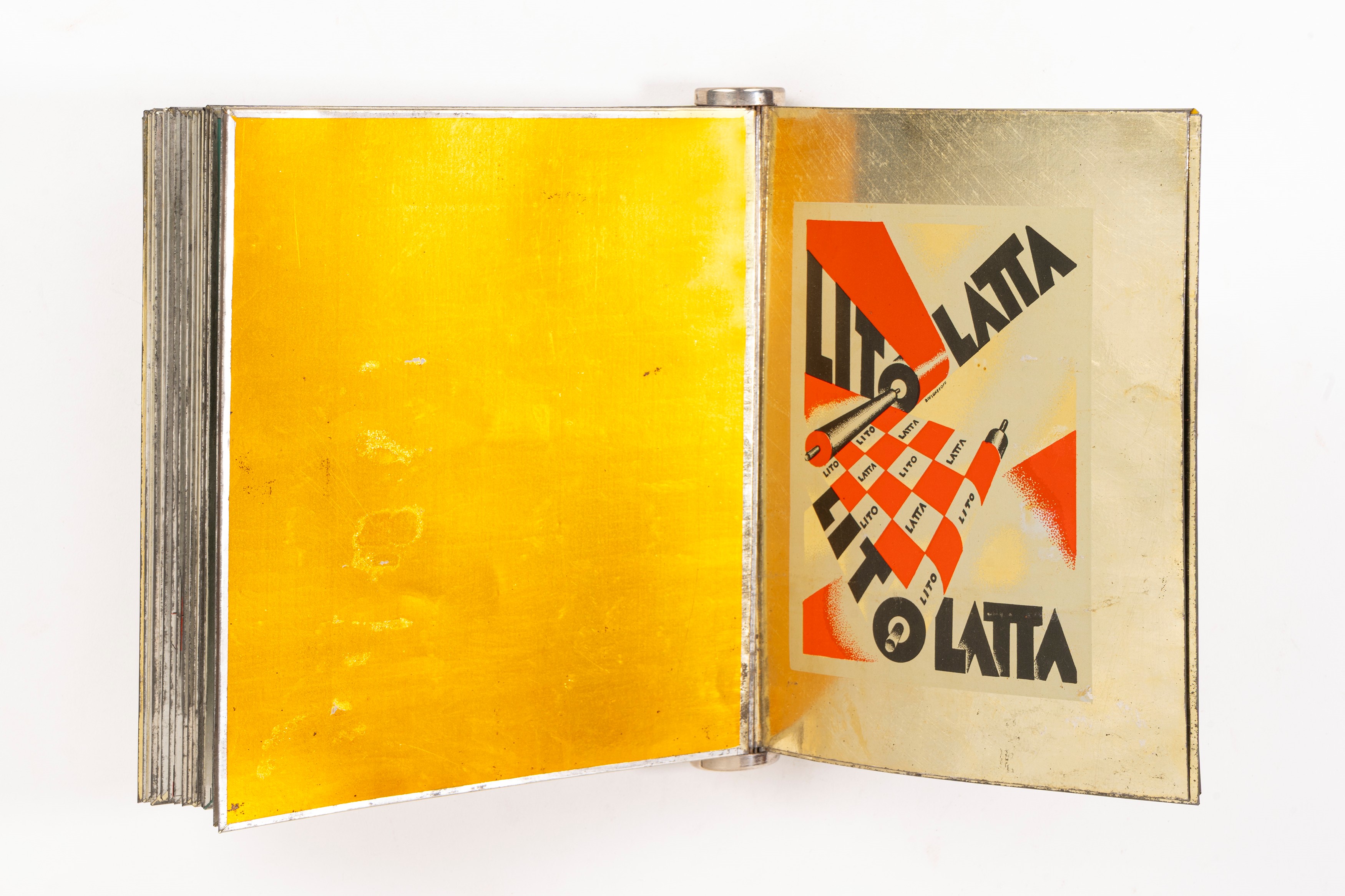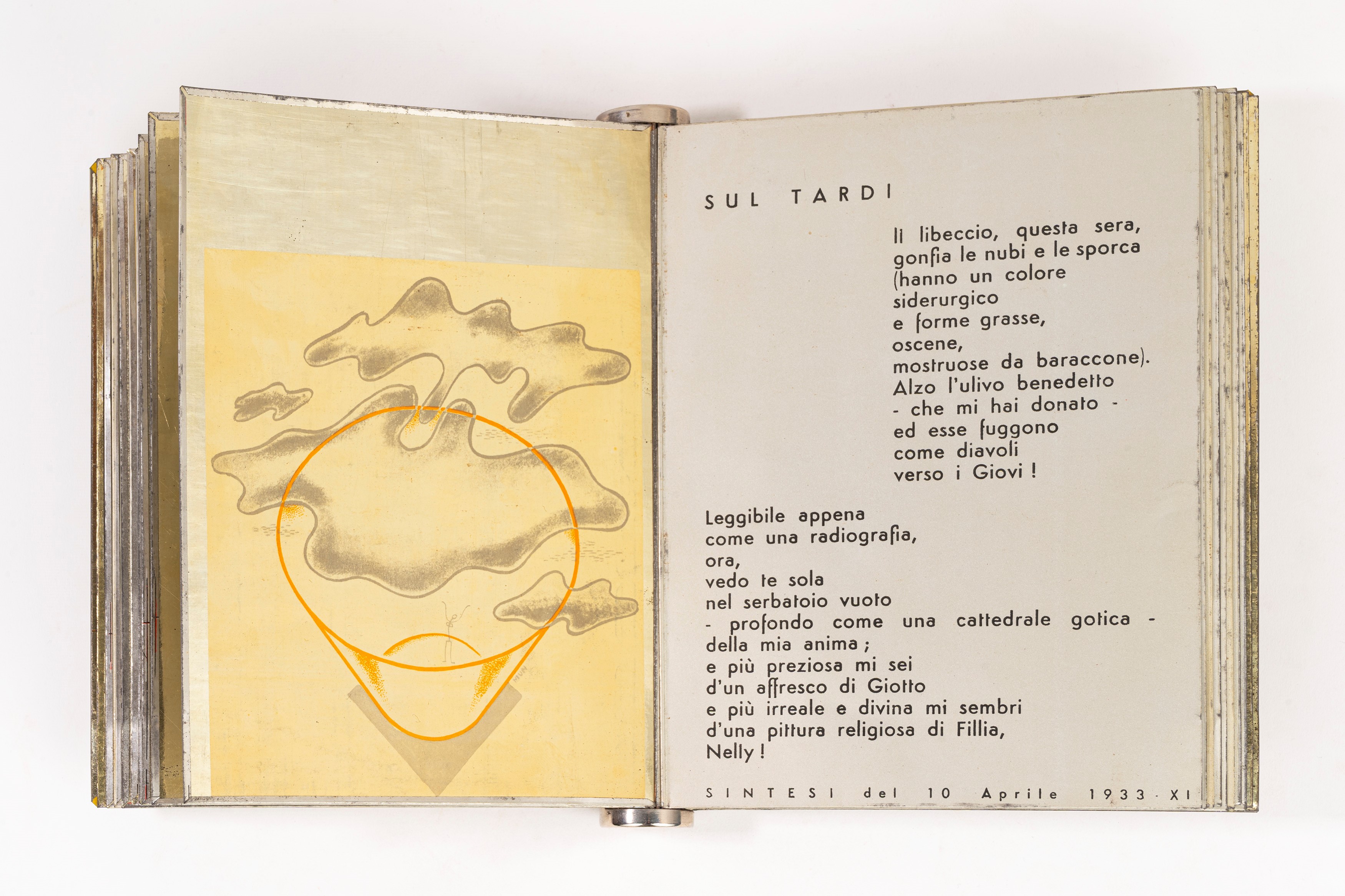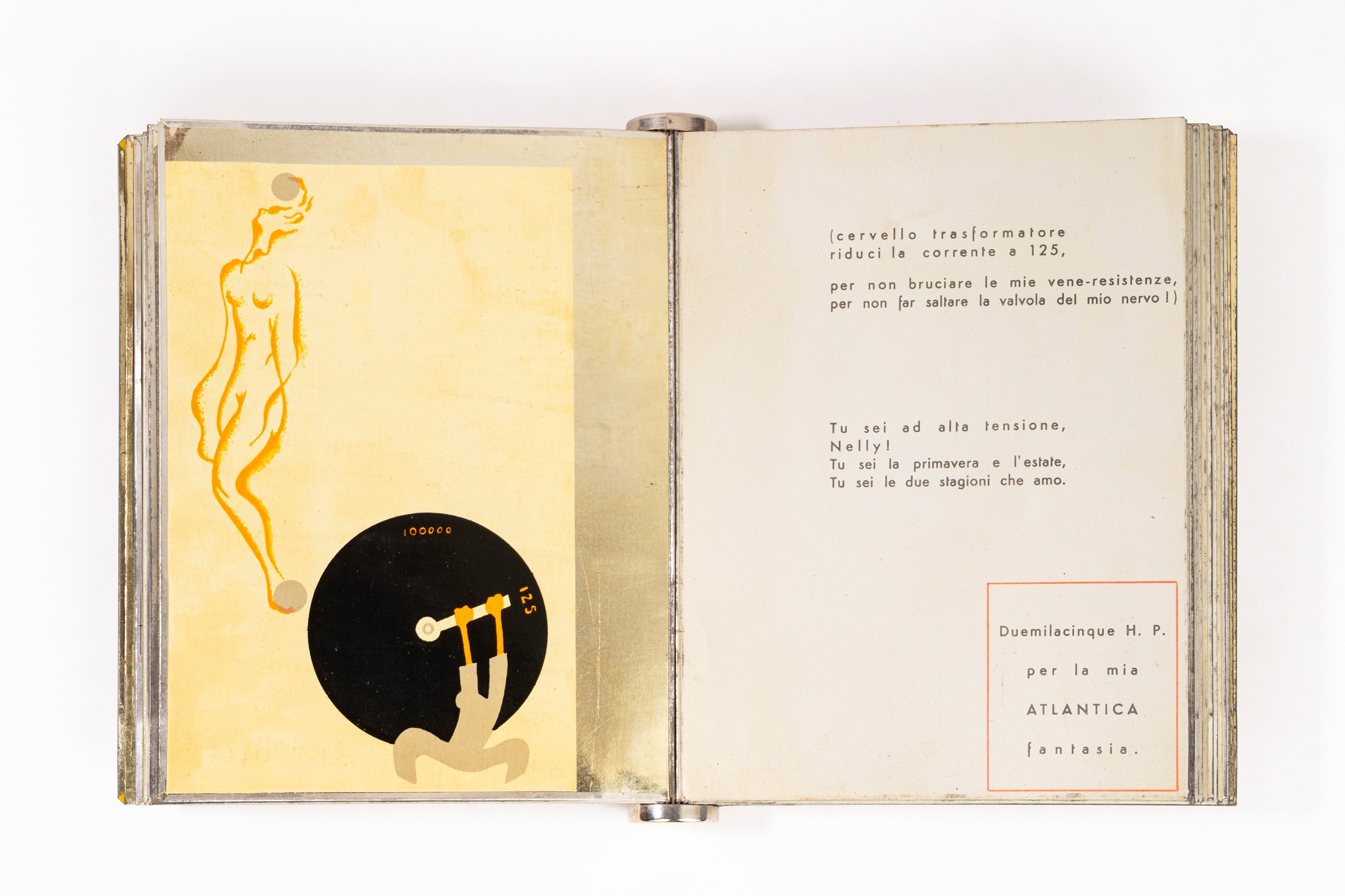 Edizioni Futuriste di Poesia (Roma), Lito-Latta Savona, 1934. Stampato su 21 fogli di metallo, con un ritratto di Diulgheroff, prefazione di Filippo Tommaso Marinetti e 12 litografie a piena pagina di Bruno Munari, legatura editoriale in metallo con dorso a cilindro, lievi ossidature, graffi e altri minimi difetti.