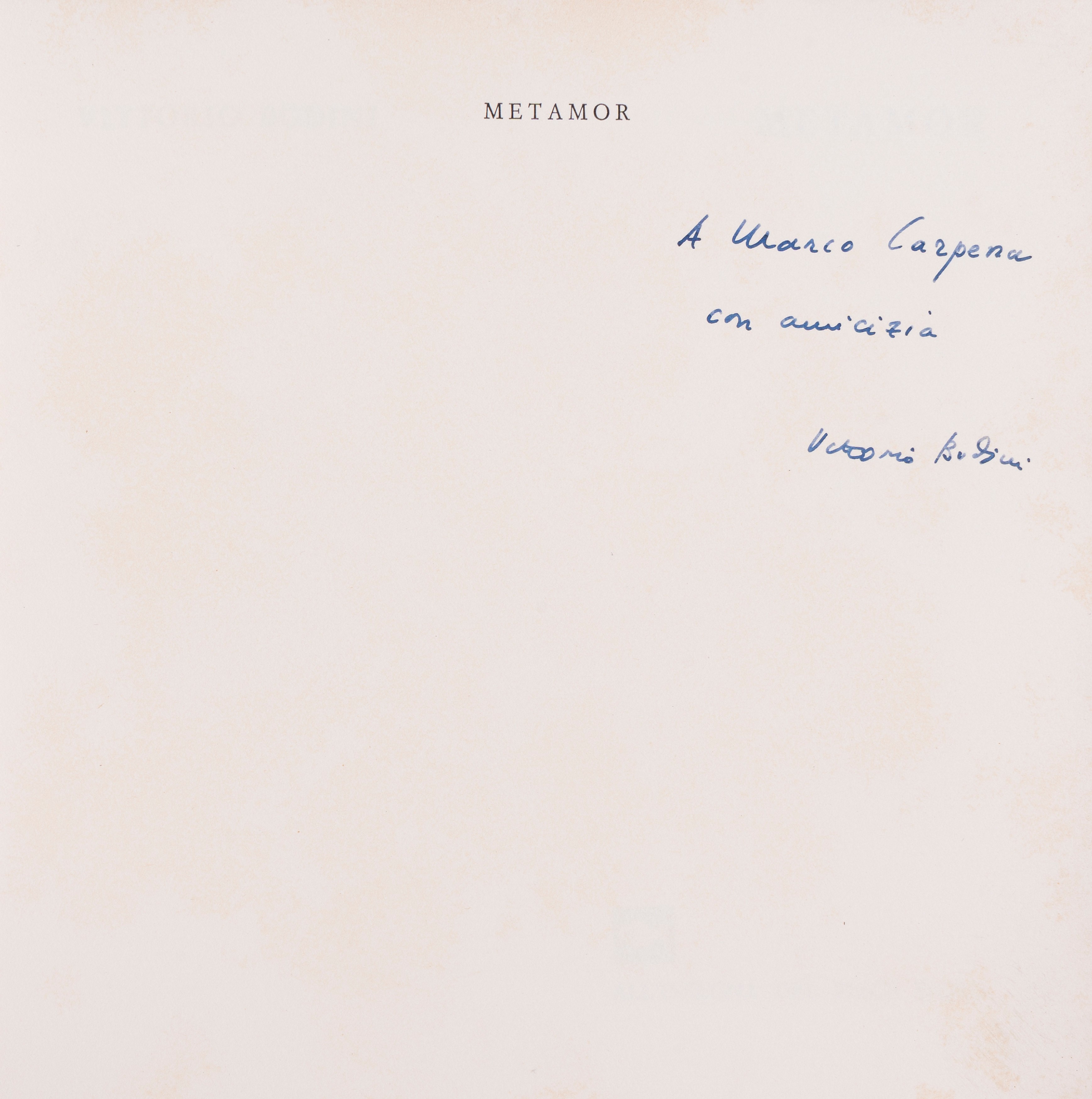 Prima edizione del 1967, casa editrice Vanni Scheiwiller, All’insegna del pesce d’oro. Brossura editoriale. Volume n. 24 della serie “Il Quadrato”. Tiratura di 600 esemplari numerati. Esemplare n. 383. Con dedica dell’autore all’editore Marco Carpena.