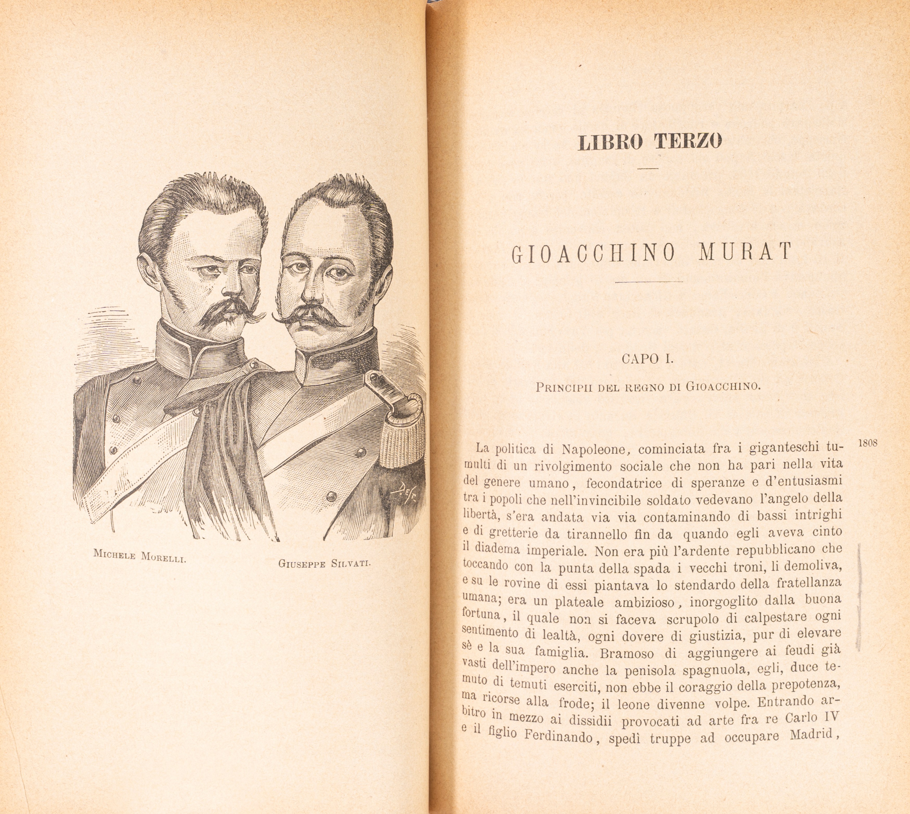 Torino, Tarizzo, 1892. Storia documentata delle rivoluzioni calabresi dal 1799 al 1862. In 8°, voll. 2 legati in uno, con 40 tavole, incise su rame e comprese nella numerazione raffiguranti personaggi della famiglia borbonica, politici e militari. Legatura mz. pelle, cordoni, titolo e fregi in oro al dorso. Rara edizione originale.