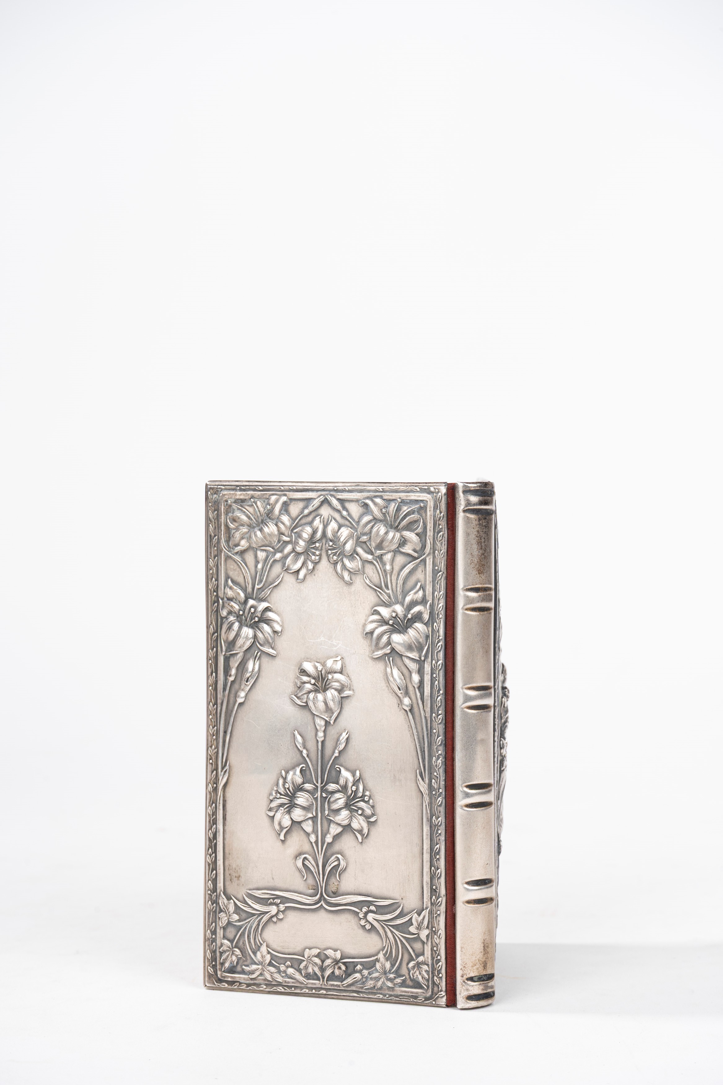 Milano, Studio Litografico G. Fraschini & C., 1902. In 32°. Libro di preghiere cattolico completamente cromolitografato in stile Art Nouveau e con legatura in argento in altorilievo e punzonata. Volume rilegato su 2 nervature incassate, con la Madonna del Rosario del santuario della Vergine del Rosario di Pompei raffigurata in altorilievo sulla copertina anteriore (Madonna con Bambino che porgono il rosario a San Domenico e Santa Caterina), affiancati da fiori e un riquadro con "SS. Vergine del Rosario in Pompei". Il dorso presenta 6 coppie di scanalature orizzontali doppie, che lo suddividono in 5 sezioni, con tessuto rosso visibile nelle cerniere. Il testo è stato scritto da Luigi Condio, canonico della chiesa a Torino e autore di diverse edizioni del Manuale di preghiere. Le illustrazioni e le decorazioni sono opera del miniaturista e calligrafo torinese Vittorio Vulten, che senza dubbio ha anche realizzato la calligrafia del testo.