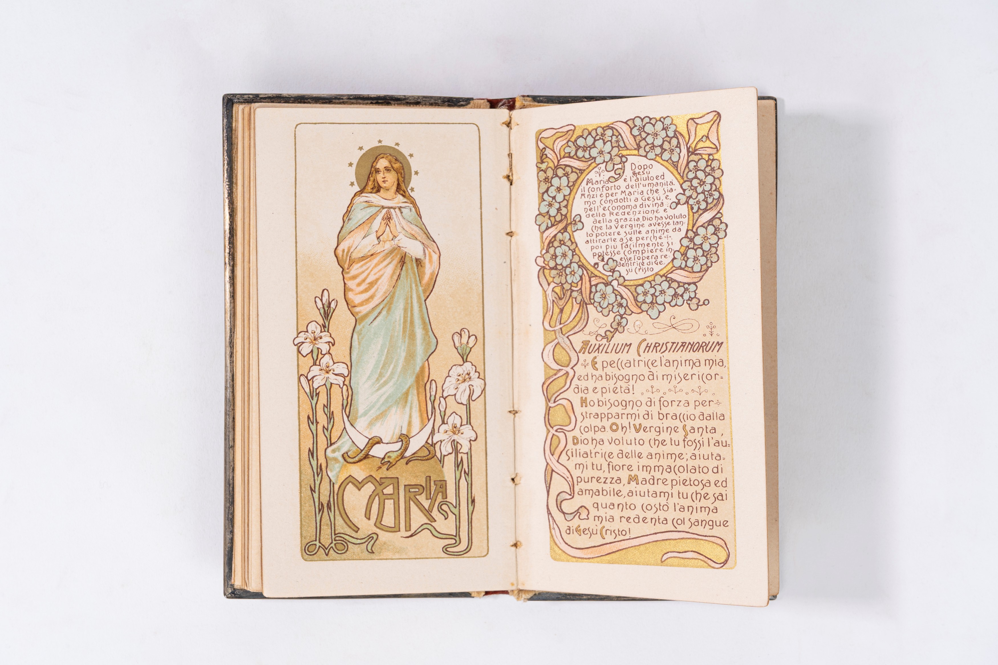 Si tratta di un libro di preghiere Art Nouveau interamente cromolitografato, stampato in numerosi colori pastello più oro, con decorazioni (per lo più floreali) su ogni pagina e numerose illustrazioni supplementari: