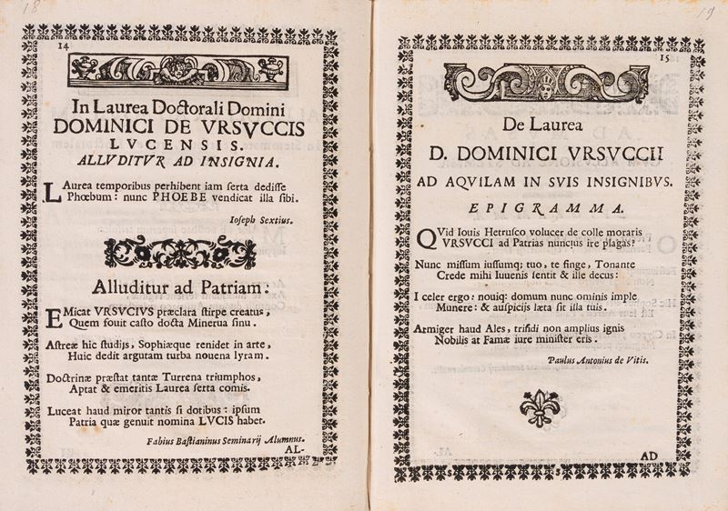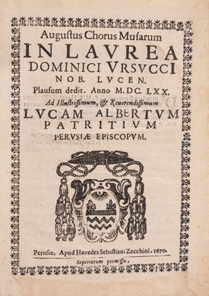 Perusiae, apud haeredes Sebastiani Zecchini, 1670. In-8°, legatura moderna in piena pelle, tre nervi al dorso. Frontespizio e testo in caratteri neri entro una cornice decorata in xilografia; stemma del vescovo Luca Alberto Patrizi in xilografia al frontespizio. Iniziali, testatine e finali in xilografia. Lievissimo foxing marginale ad alcune carte. Bruniture alle controguardie e alle guardie libere. Nel complesso, un ottimo esemplare. § Insieme nel lotto: Apezteguia Giovanni Angelo, Brevissima, et acurata omnium utriusque iuris librorum anotomia, Mediolani, ex typographia Iosephi Pandulphi Malatestae, 1710. In-4°, 188x140 mm, leg. coeva in cartonato rivstito da carta colorata, con titolo manoscritto al dorso; pp. 69, [3]. Segni d'uso alla legatura (abrasioni alla carta della copertina, soprattutto al dorso e al margine laterale del piatto anteriore). Occasionali macchie alle carte, che sono croccanti, spesse e in generale pulite. Buon esemplare.