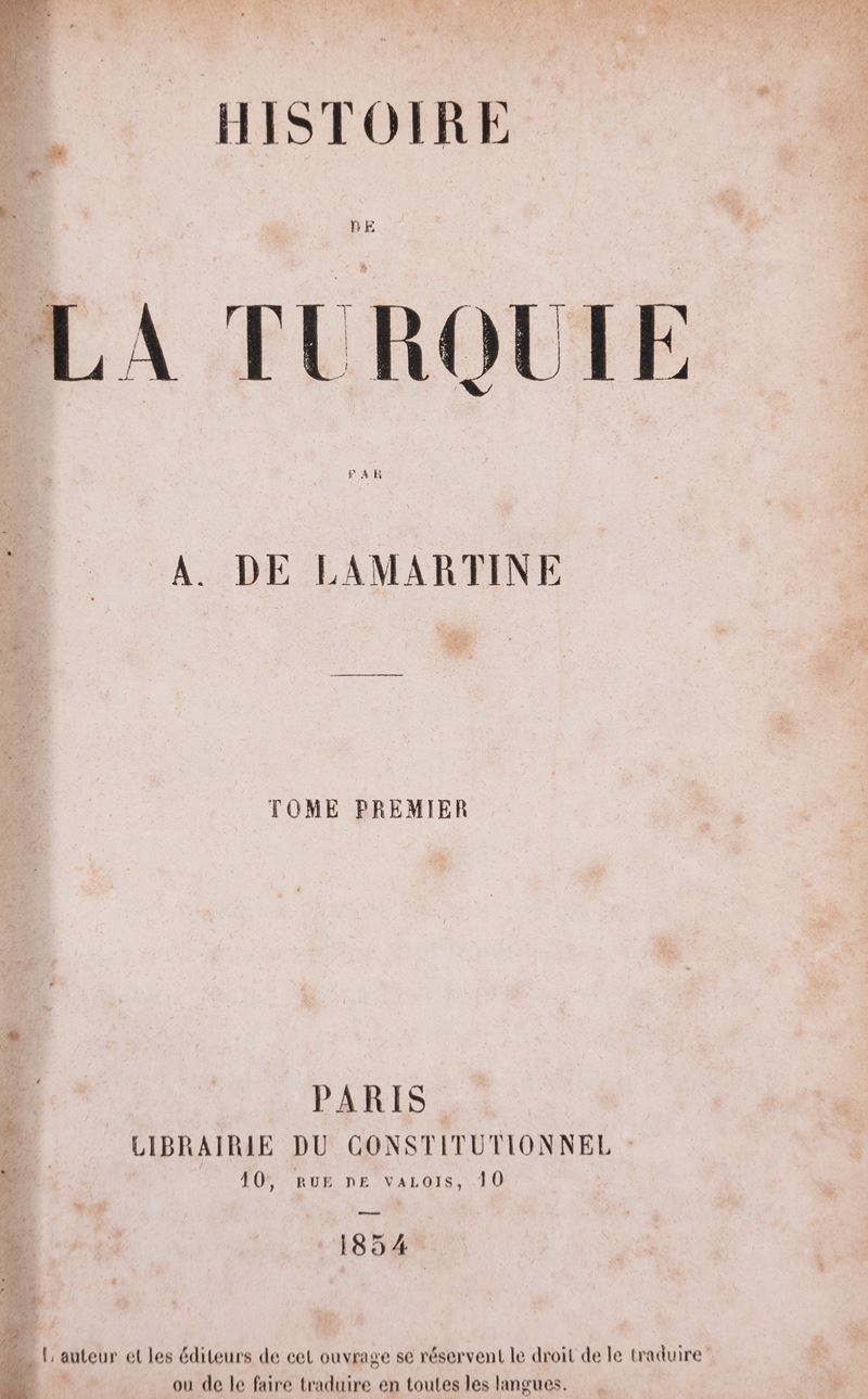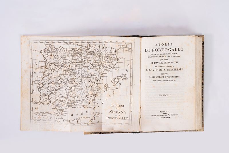 Parigi, Librairie du Constitutionnel, 1854. In-8°; leg. contemporanea in mezza pelle e percalina colore marrone melanzana, con dorso liscio a falsi nervi (4) con filetti e decori dorati, titolo e numero del vol. a caratteri dorati al dorso; guardie in carta marmorizzata; 8 vol. testo in francese. Prima edizione in questo formato, uscita nello stesso anno dell'edizione originale. Vicaire, IV, 1008 ; Talvart, XI, 51. Tracce d'uso alla legatura (qualche cuffia è leggermente consumata, cerniere lente, lievi graffi ai piatti, angoli consumati), foxing diffuso all'interno; opera completa, nel complesso buon esemplare. § Insieme nel lotto: Bertolotti D., Storia di Portogallo […], in continuazione della Storia universale scritta dagli autori i più' distinti con rami e carte geografiche. Volume I [-III], nella Stamperia di Pio Cipicchia, Roma, 1833. In-8°, legatura coeva in mezza pelle con carta marmorizzata ai piatti, titolo e decori in oro al dorso piatto; 3 voll.; tavole e mappe ripiegate. Presenza occasionale di volpi. Nel complesso, un ottimo set.