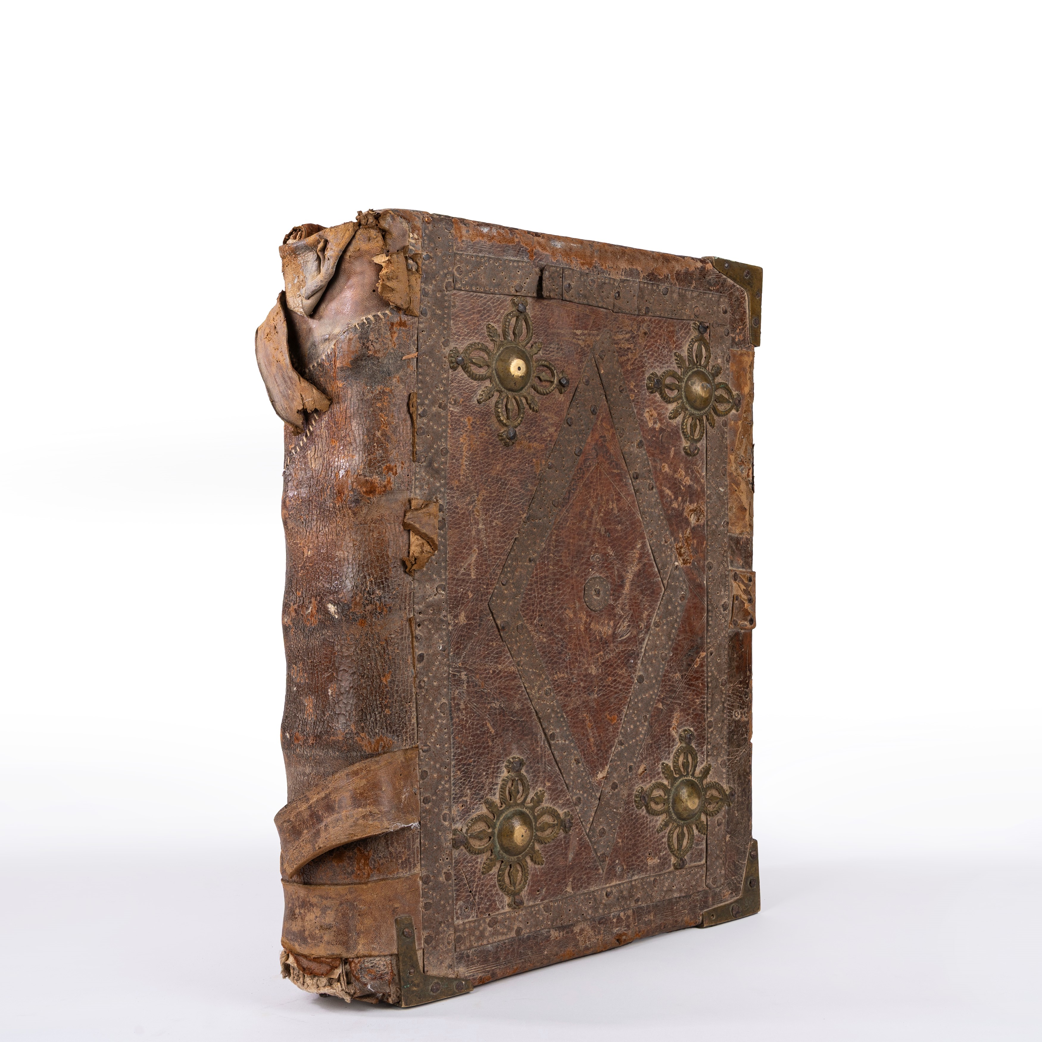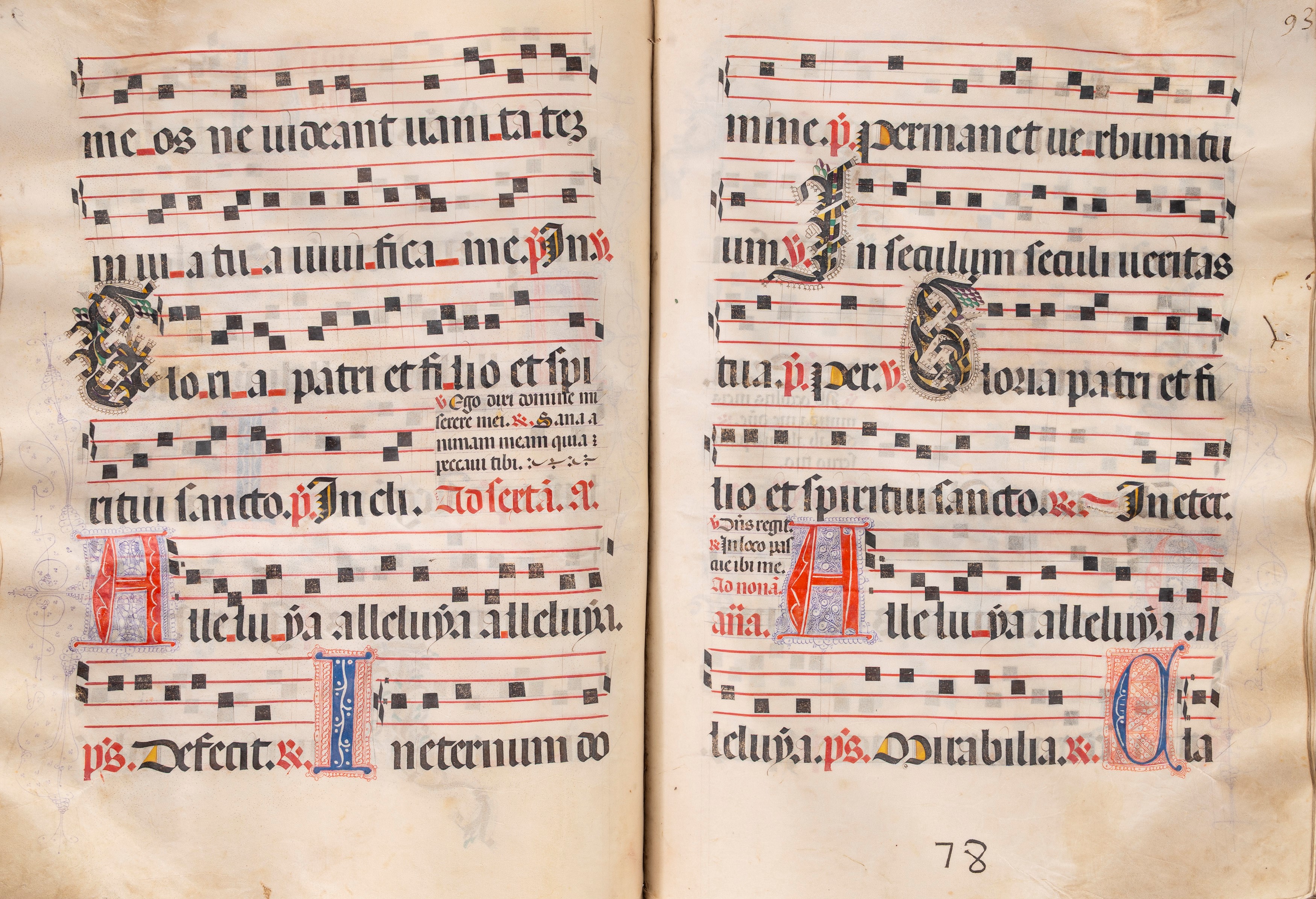 Sontuoso antifonario in pergamena databile alla fine del sec.XV, composto da 182 fogli di grandi dimensioni, 500 x 370 mm., con decine di iniziali decorate con tecnica a filigrana rossa e blu e altra, le lettere di varie dimensioni, in buono stato di conservazione internamente, la legatura è su assi di legno ricoperti di pelle con borchie e cantonali, bindelle mancanti, sciupata.