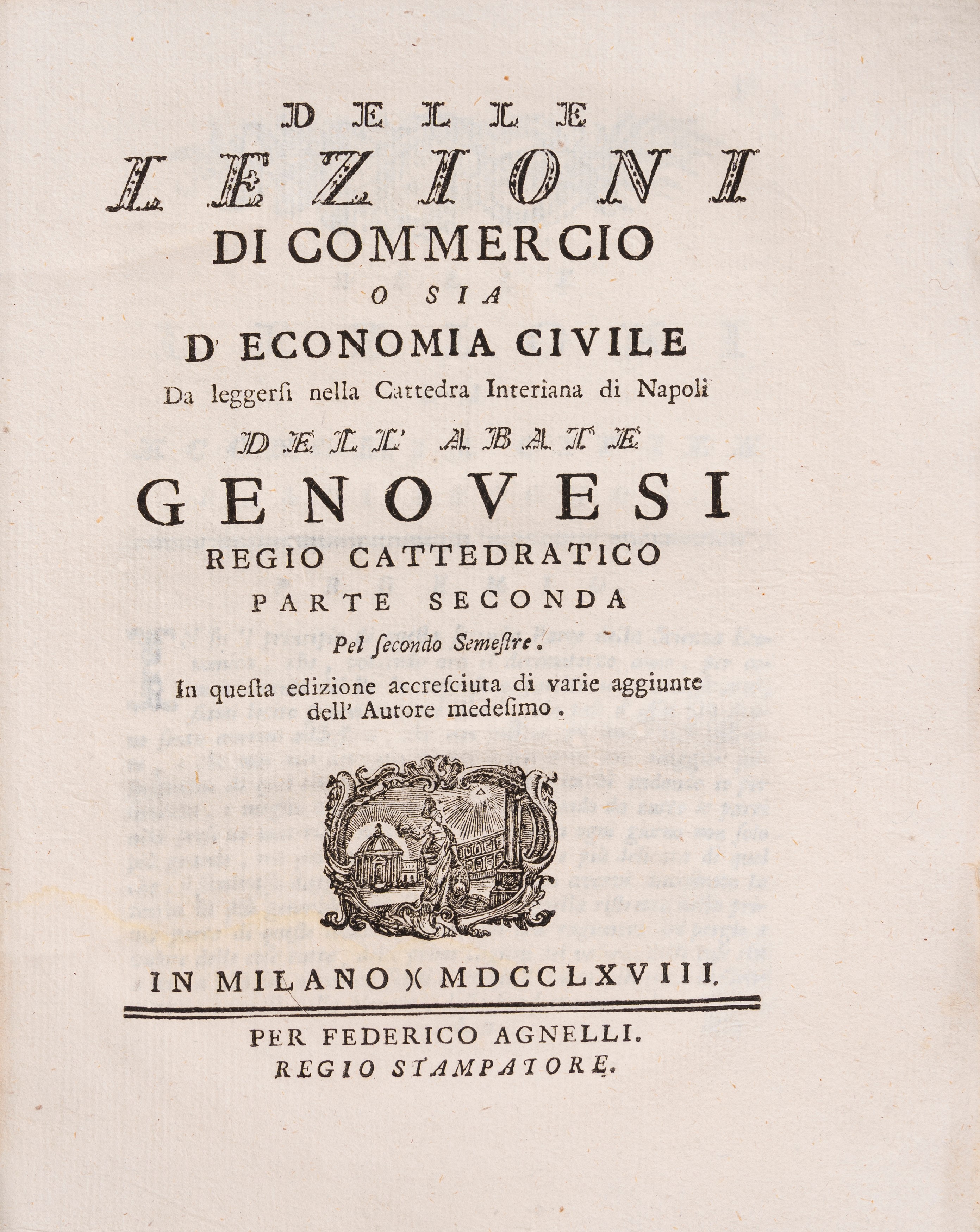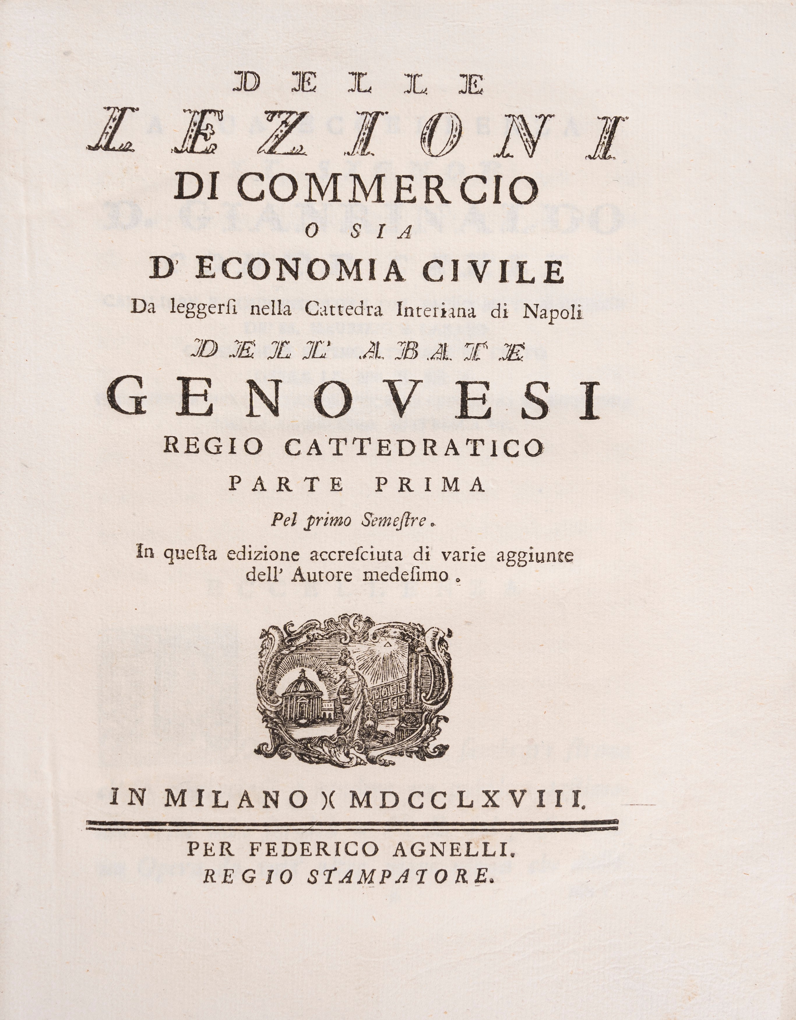 Seconda edizione (la prima Napoli, 1765) "accresciuta di varie aggiunte", dell'opera del filosofo ed economista Antonio Genovesi (1713-1769), dal 1754 detentore di una cattedra istituita appositamente per lui presso l'Ateneo napoletano da Bartolomeo Intieri.