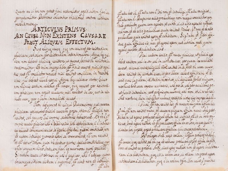 Manoscritto della fine del 700, primi dell'800, privo di date, leg. ottocentesca in pelle maculata con fregi dorati al dorso a cinque nervi, tagli colorati a spruzzo rosso e neri; carte [513], [7 b.]. Il testo comprende le seguenti quattro parti, separate ciascuna da una carta bianca: [1.]: Disputatio prima. De principiis intrinsecis entis naturalis. [2.]: Disputatio secunda. De causis extrinsecis entis naturalis. [3.]: Disputatio tertia. De proprietatibus entis naturalis. [4.]: Disputatio quarta. De caelo, et mundo. Segni evidenti di uso alla legatura (abrasioni, mancanze alle cuffie). Bruniture e occasionali macchie alle carte. Buon esemplare nel complesso.