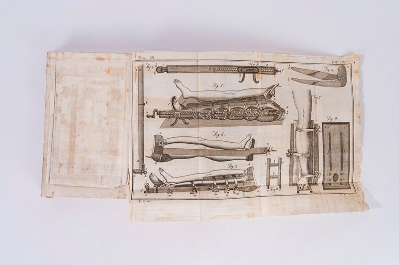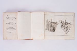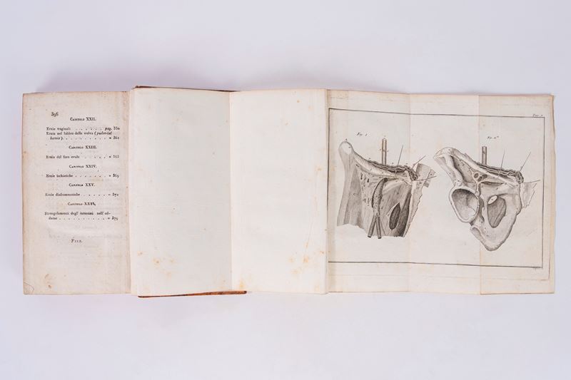 Napoli, dai torchi di Luca Marotta, 1817. In-8°; 3 tomi legati in 2 vol.; leg. coeva in mezza pelle testa di moro con titolo, filetti e decori in oro al dorso liscio; piatti marmorizzati; tagli colorati a spruzzo verde; pp. XV, (1 b.), 352, (2), 11 c. di tav ripieg.; 296, 6 c. di tav ripieg.; 406, [i.e. 386, per errori di numerazione: la p. 149 dovrebbe essere la 129], 10 c. di tav. ripieg.; al primo vol. antip. calc. con ritratto dell'autore disegnato da G. d'Errico e inciso da P. Toro; questo esemplare è rilegato senza l'ultima p. dell'indice del terzo tomo (pp. 405 e 406); le grandi tavole rappresentano apparecchiature, fasciature e strumenti medici in genere. Lievi fioriture e bruniture e qualche segno d'uso e spellatura alle carte di piatti; opera in condizioni generali molto buone. § Insieme nel lotto: Lawrence W., Trattato delle ernie che contiene la descrizione anatomica, i sintomi, l'andamento e la cura di tali malattie, giusta gl'insegnamenti e le scoperte di Cooper, Scarpa, Hey, Travers ed altri di W. Lawrence [...], Milano, presso Paolo Emilio Giusti, 1820. in-12° (182x104 mm), legatura coeva in mezza pelle con carta marmorizzata ai piatti, titolo dorato su etichetta in pelle al dorso, tagli rossi; 2 voll.; Due tavole ripiegate. Tavole incise da G. Cagnoni. Tracce d'uso alla legatura (forti abrasioni alla carta e alla pelle, mancanza di una porzione del dorso al secondo volume). Leggero foxing alle carte e macchie occasionali. Nel complesso, un buon esemplare.