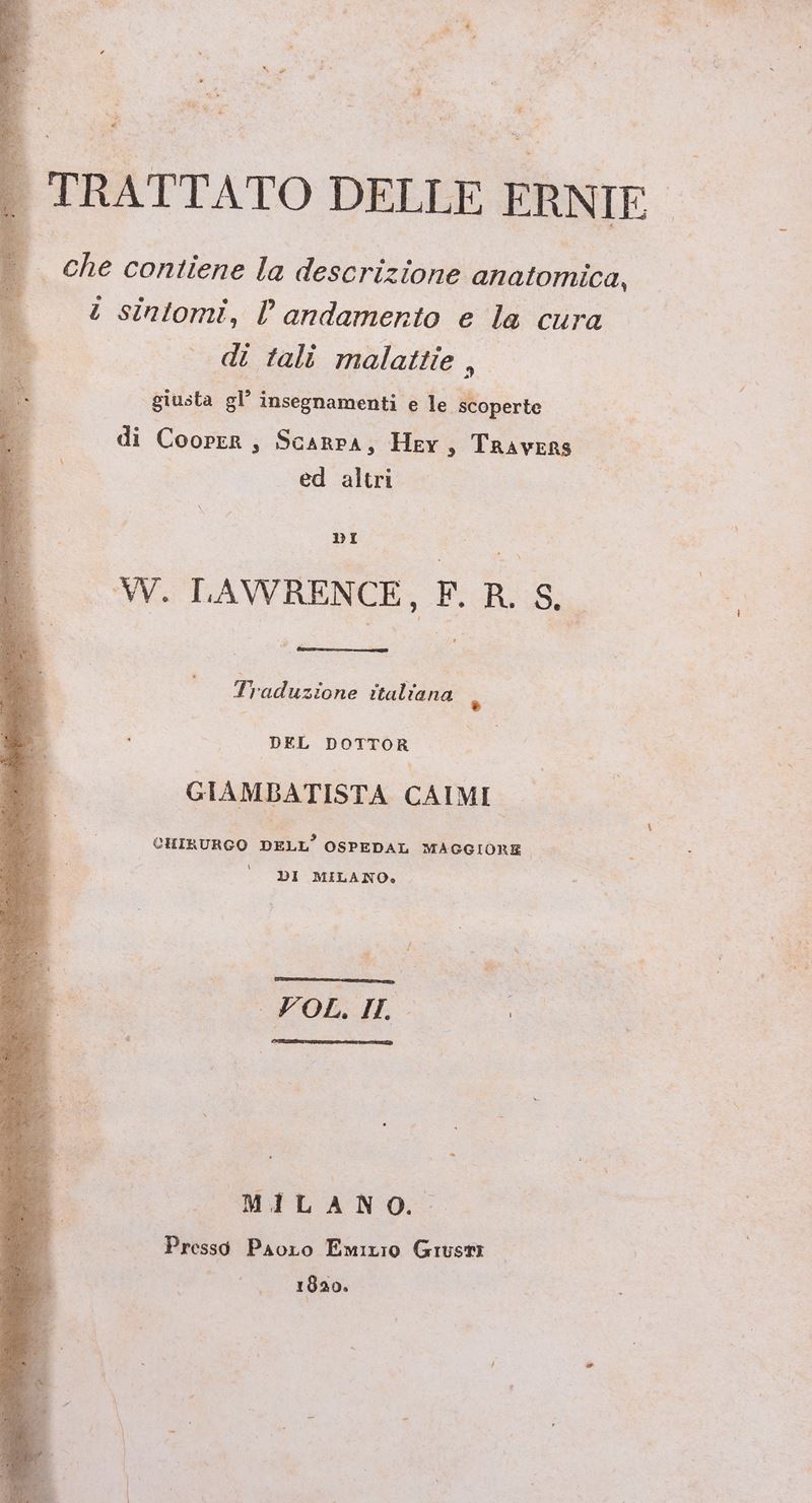 Prima ed unica edizione; opera assai rara, molto interessante, a cura del Prof. Vincenti sulla epidesmologia (termine desueto che indica la disciplina medica che tratta di fasciature, bendaggi e mezzi di sostegno o blocco di parti del corpo). § PRIMA E UNICA EDIZIONE, RARA, DI QUESTO TRATTATO SULLE ERNIE, CHE CONTIENE LA DESCRIZIONE ANATOMICA, I SINTOMI, L'EVOLUZIONE E IL TRATTAMENTO DI TALI MALATTIE, SCRITTO DA WILLIAM LAWRENCE.