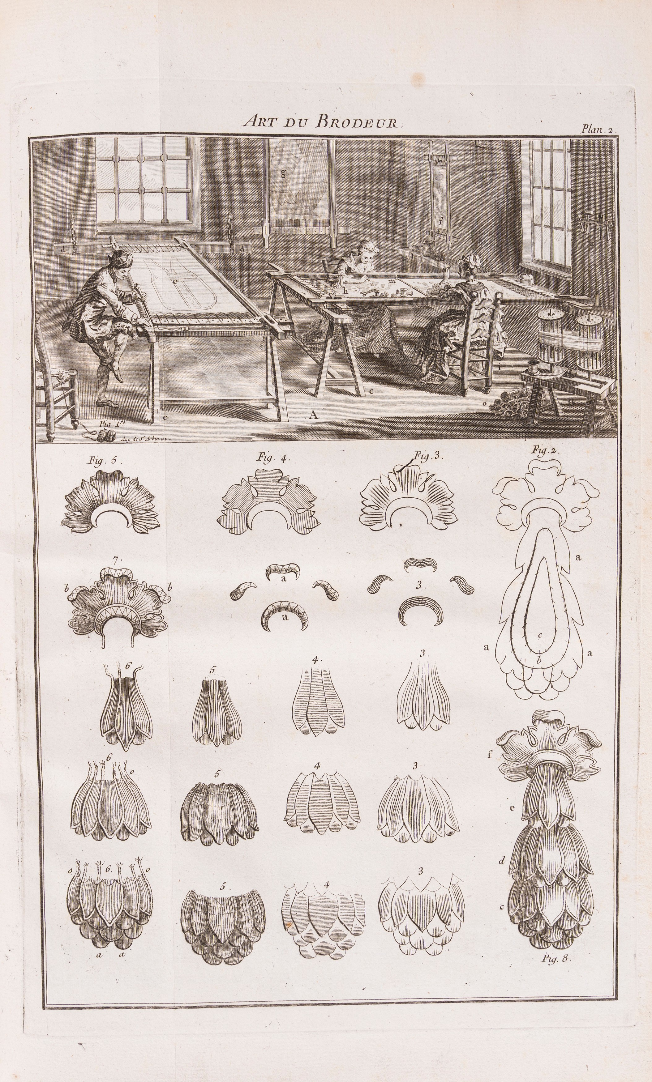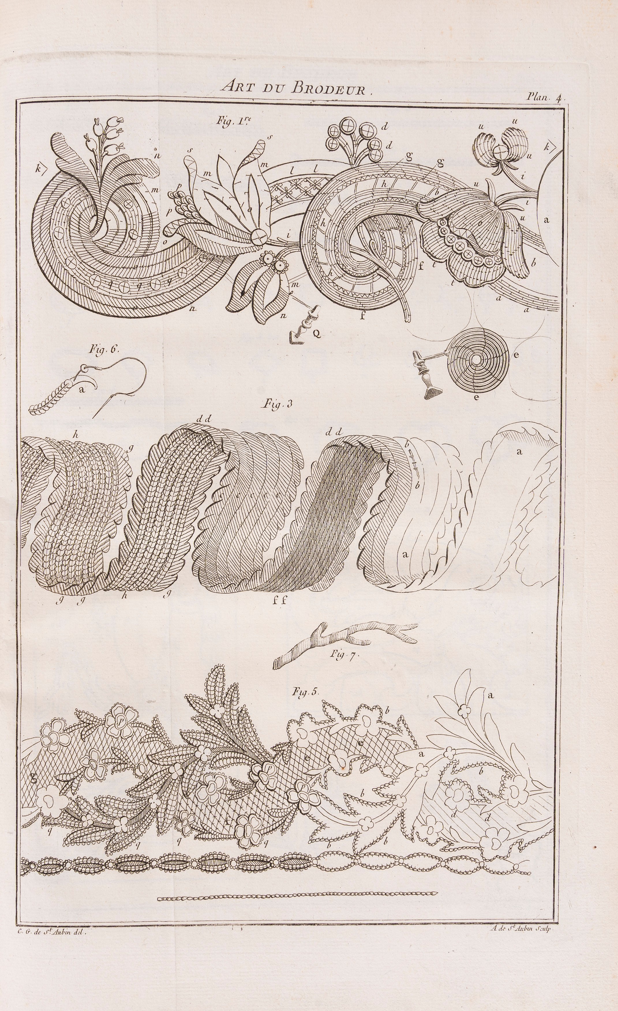 Prima edizione. Splendida opera, parte della raccolta Description des Arts et Métiers, divenne un punto di riferimento imprescindibile per chi si occupava di ricamo. L’autore proveniva da una dinastia di maestri ricamatori legati alla corte di Francia: il padre lavorò per Luigi XIV, mentre lui e i suoi fratelli continuarono la tradizione sotto Luigi XV. Nel volume, Saint-Aubin illustra numerose tecniche – dal rilievo alle varie tipologie di fili, punti e decorazioni – e ribadisce il ruolo centrale del disegno, da cui dipendono equilibrio, proporzioni e armonia dell’opera finita. Ancora oggi, questo lavoro rappresenta una testimonianza insuperata dell’eccellenza e della raffinatezza raggiunte dal ricamo durante il periodo più sfarzoso della moda europea.