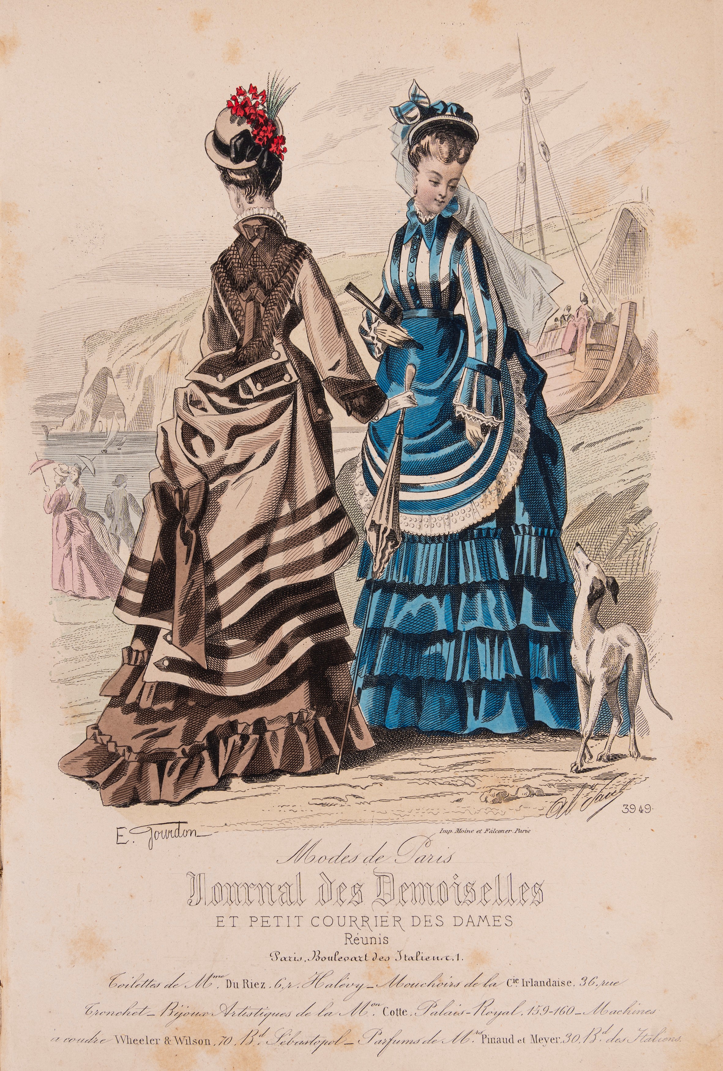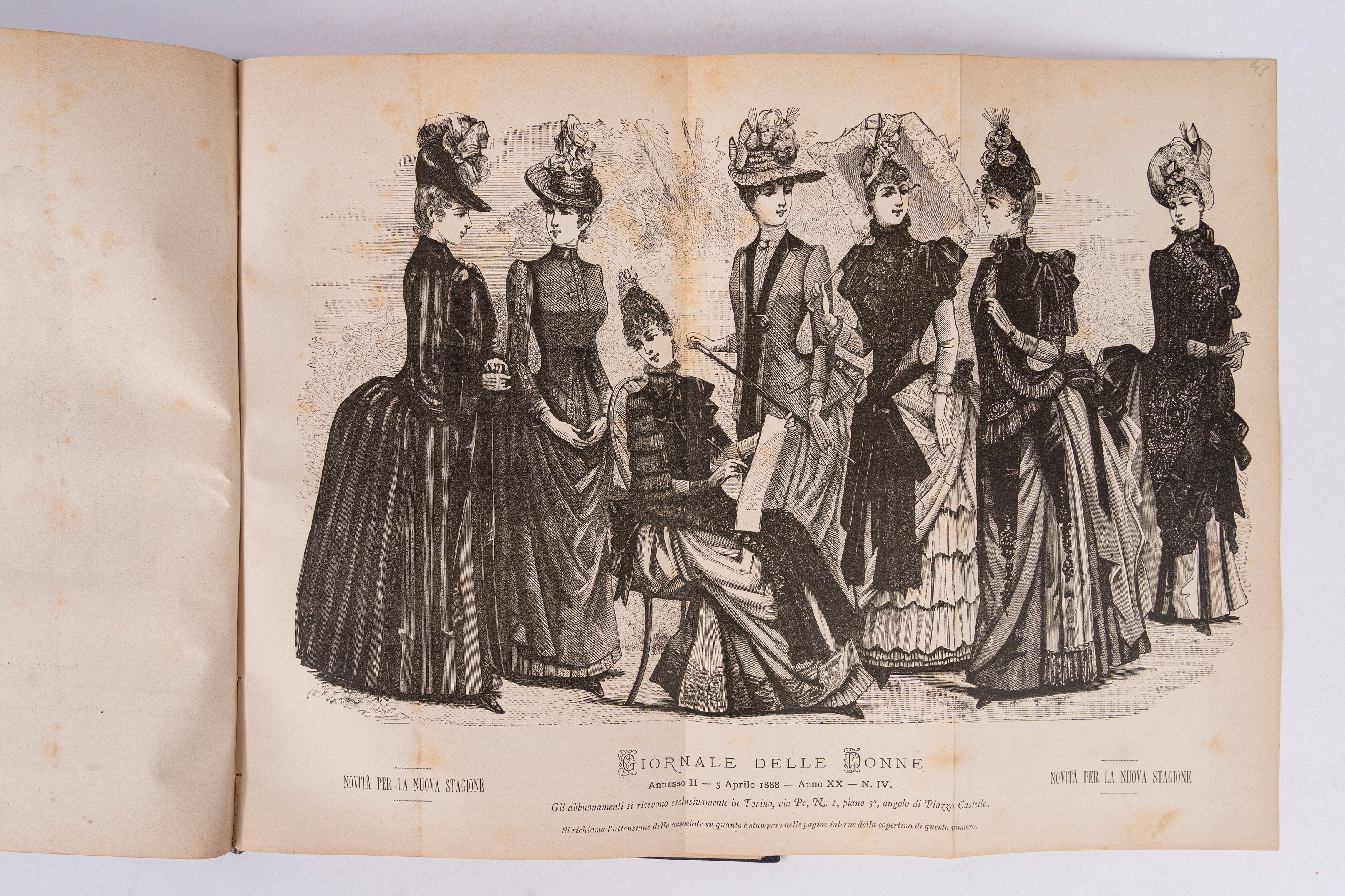 Insieme di 6 volumi in mezzo chagrin e carta decorata dedicate alla moda femminile di fine sec. XIX in cui sono raccolte cromolitografie provenienti dal Corriere delle Dame, Giornale delle Donne e del Journal des Demoiselles datate tra il 1863 e il 1890, qualche lieve fioritura.