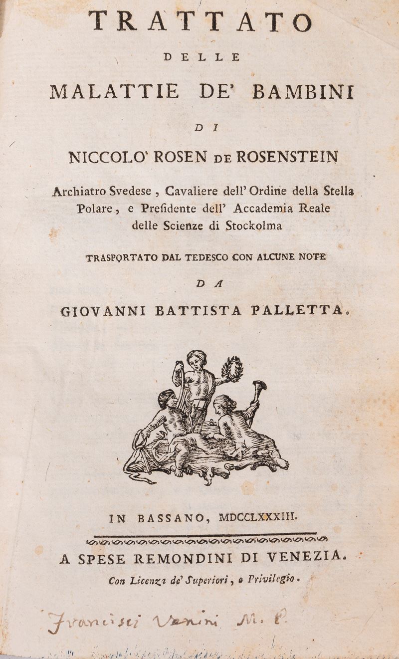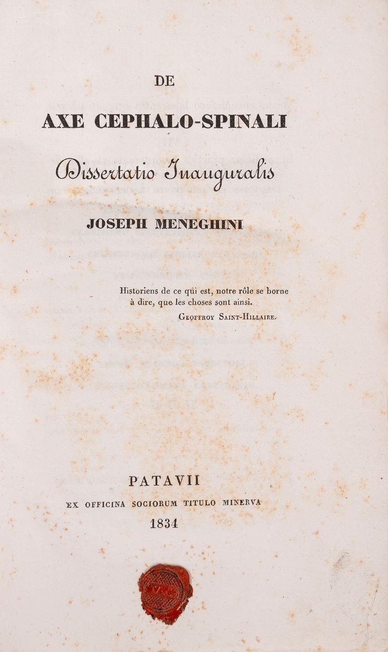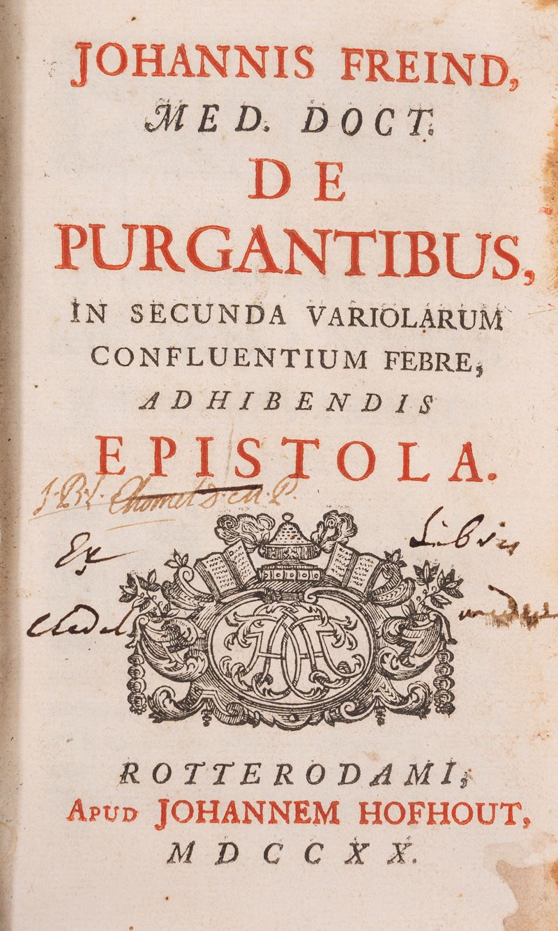 Padova, typis Ioannis Baptistae Pasquati, 1650. In-4°, leg. del XX secolo in piena pelle, titolo in oro al dorso; pp. [8], 80 pagine. Marca tipografica al frontespizio. Iniziali xilografiche. Rare fioriture e bruniture alle carte; esemplare quasi ottimo. § Insieme nel lotto: Freind J., Johannis Freind […] De Purgantibus, in secunda variolarum confluentium febre, ad hibendis epistola, Rotterdam, apud Johannem Hofhout, 1720. In-8°, 154x92 mm, legatura coeva in piena pelle, cinque nervi al dorso, titolo e decori in oro al dorso, carta marmorizzata ai controguardi, tagli spruzzati di rosso, segnalibro in seta; pp. [16], 160. Incisione tipografica al frontespizio. Frontespizio stampato in rosso e nero. Fregi e iniziali in xilografia. Lievi tracce d'uso alla legatura (una piccola abrasione al piatto anteriore). Alcune macchie marginali ad alcune carte, inclusa quella al frontespizio. Per il resto, carte fresche e pulite. Nel complesso, un'ottima copia. § De Rosenstein Rosen, Trattato delle malattie de' bambini di Niccolo Rosen de Rosenstein ..., Bassano, a spese Remondini di Venezia, 1783. In-8°, 170x110 mm, leg. ottocentesca rigida in mezza pelle con angoli e carta marmorizzata ai piatti, tagli colorati di azzurro a spruzzo; pp. VIII, 439, [1]. Fregio xilografico sul frontespizio; testatina xilografica all'inizio del testo. Indicazione di pubblicazione dalla licenza di stampa a carta 2E4r: Giuseppe Remondini. Indicazione d'appartenenza manoscritta in fondo al frontespizio (Francisci Vanini M. P.). Lievi tracce d'uso alla legatura (abrasioni leggere alle carte dei piatti). Fioriture ad alcune carte. Opera in condizioni generali molto buone. § Meneghini Giuseppe, De axe cephalo-spinali dissertatio inauguralis, Patavii, Ex Officina Sociorum Titulo Minerva, 1834. In-8°, 230x150 mm, leg. moderna in mezza pelle e carta marmorizzata ai piatti, titolo a caratteri dorati al dorso; Testo in latino. Sigillo in cera-lacca al frontespizio ed etichetta incollata al verso della prima guardia libera ant. (Ex libris Loris Premuda). Legatura moderna. Lievi fioriture, in particolare al frontespizio. Carte in barbe. Opera nel complesso in condizioni molto buone.