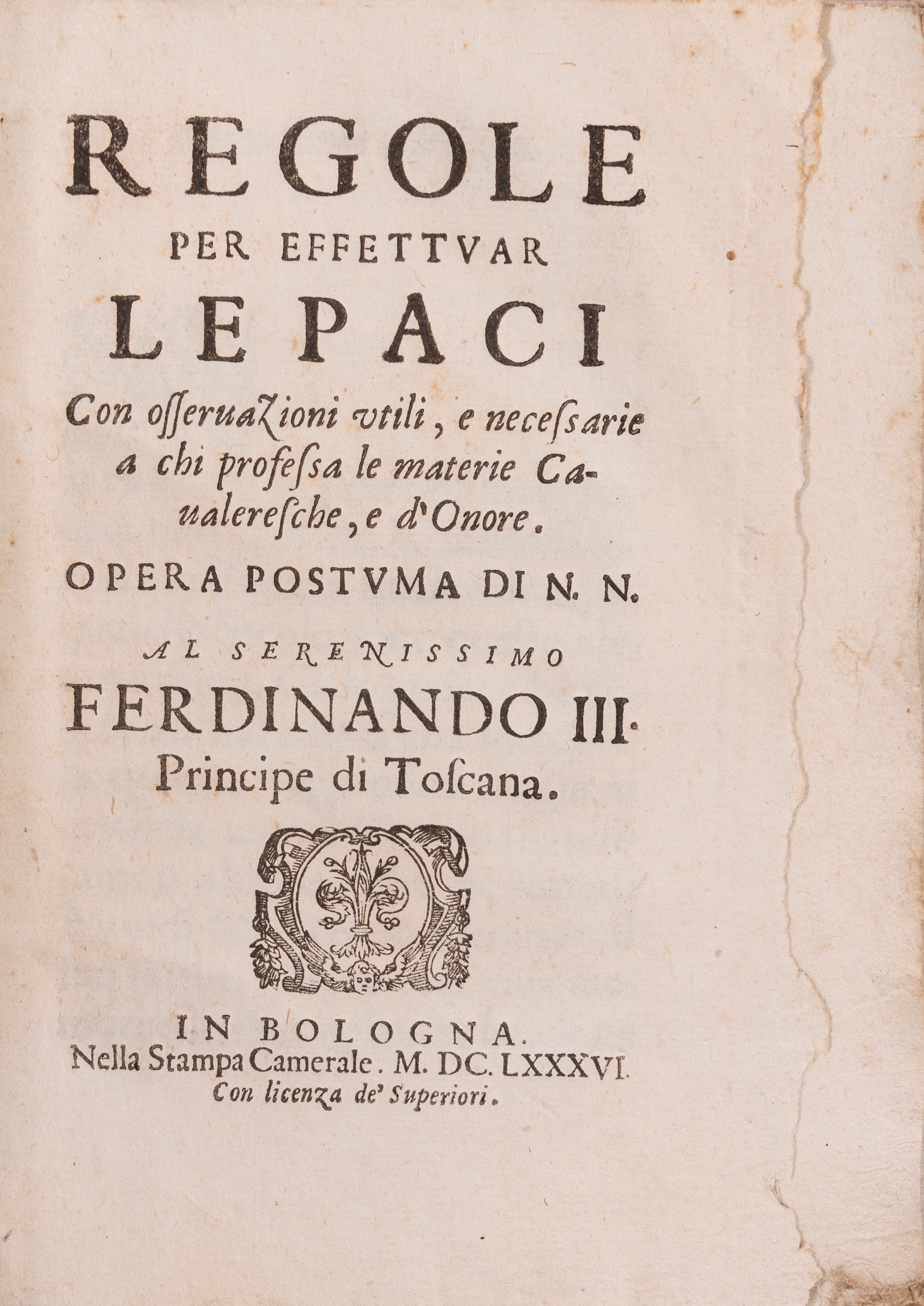 Bologna, Gioseffo Longhi, 1686. In 4°. 4 parti in un volume, ciascuna con proprio frontespizio. Occhietto, fregio xilografico al frontespizio, iniziali incise in legno, qualche rara fioritura e leggera brunitura, legatura coeva in cartonato, qualche piccola macchia e lievi difetti. Ex libris cartaceo alla carta di guardia. § Pepoli, Taddeo. Regole per effettuar le paci con osseruazioni vtili, e necessarie a chi professa le materie caualeresche, e d'onore. Bologna, Stampa Camerale, 1686 . In 8°. Stemma xilografico al frontespizio, fregi xilografici, legatura coeva in cartonato, lievi difetti.