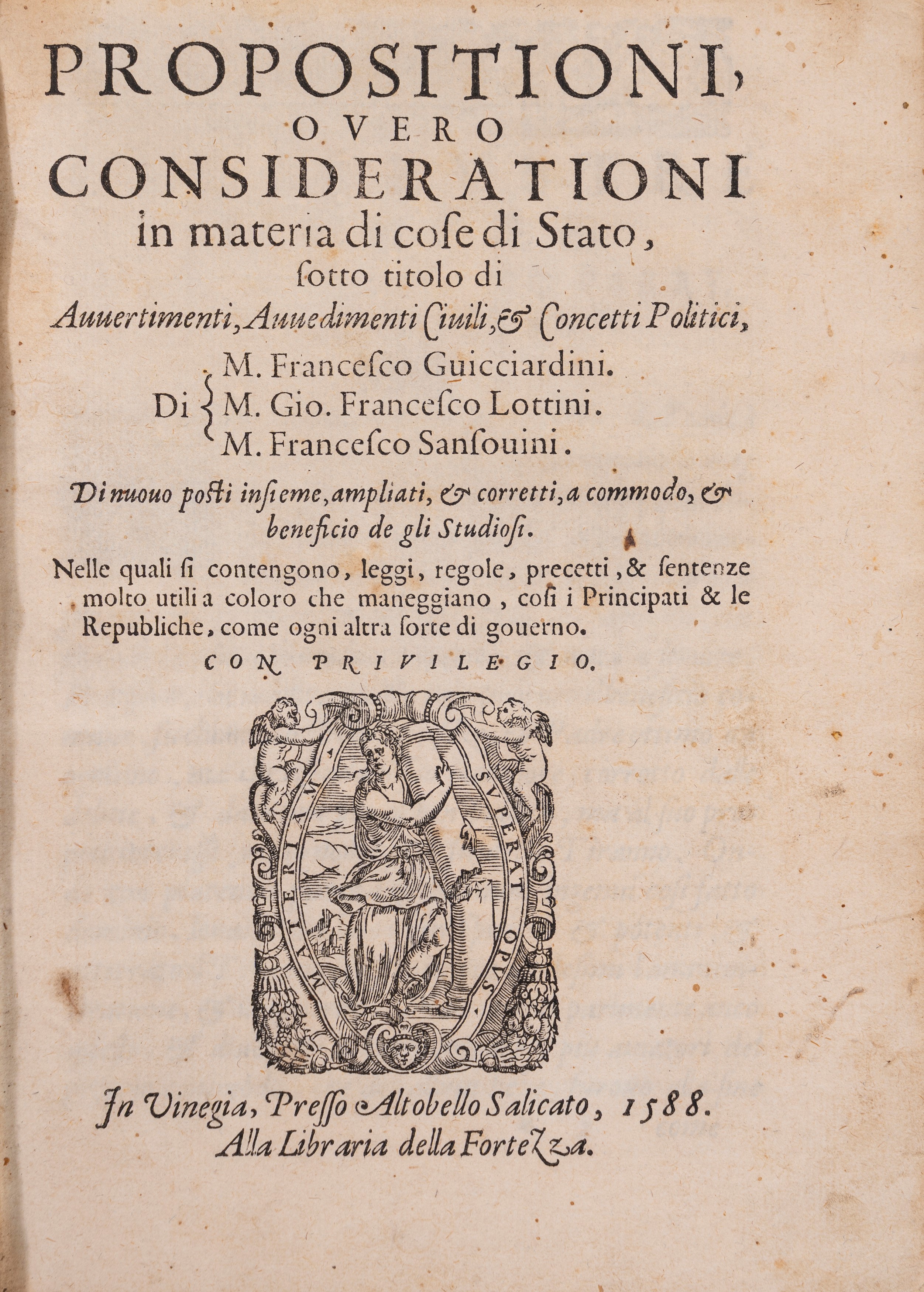 Venezia, Presso Altobello Salicato, 1588. In-8°; legatura del XX sec. in mezzo marocchino verde con percalina verde ai piatti, titolo incisi al dorso a cinque nervi; carte di guardia marmorizzate moderne; vignetta xilografica al frontespizio, testatine xilografiche, iniziali e fregi xilografici istoriati; ritratto xilografico di Guicciardini in una cornice ovale figurata all'inizio degli Avvertimenti politici. Testo in italiano, stampato in corsivo. Le ultime dieci carte sono un po' sporche all'angolo superiore interno; un piccolo forellino di tarlo al frontespizio non compromette il testo. Buon esemplare.