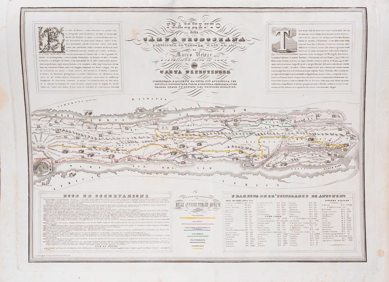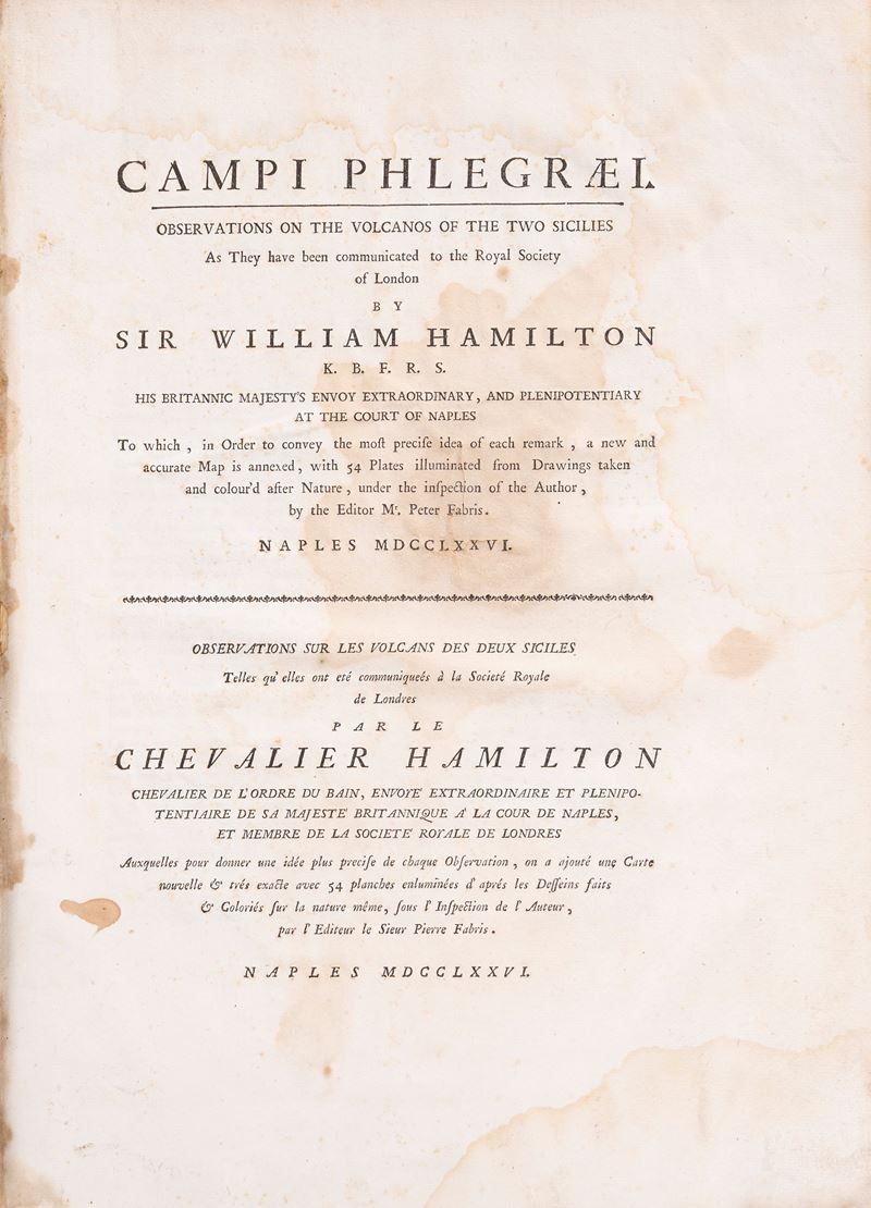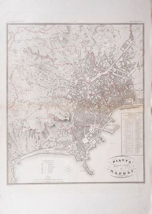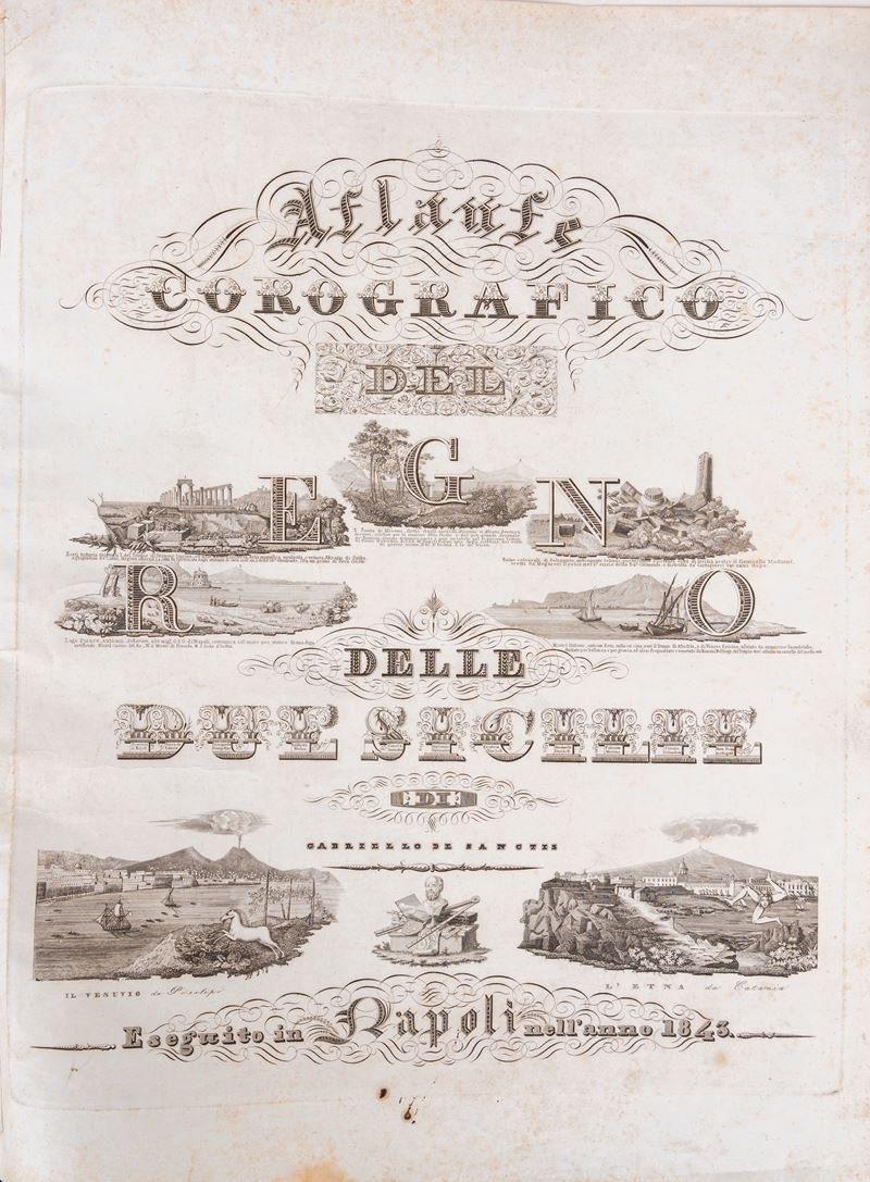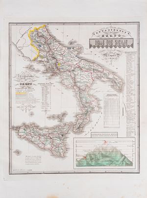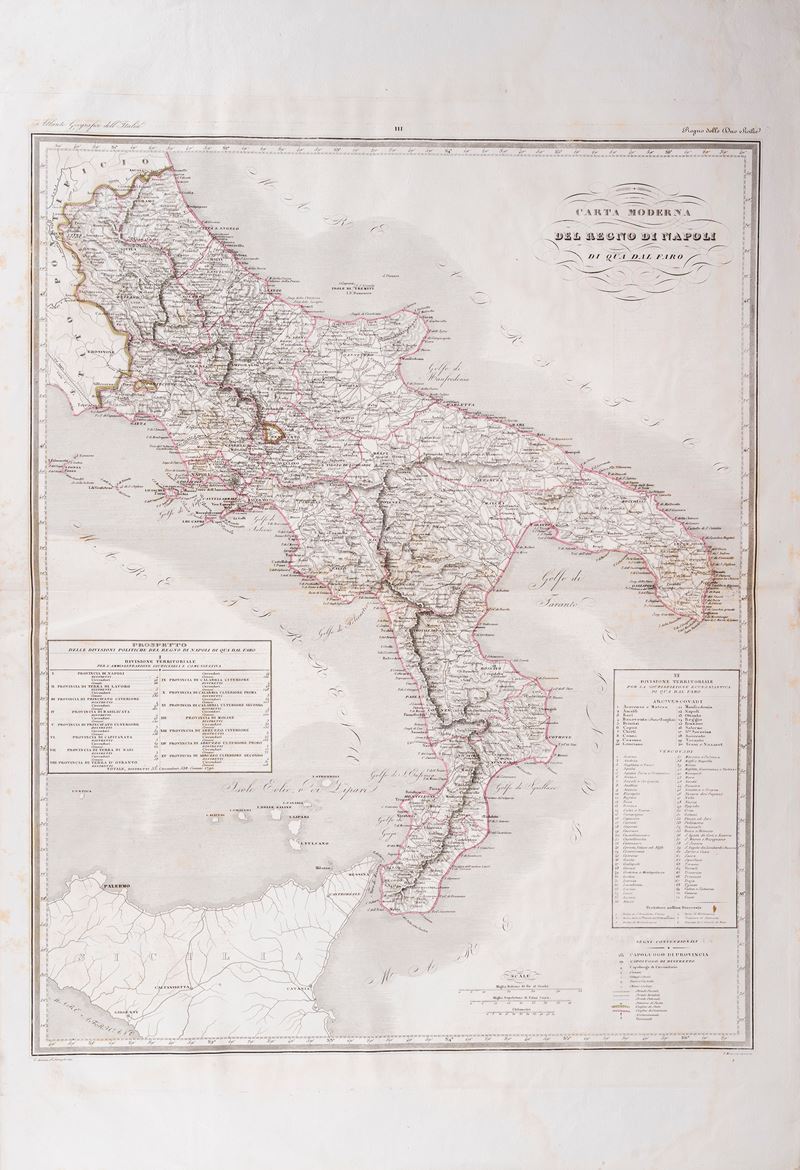 Napoli, 1843. In folio. Frontespizio calligrafico contenente sette vignette di scorci rappresentativi del Regno, tra cui L'Etna da Catania, - Il Vesuvio da Posillipo - Tempio di Giunone ecc., 27 carte geografiche con confini colorati da mano coeva. Legatura in mezza pelle e cartone marmorizzato. Ex Libris applicato sul foglio di guardia recante nome Aldo Giacomo Segre. § Insieme nel lotto: Pianta della città di Napoli, edita da Zuccagni e Orlandini, incisa da Maina G., Incisione in rame acquerellata. Pianta topografica della città. Al lato destro riquadro con indicazione delle principali località. Buon esemplare in ottimo stato di conservazione. 770x594 mm. § Insieme nel lotto: Hamilton W., Campi Phlegraei, Observations on the volcanos of the Two Sicilies, Peter Fabris, Napoli, 1776. In folio. Doppio titolo al frontespizio, testo in inglese e francese. Prime due carte staccate dal dorso, presenza di fioriture e bruniture e marginali aloni di umidità in basso a destra.