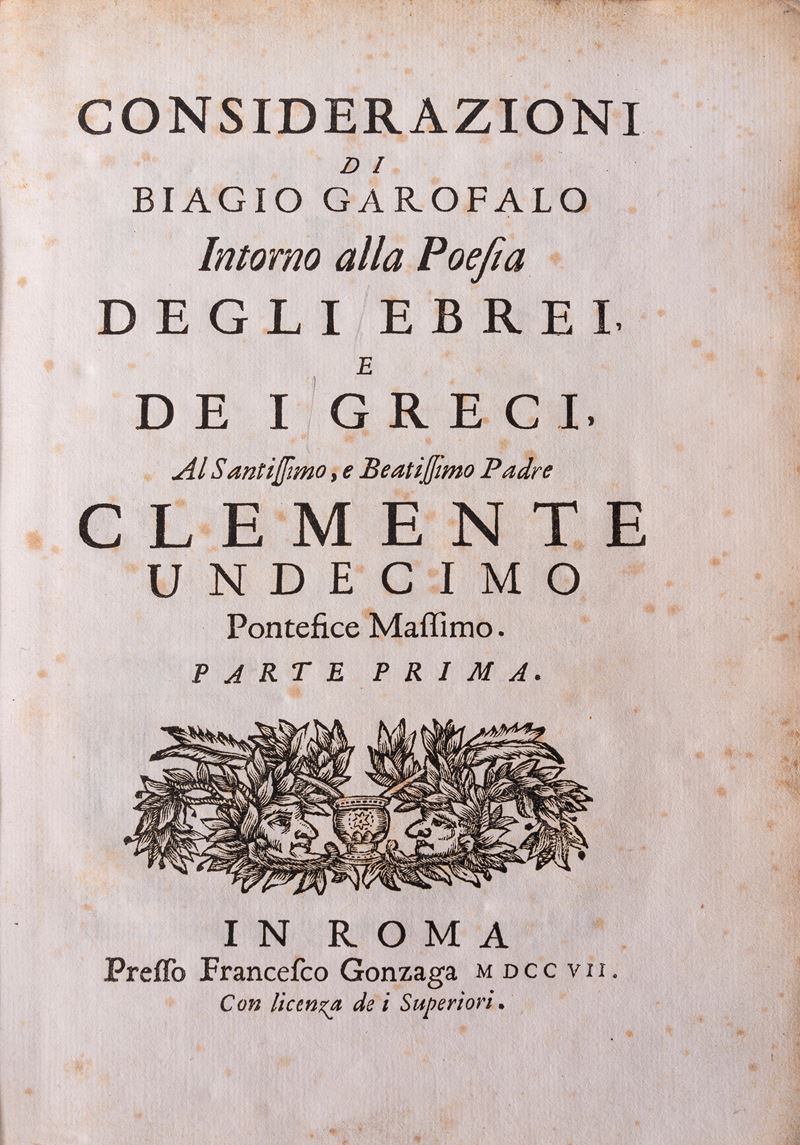 Roma, presso Francesco Gonzaga, 1707. in-4°; legatura coeva con riuso di antica pergamena scritta sul retro, titolo manoscritto al dorso; pp. XVI, 61, [3], 131, [1]. Fregio xil. sul front., iniziali xilografiche. Titolo dell'occhietto: "Della poesia degli Ebrei, e de i Greci". A c. A1r inizia con proprio occhietto "Della poesia degli Ebrei all'eminentissimo sig. cardinale Lorenzo Casoni"; a c. ²A1r inizia con proprio occhietto "Della poesia de i Greci all'illustrissima, ed eccellentissima signora d. Flaminia Borghese". Etichetta d'appartenenza incollata al contropiatto anteriore (Ex libris Frederic North). Lievi segni d'uso alla legatura. Testo marginoso, pagine croccanti con occasionale presenza di foxing.