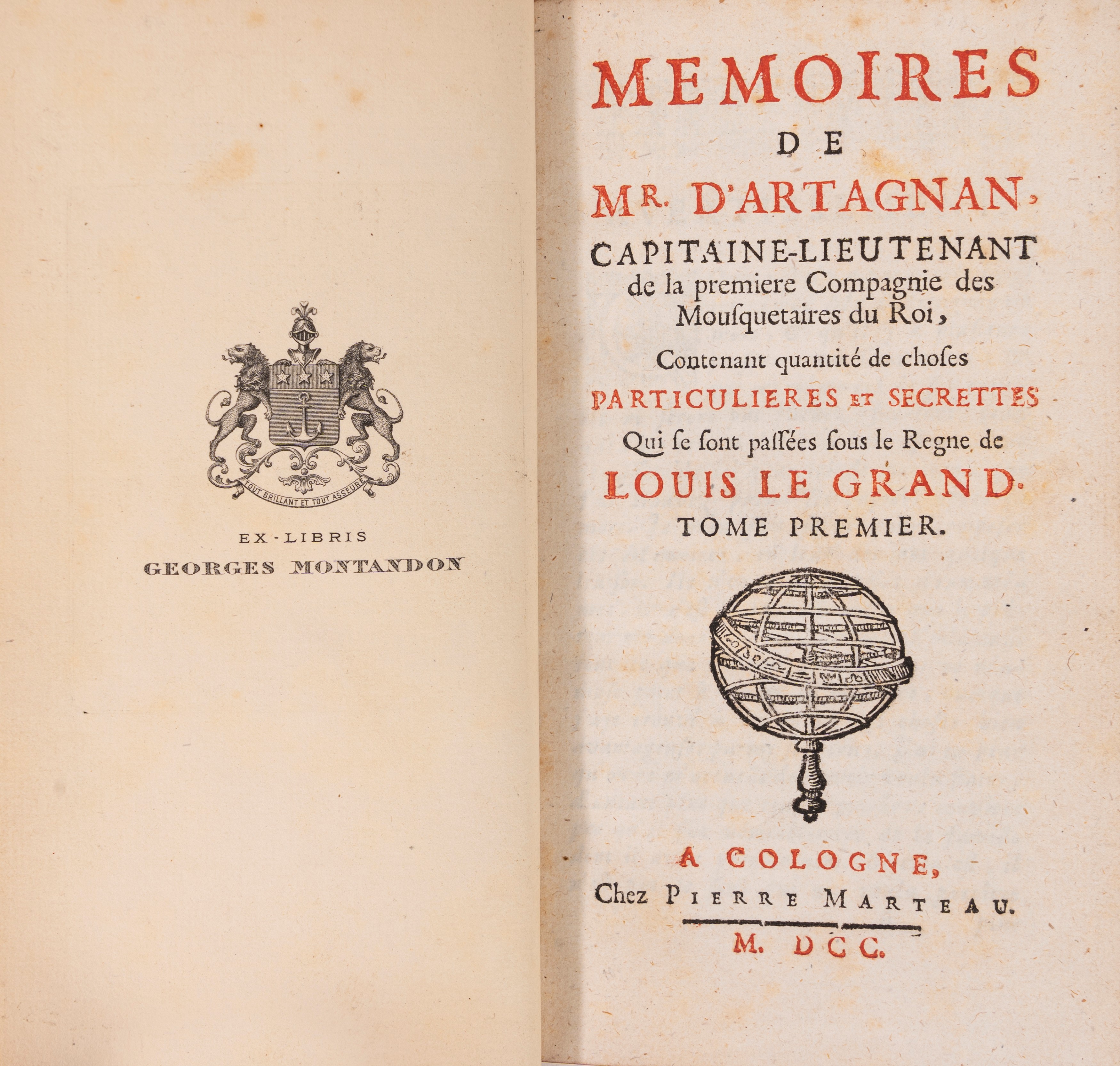 A Cologne, chez Pierre Marteau, 1700. In 8°. 3 voll. Frontespizio in rosso e nero con sfera armillare al centro, splendida legatura in marocchino rosso firmata "de Samblani 1912", tagli in oro. Ex libris Georges Montandon.