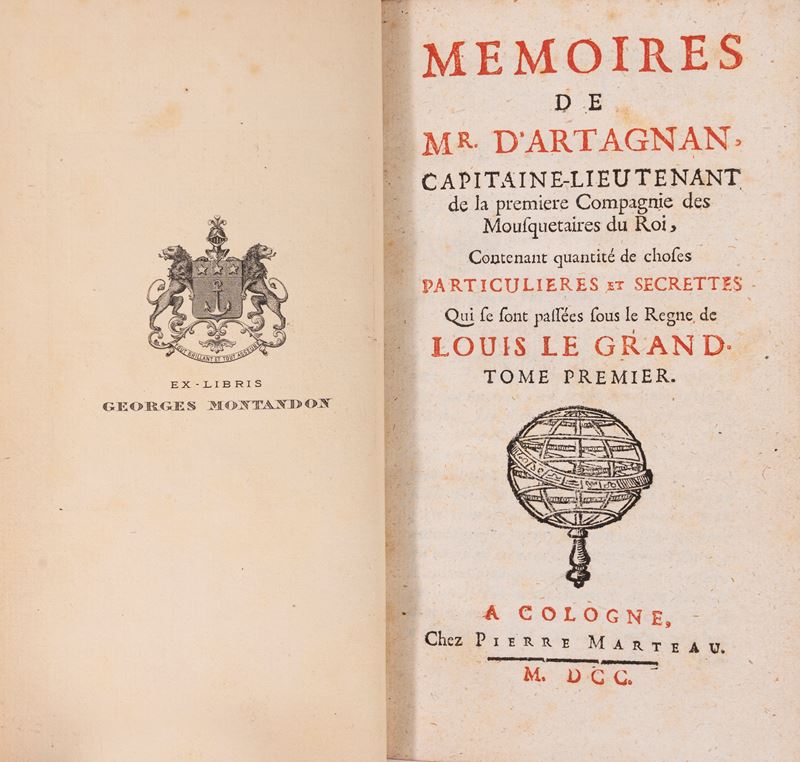 L'OPERA CHE ISPIRO' DUMAS PER I SUOI TRE MOSCHETTIERI Memoires de Mr. D’Artagnan, Capitaine-Lieutenant, 1700