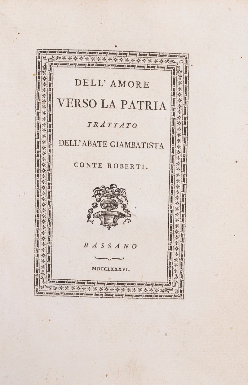 Bassano, Giuseppe Remondini, 1786. In-8°, leg. coeva in pergamena rigida, titolo dorato su tassello in pelle rossa al dorso, tagli spruzzati di rosso. Frontespizio in cornice tipografica. Lievi tracce d'uso.