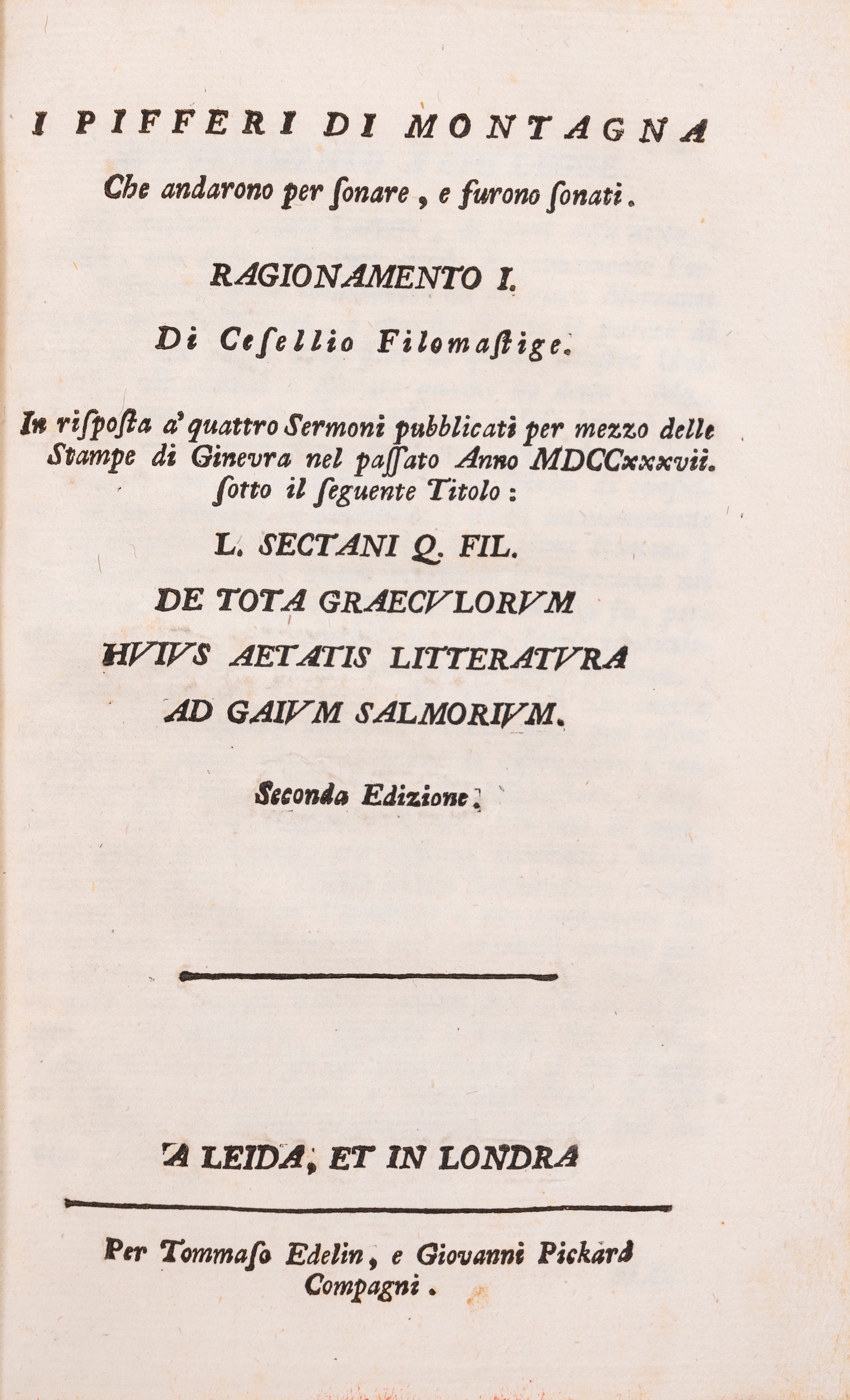 [Bologna, Lelio dalla Volpe], 1738. Legato con Cesellio Filomastige. I Pifferi di montagna che andarono per sonare e furono sonati, Leida e Londra, Tommaso Edelin e Giovanni Pickard, [1738]. Legato con Cordara, Giulio. L. Sectani Q. fil. Ad Gajum Salmorium Sermo quintus. Adcessere M. Philocardii Enarrationes, Corythi : typis Etruscae societatis [Lucca, 1738]. Legato con L. Sectani Q. fil. Ad Gajum Salmorium Sermo sextus. Adcessere M. Philocardii Enarrationes, Corythi [Lucca] typis Etruscae societatis, 1742. Legatura coeva in pelle, fregi in oro al dorso a 5 nervi, tagli a spruzzo rossi, piccole mancanze al dorso. Firme di appartenenza alle carte di guardia