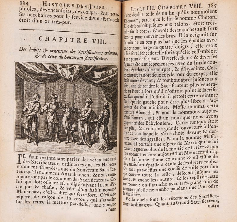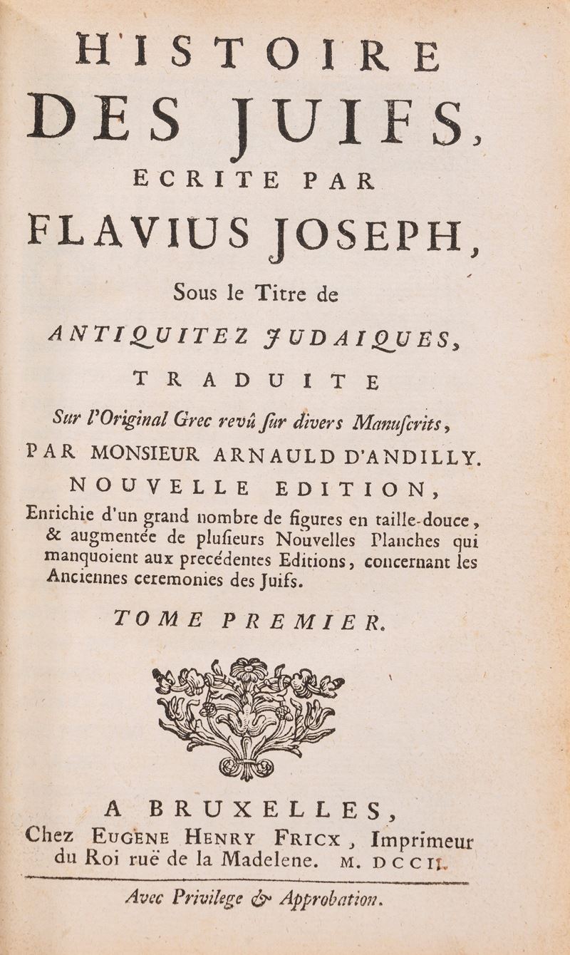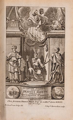 Bruxelles, Eugène Henry Fricx, 1702. In-8° 3 voll.; leg. dell'ottocento, in piena pelle marrone, con dorso liscio a sei compartimenti con filetti e decori dorati, titolo e numero del volume in oro al dorso su tasselli rispettivamente di pelle rossa e verde; carte di guardia marmorizzata ottocentesche; tagli spruzzati in rosso; numerosissime incisioni nel testo raffiguranti luoghi, cerimonie, eventi e personaggi della storia giudaica; preziosa incisione all'antiporta/occhiello con titolo dell'opera (incisa da I. Bap.ta Berterham su disegno di Richard van Orley); bellissime xilografie alle testate, ai capilettera ed ai finali. Indicazioni d'appartenenza, a due diverse persone, su etichette al contropiatto anteriore (una riportante la scritta "Adolphe Goemaere de Menin" e l'altra "ex libris meis Alfred Dorff advocatus bruxellensis"); L'opera è completa, quasi in ottime condizioni generali, fatti salvi alcuni segni d'usura alla legatura in pelle. § Il lotto contiene dello stesso autore Histoire de la guerre des Juifs contre les Romains, Bruxelles, Jean Léonard, 1738. In-8°. 2 voll. Stessa legatura dell'opera [1.], con la quale costituisce un set completo di opere del Flavio, se pur di diverse edizioni (i volumi di quest'opera sono indicati ai dorsi con i numeri 4 e 5); 2 vol.; pp. LXXXIV, (8), 358, (17), (1 b.); 555, (38), (1 b.); numerosissime incisioni nel testo ( cm 6 x 7,5) raffiguranti assedi, rese e conquiste di città, scene di vita, esecuzioni capitali, martirii, battaglie di fanti e di cavalieri; bellissime xilografie alle testate, ai capilettera ed ai finali. Prov.: Indicazioni d'appartenenza, a due diverse persone, su etichette al contropiatto anteriore (una riportante la scritta "Adolphe Goemaere de Menin" e l'altra "ex libris meis Alfred Dorff advocatus bruxellensis"); quest'ultima appartenenza è indicata con timbro a inchiostro blu riportante l'indirizzo (Alfred Dorff Avenue de la Toison d'or 67 Bruxelles).