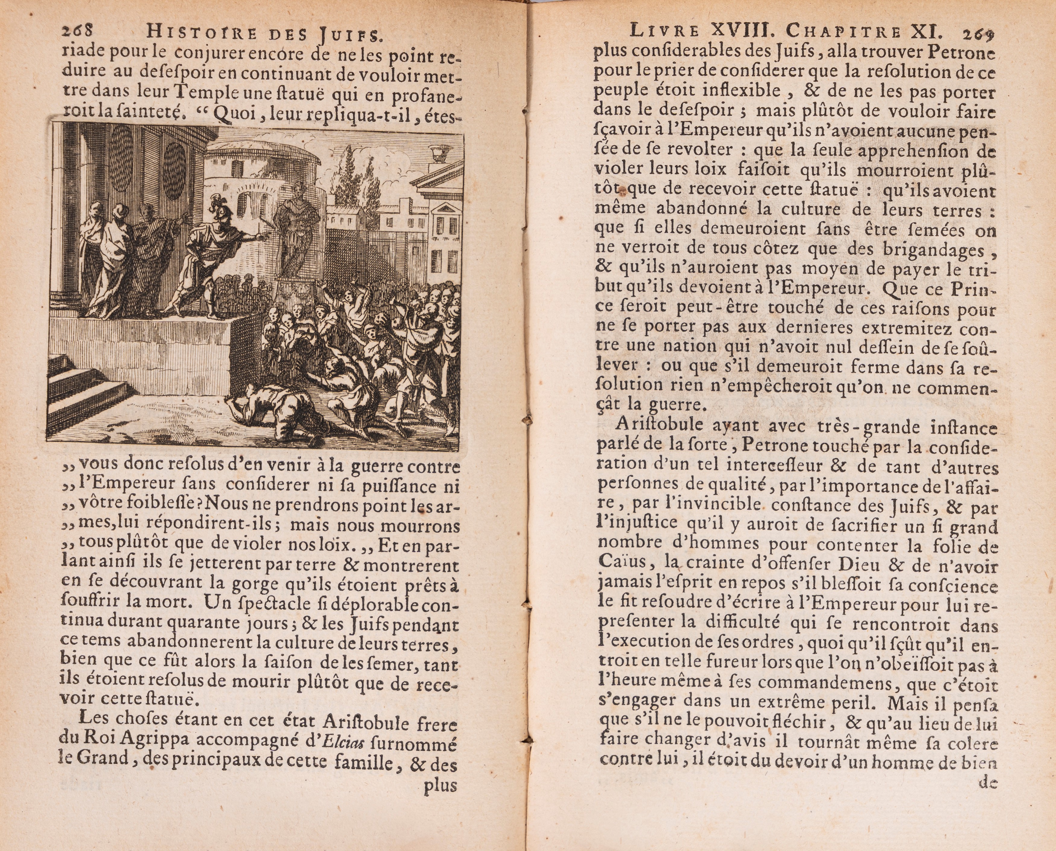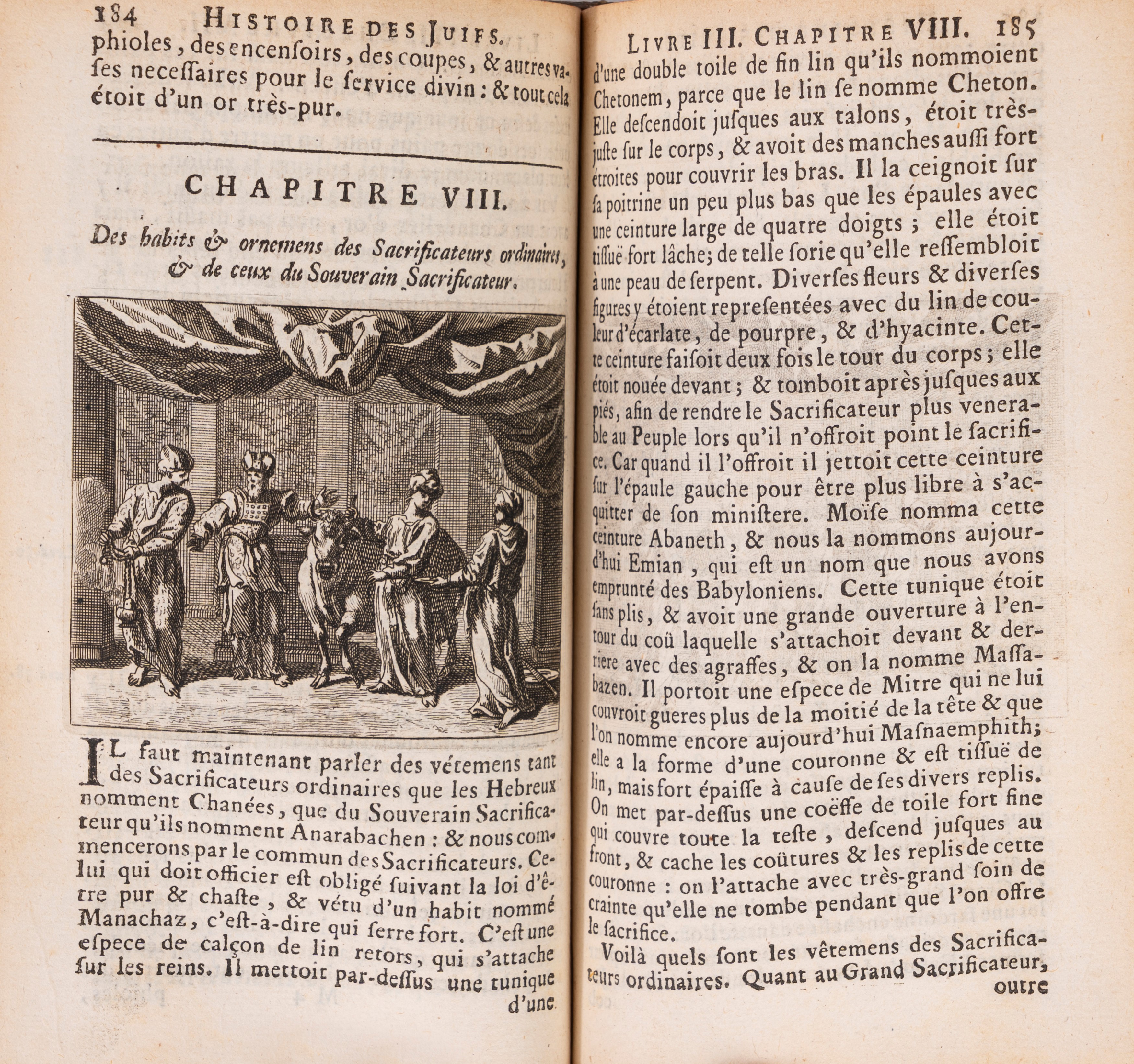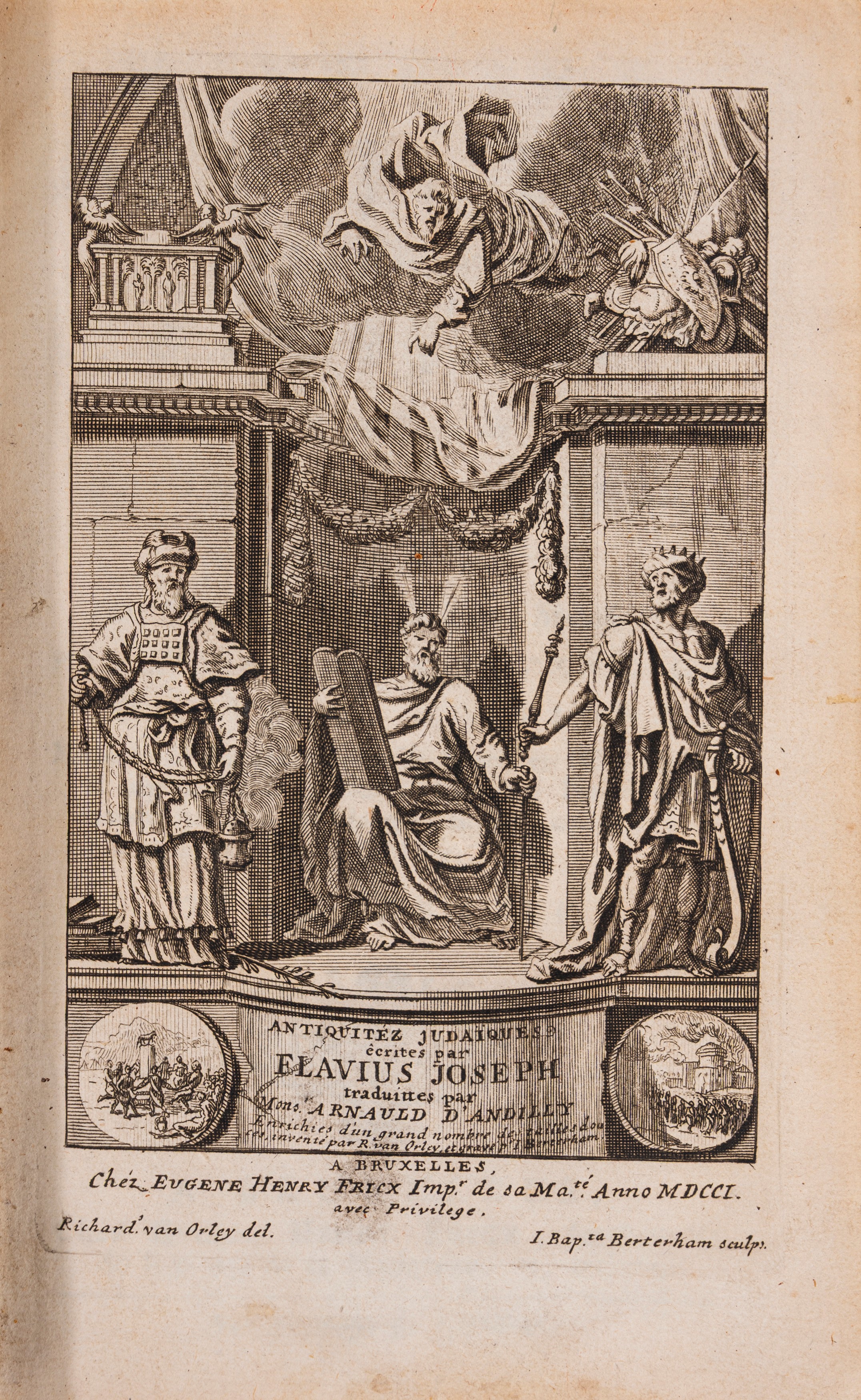 I opera: Si tratta di una preziosa traduzione, a cura dello scrittore e traduttore francese Robert Arnauld d'Andilly (28 maggio 1589 - 27 settembre 1674), del famoso testo "Antichità giudaiche" (latino: Antiquitates Judaicae), opera dello storico giudeo romanizzato Giuseppe Flavio (ebraico: Joseph ben Matthias; latino: Josephus Flavius; Gerusalemme, 37 circa - Roma, 100 circa), scritta in greco nel 93-94 circa, che descrive la storia degli Ebrei dalla creazione; essa comprende l'avviso ai lettori (Avertissement) del traduttore, quindi la prefazione dell'Autore; in fondo a ciascun volume, dopo il testo è riportata la tavola dei capitoli (indice); inoltre, in fondo al primo vol. c'è l'approvazione (a la Sorbonne, il 29 novembre 1666), la censura (a Bruxelles, il 16 gennaio 1675), l'estratto dei privilegi (a Bruxelles, il 17 gennaio 1675); in fondo al terzo ed ultimo vol., dopo la tavola dei capitoli, c'è la tavola delle materie dei tre volumi.