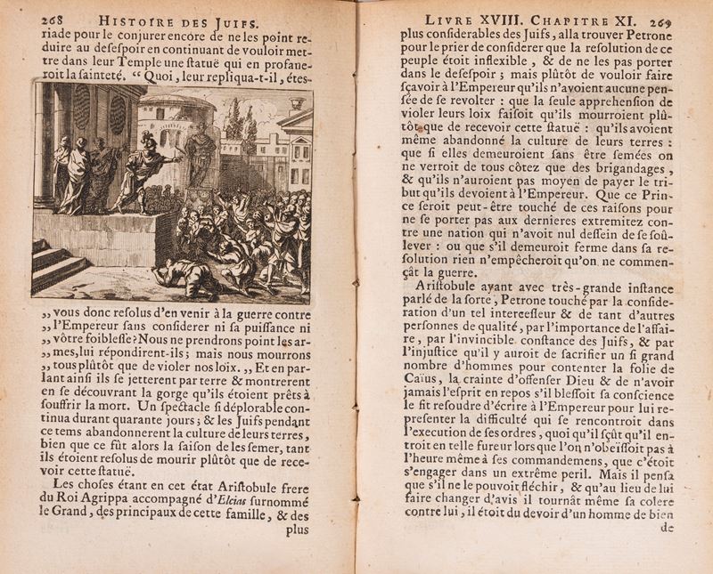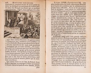 II opera: trattato molto interessante e raro (quest'edizione del Leonard non risulta censita dal Catalogo Unificato delle biblioteche italiane). L'opera è una preziosa traduzione, a cura dello scrittore e traduttore francese Robert Arnauld d'Andilly (28 maggio 1589 - 27 settembre 1674), del famoso testo "Guerre giudaiche" del 66-70 a.C., opera dello storico giudeo romanizzato Giuseppe Flavio (ebraico: Joseph ben Matthias; latino: Josephus Flavius; Gerusalemme, 37 circa - Roma, 100 circa), scritta in greco nel 75 circa; essa comprende l'avviso ai lettori (Avertissement) del traduttore, quindi l'approvazione (Approbation), fatta a Parigi il 19 giugno 1668, con Imprimatur a Bruxelles il 16 gennaio 1675, e l'estratto dei privilegi, sempre a Bruxelles il 27 ottobre 1694; a seguire, la vita dell'Autore, scritta da se stesso e la prefazione sempre dell'Autore; dopo il testo, in fondo a ciascun volume, dopo il testo è riportata la tavola dei capitoli (indice); inoltre, in fondo al secondo ed ultimo vol., dopo la tavola dei capitoli, c'è la tavola delle materie dei due volumi.