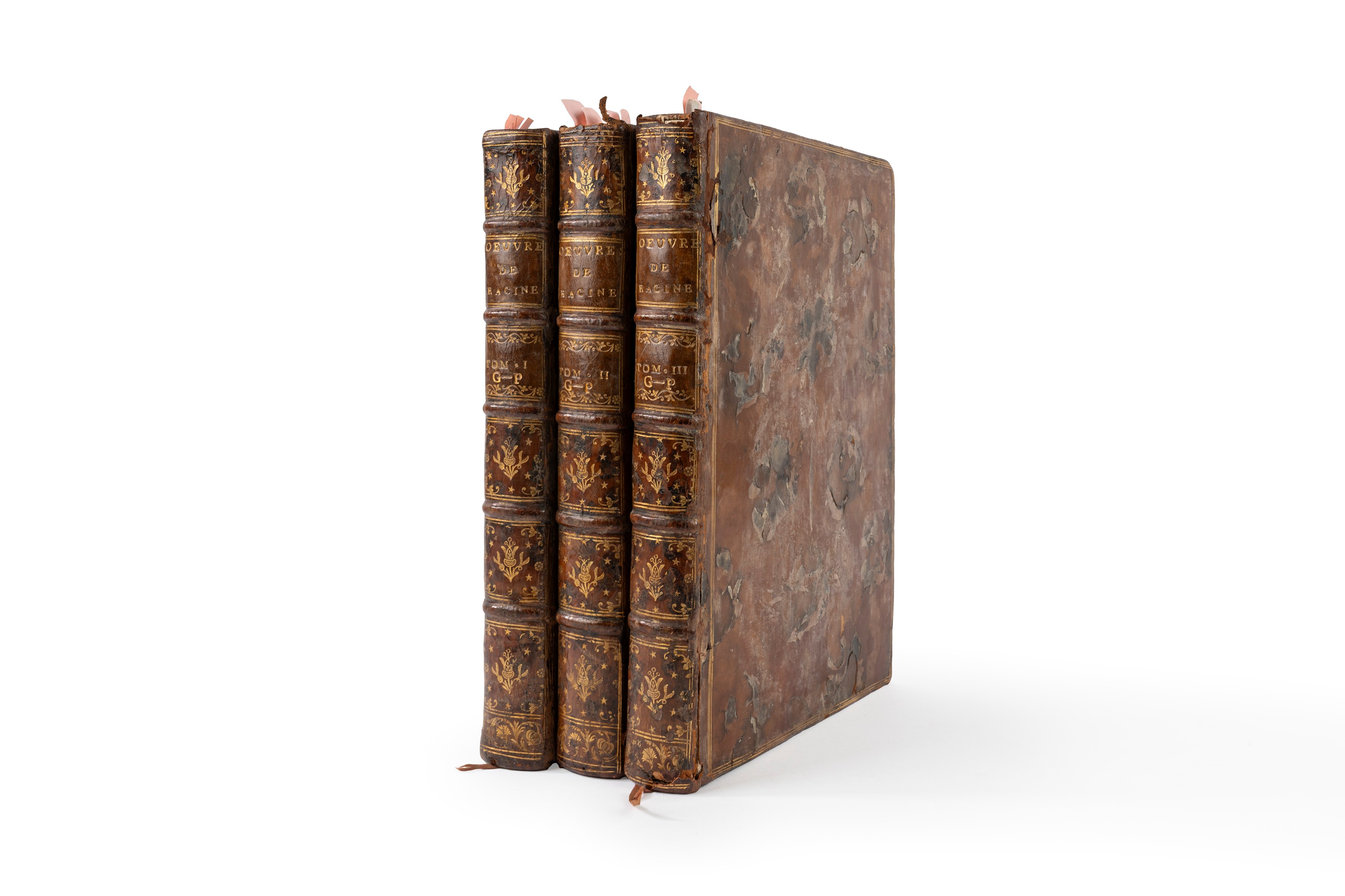 Parigi, s.e. [nel colophon del v. 3.: De l'imprimerie de Le Breton], 1760. In 4°. 3 voll. Al I vol. ritratto dell'Autore in antiporta entro ovale di Daullé, graziose vignette ai frontespizi disegnata da De Seve e inc. (v.1.;3.) da Chevillet, complessivamente 12 tavole a piena pagina, poste a inizio di ciascuna opera, 13 testatine ornate, e 60 culs-de-lampe superbamente incise da Aliamet, Baquoy, Chevillet, Flipart, Legrand, Lemire, Lempereur, Sornique et Tardieu su disegni di Jacques de Seve, qualche arrossatura e leggera brunitura, sporadiche fioriture, legatura coeva in piena pelle, carte di guardia marmorizzate, tagli blu marmorizzati, piatti inquadrati da cornice in oro, titoli in oro al dorso a 5 nervi con fregi, qualche piccola mancanza, lievi difetti. Ex libris cartaceo al contropiatto del Conte Sanminiatelli.