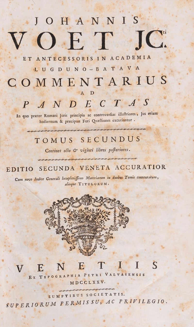Venezia, Ex Typographia Petri Valvasensis, 1775. In-folio. 2 voll. leg. coeva in pergamena, con dorso liscio, titolo a caratteri dorati al dorso; opera in 2 tomi. Vignette ai due frontespizi, testatine, capilettera e fregi xilografici. Leggere tracce d'uso alla legatura (alcune macchie e abrasioni, piccoli strappi in corrispondenza delle cuffie, titoli sbiaditi). Carte abbastanza pulite, ma con presenza di fioriture e alcune macchie.
