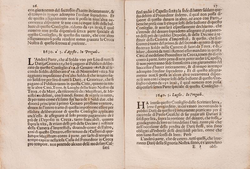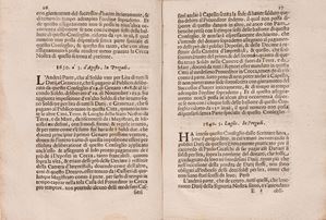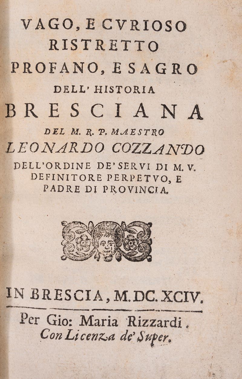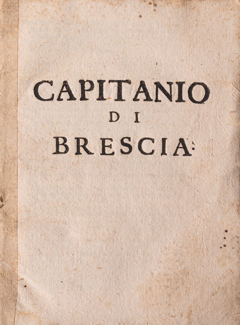 Brescia, Gio: Maria Rizzardi, 1694. In 8°. Fregio al frontespizio, mancante la tavola ripiegata fuori testo, legatura di epoca successiva in mezza pergamena con angoli. § Insieme nel lotto Capitanio di Brescia, s.l, s.e, s.d. In 4°. Lieve gora d'acqua, mancanza all'angolo inferiore di pag. 31, legatura coeva in cartonato, qualche piccola macchia.
