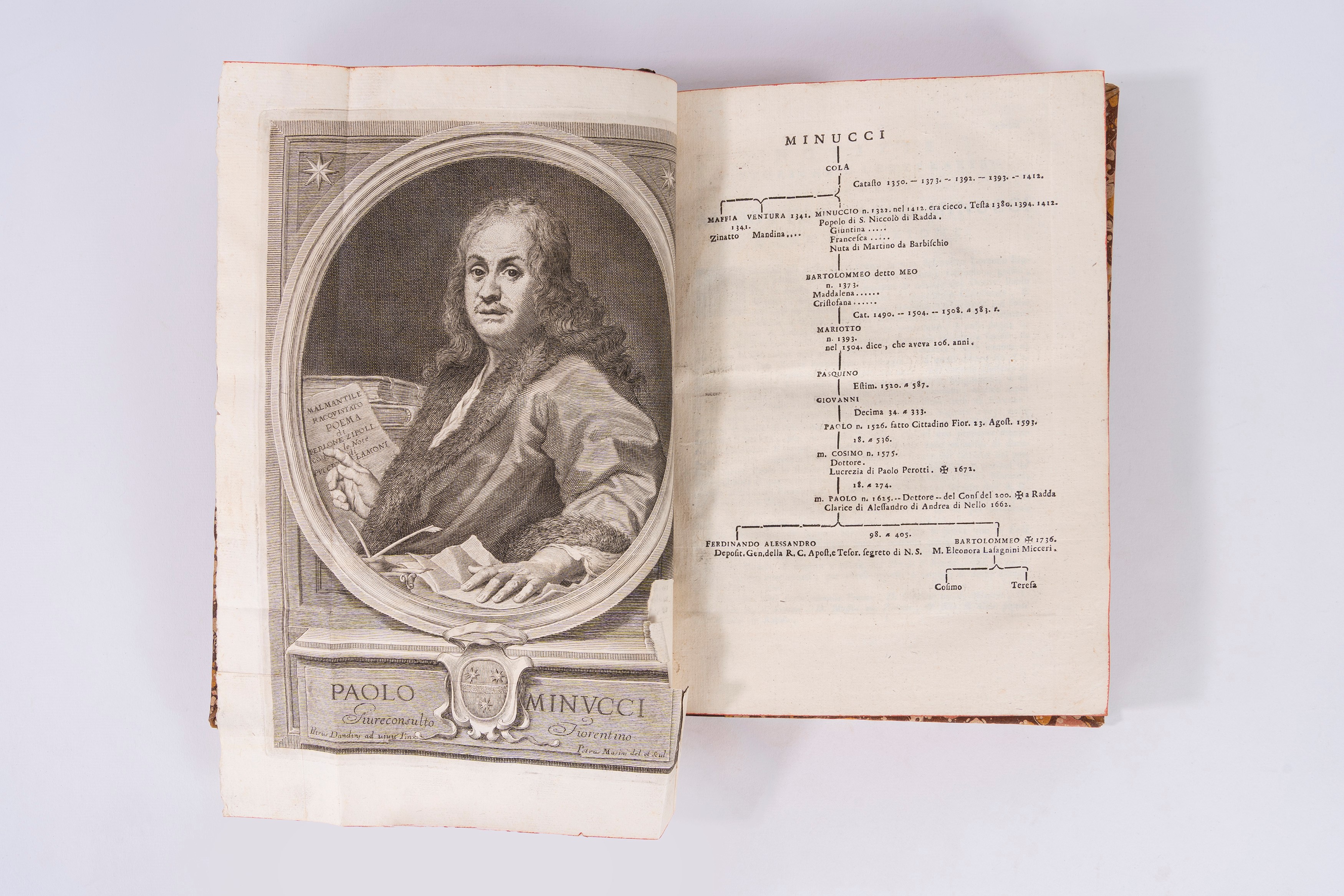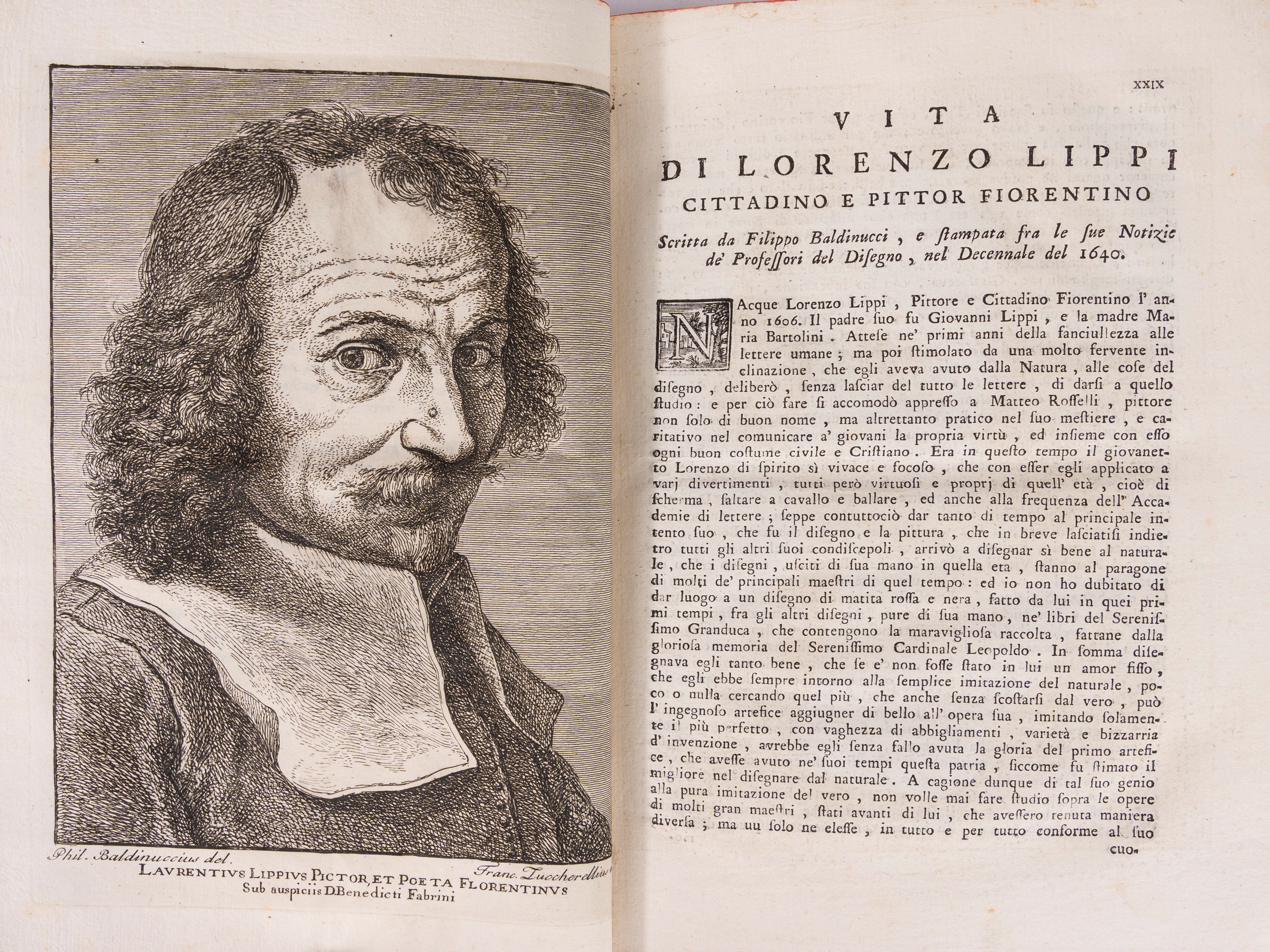 Firenze, Francesco Moücke, 1750. In 4°. 2 voll. Bella antiporta allegorica su disegno di Lippi e incisa da Zuccarelli, una tavola ripiegata con il ritratto di Paolo Minucci, dipinto da Pietro Dandini e disegnato e inciso da Pietro Masini, autoritratto calcografico di Lorenzo Lippi inciso da Francesco Zuccarelli e albero genealogico della famiglia Minucci, frontespizio in rosso e nero con vignetta calcografica, iniziali, testatine e finalini incisi su rame, lieve alone al margine interno degli ultimi fascicoli del II vol., legatura coeva in mezza pelle e carta marmorizzata, tagli rossi.