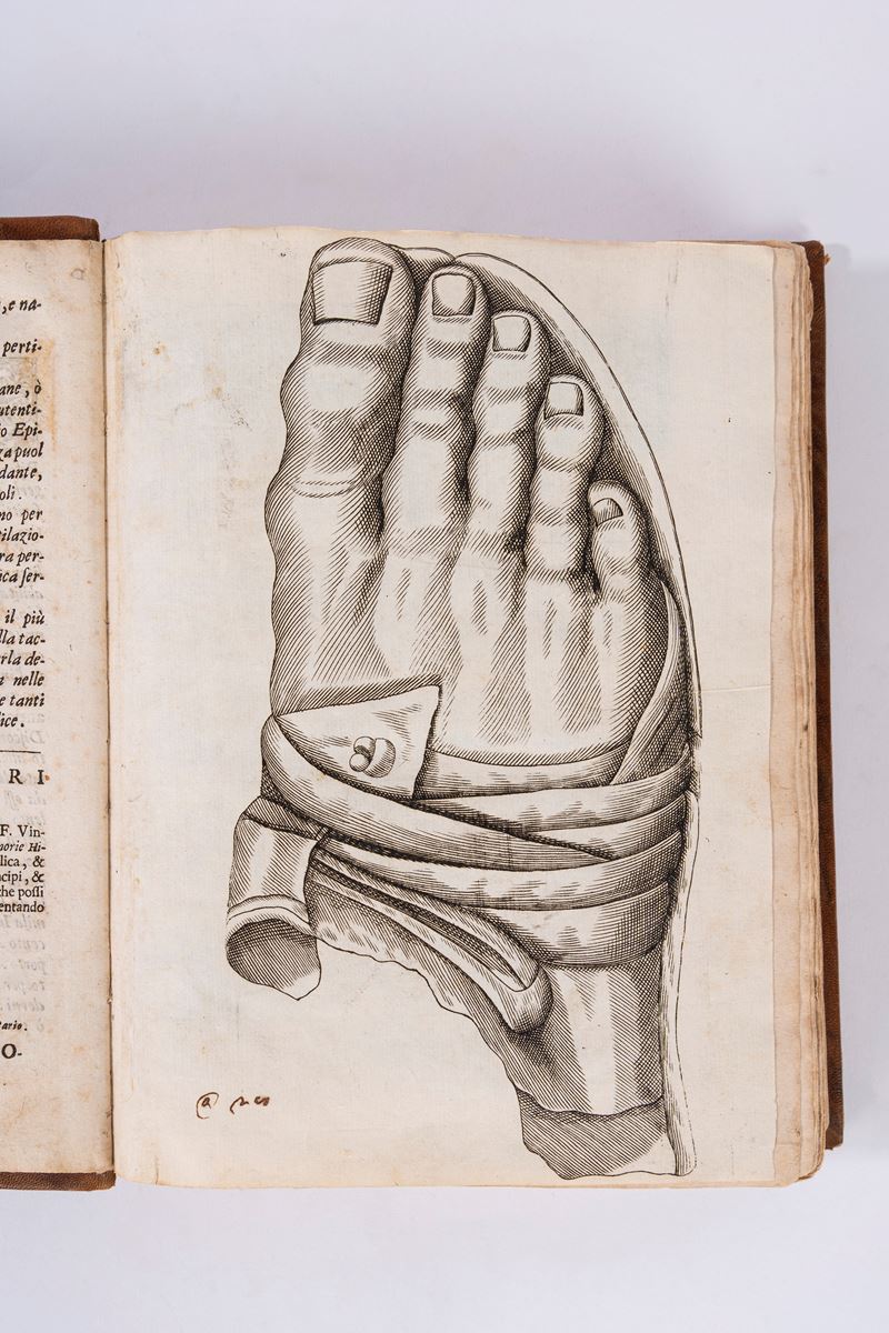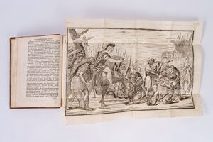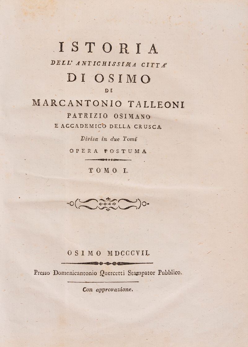 Venezia, Presso Andrea Poletti, 1705. In-4°, legatura moderna in pelle marrone (eseguita a cura di Cantoni Cesena, come da timbro dorato al contropiatto anteriore), con dorso a cinque nervi, impressioni e decori dorati ai piatti e al dorso, titolo dorato impresso al dorso; pp. [8], 470, [2], [3] c. di tav. ill. calcografiche. Marca xil. sul front. (allegoria dell'Italia, con legenda "L'Italia"). Dedica dell'A. al granduca di Toscana Cosimo III. Iniziali, testatine e finalini xilografici. Bianca carta N4. Due grandi tavole più volte ripiegate, due piccole xilografie. In fondo al testo è riportato l'elenco e la storia dei vescovi, dei podestà, degli uomini e delle cose notabili di Osimo. Legatura solida ed in ottime condizioni. Occasionale presenza di macchie e fioriture alle carte. Tracce di vecchi restauri alle tavole ripiegate. § Insieme nel lotto: Talleoni M., Istoria dell'antichissima città di Osimo di Marcantonio Talleoni patrizio osimano e accademico della Crusca divisa in due tomi, Osimo, Presso Domenicantonio Quercetti stampator pubblico, 1807. In-4° grande, 270x194 mm, leg. in mezza pergamena con angoli e carta decorata ai piatti, titolo dorato su tassello in pelle al dorso, tagli rossi; opera in due volumi; pp. XII, 320; 368 [i. e. 268]. Prima ed unica edizione postuma di questa preziosa opera storica, di grande interesse per la storia locale marchigiana, a cura di Marcantonio Talleoni (1721-1806). Etichetta di appartenenza incollata al contropiatto anteriore, con stemma famiglia Gallo (Ex libris Jacobi Gallo) e indicazione manoscritta al verso della prima guardia libera anteriore (Di Cesare Gallo). Presenza di alcune antiche annotazioni manoscritte a margine del testo. Segni d'uso alla legatura (abrasioni alle carte dei piatti e ai tagli, piccoli lavori di tarlo alla pergamena dei dorsi). Carte interne spesse, con testo molto marginoso. Alcune carte sono lente alla legatura. Leggere bruniture alle carte, occasionali fioriture, rare macchie e piccoli aloni. Piccoli lavori di tarlo ai contropiatti.