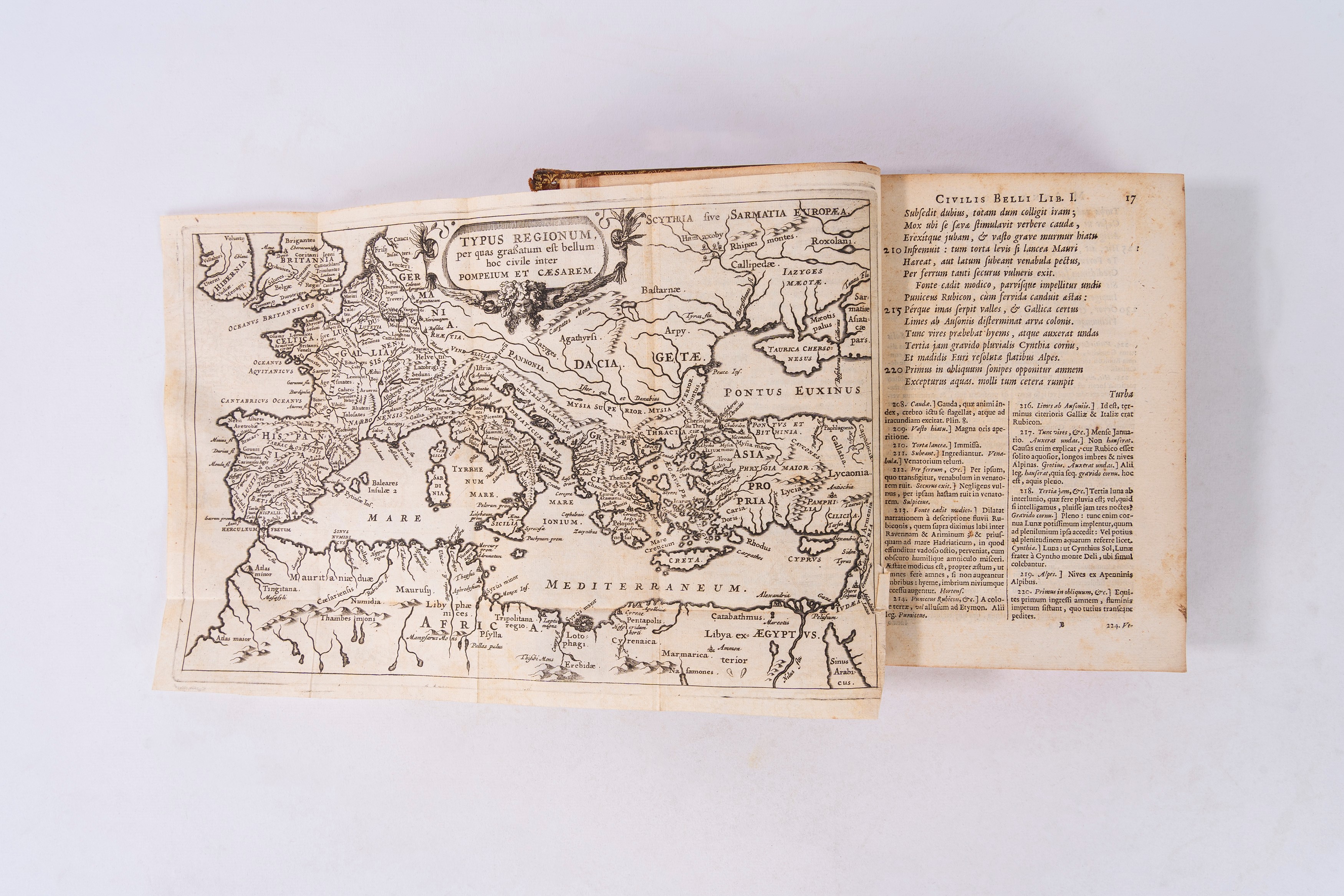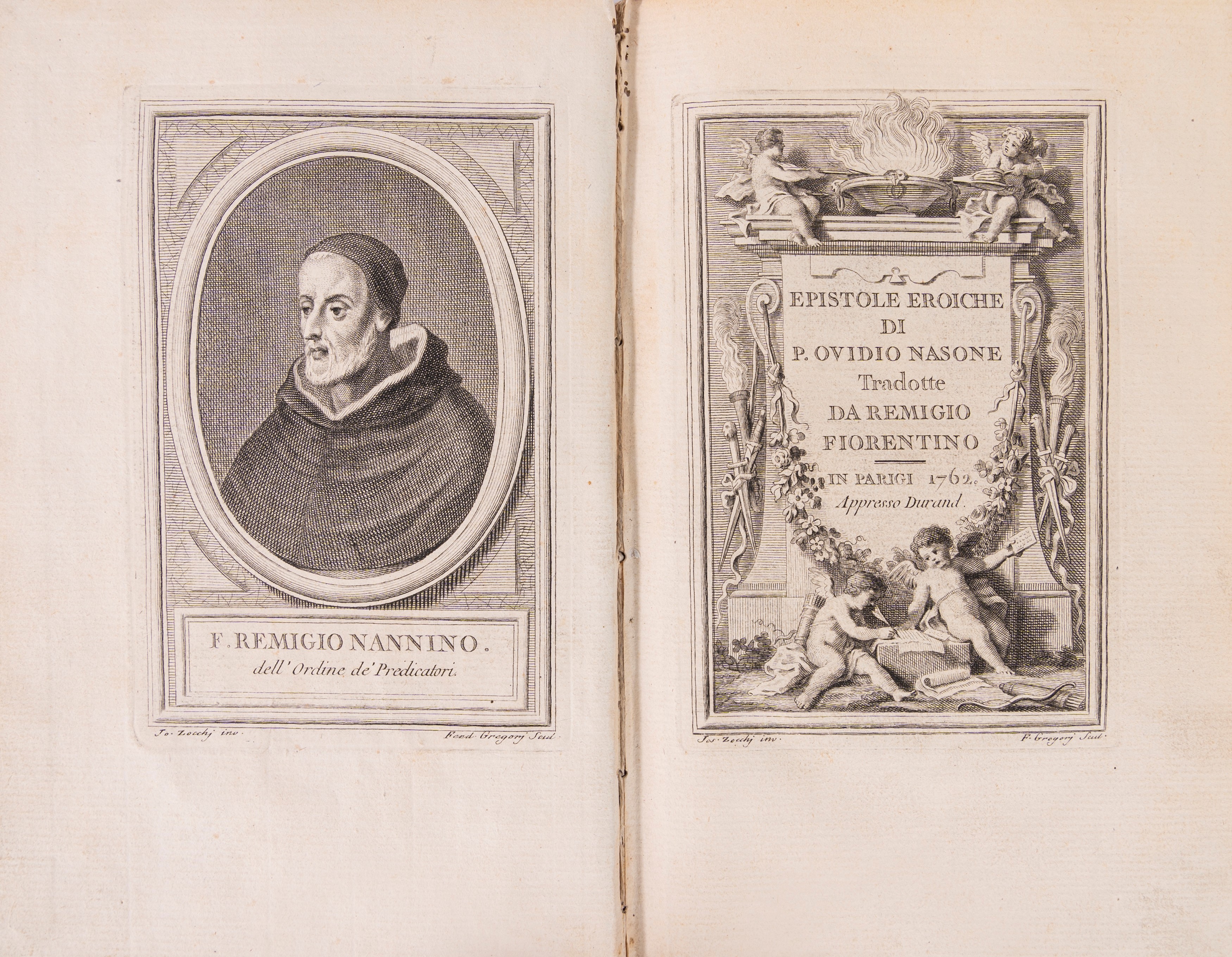 Amsterdam, Franciscum Hackium, 1658. In 8°. Frontespizio inciso da I. Hackius, carta geografica ripiegata, fregi xilografici, lievi fioriture, legatura coeva in pelle, titolo in oro entro tassello al dorso a 5 nervi con fregi, lievi difetti. Ex libris cartaceo al contropiatto. § Nasone, P. Ovidio. Epistole Eroiche, Tradotte da Remigio Fiorentino, Parigi, Appresso Durand, 1762. In 8°. Ritratto di Remigio Fiorentino in antiporta, frontespizio inciso, vignette incise in rame, legatura coeva in pergamena rigida, titolo in oro entro tassello al dorso.
