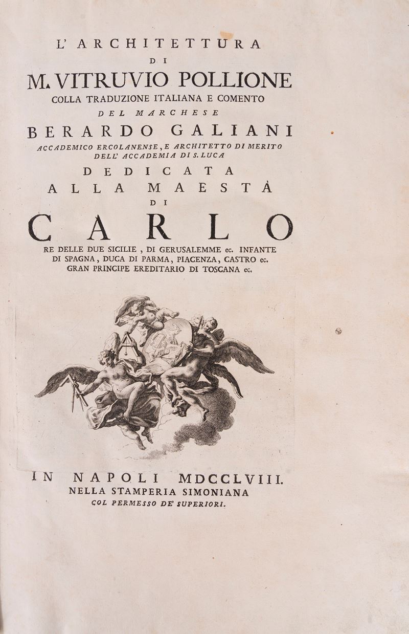 L'architettura di M. Vitruvio Pollione colla traduzione italiana e commento del Marchese Berardo Galiani, dedicata alla Maestà di Carlo re delle due Sicilie., 1758