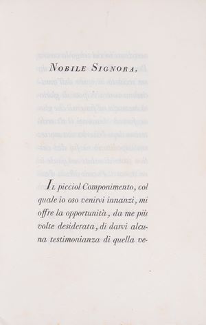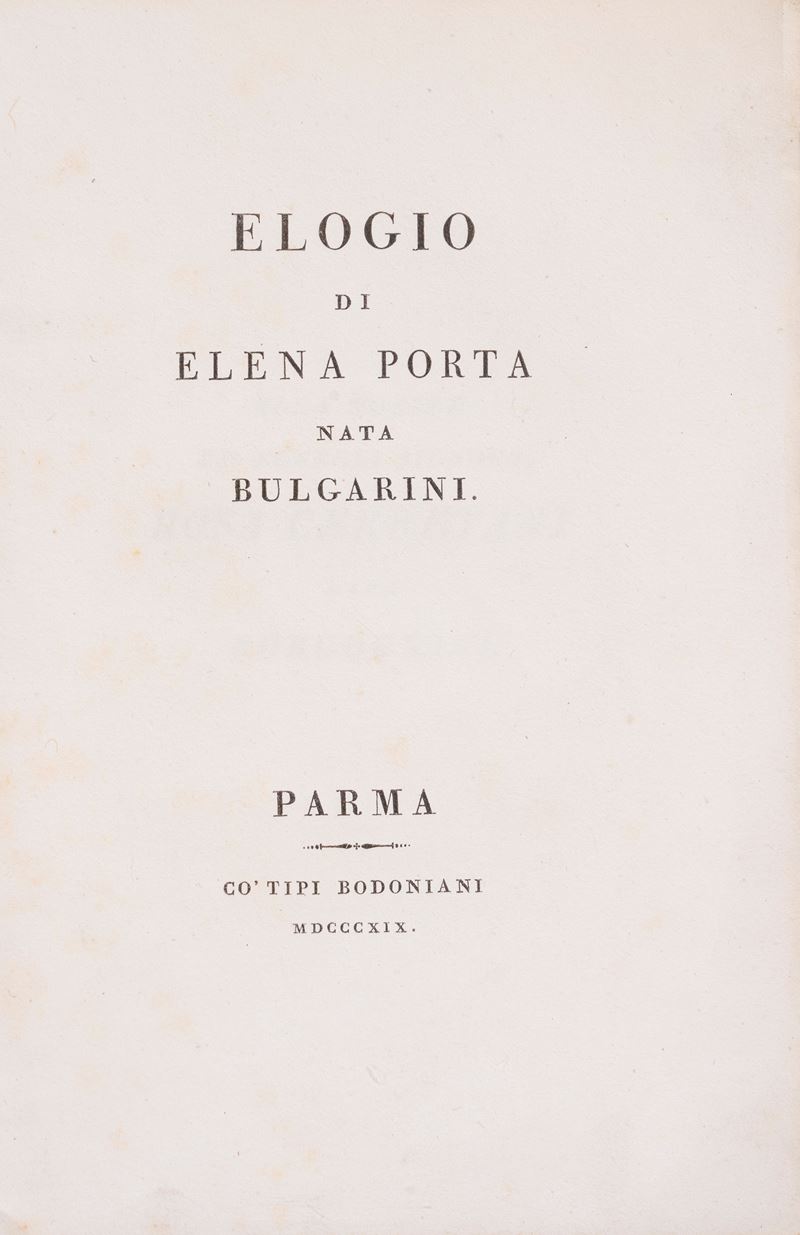 Parma, Co' tipi Bodoniani, 1819. In-8°, leg. in cartonato colorato. Il testo è preceduto dalla lettera dedicatoria dell'Autore a Rosa Cerretani Borgognini. In appendice: Due iscrizioni del chiarissimo P. abate Tonani pertinenti allo stesso soggetto.