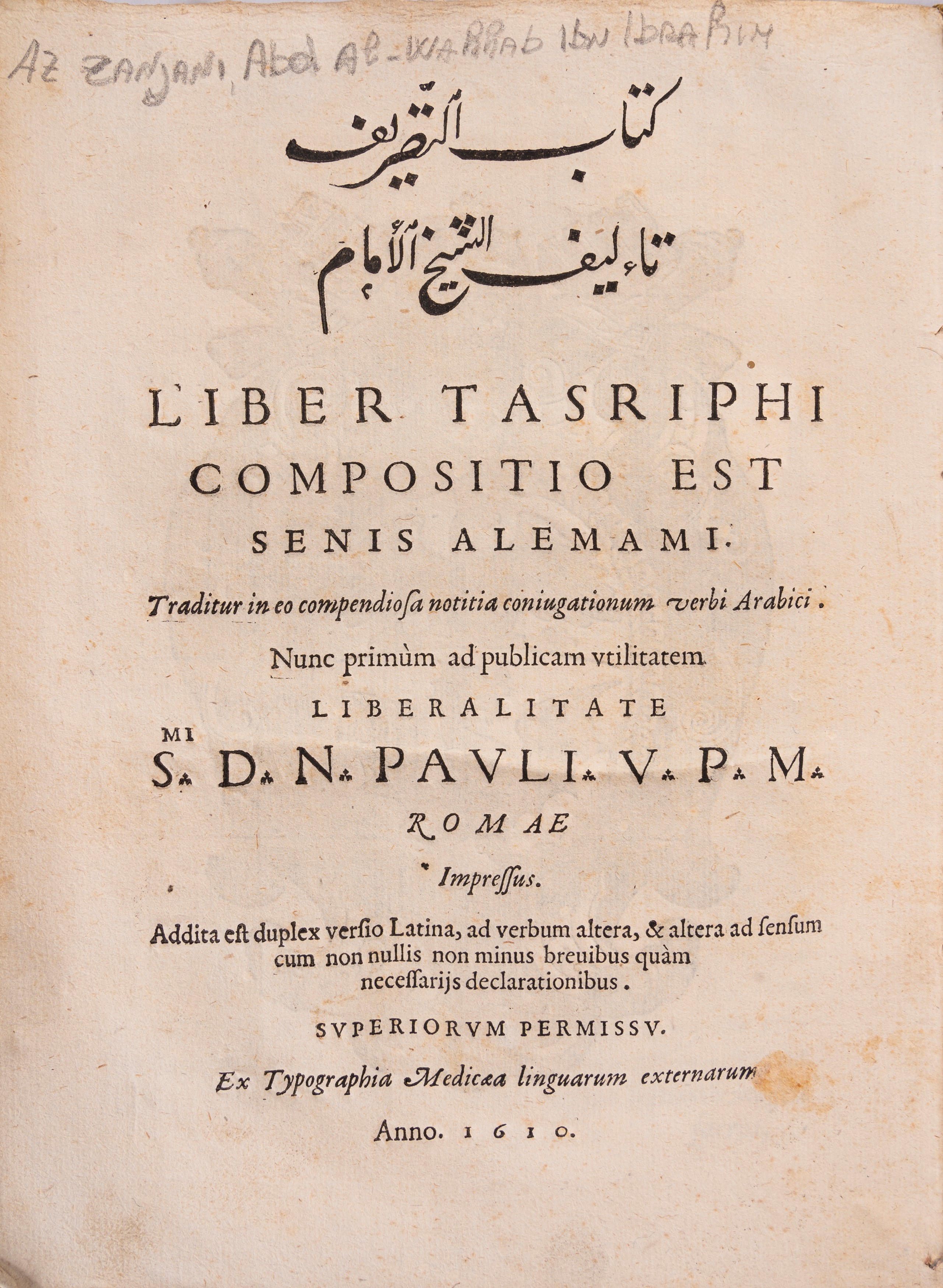Prima edizione del trattato grammaticale arabo noto come Tasrīf al-Zanjānī, edito da Raimondi a Roma non più ristampato fino al 1817 a Istanbul, dedicato a Papa Paolo V. Il volume presenta il testo arabo con traduzione latina letterale ed esegetica, talvolta commentata, la stampa, di grande eleganza tipografica, si distingue per l’uso di caratteri arabi di ampio corpo e per il titolo inciso in scrittura taʿlīq.