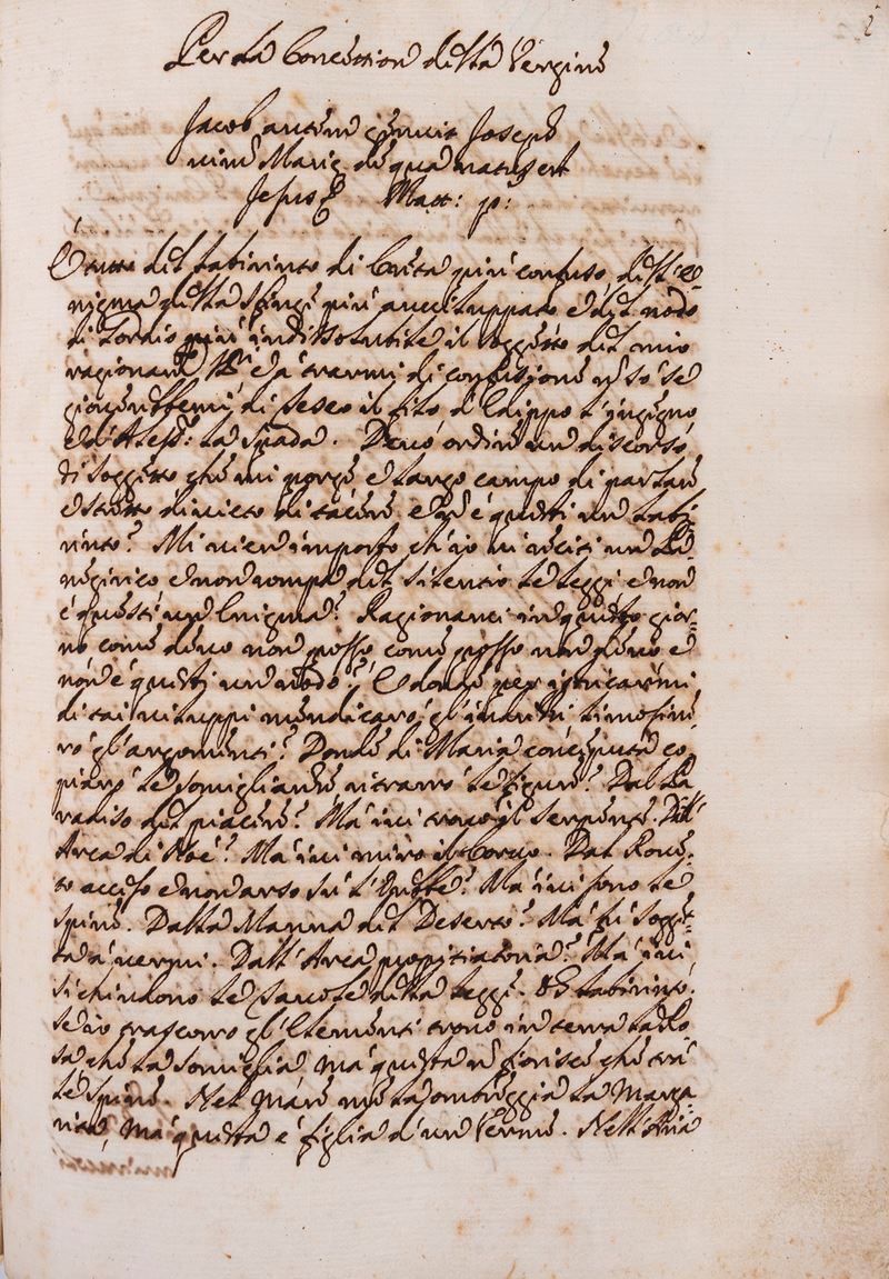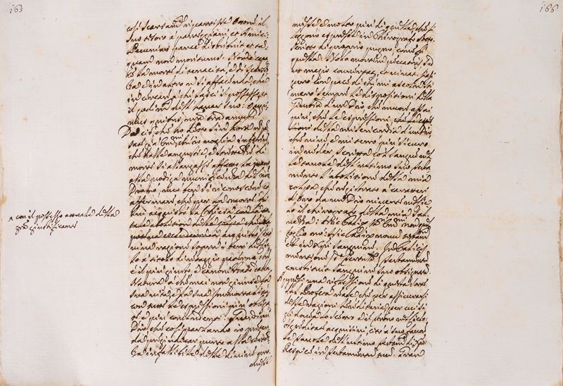 Manoscritto della fine del 600, dim. Legatura coeva in pergamena (successivamente restaurata al dorso). Testi in Italiano, con alcune parti in Latino, seguiti dall'indice. Raccolta dei testi di panegirici e orazioni tenuti a Roma tra il 1680 e il 1690. Lievi segni d'uso alla legatura. Carte pulite e croccanti, in barbe, con frequenti sbavature di inchiostro. Esemplare molto buono.