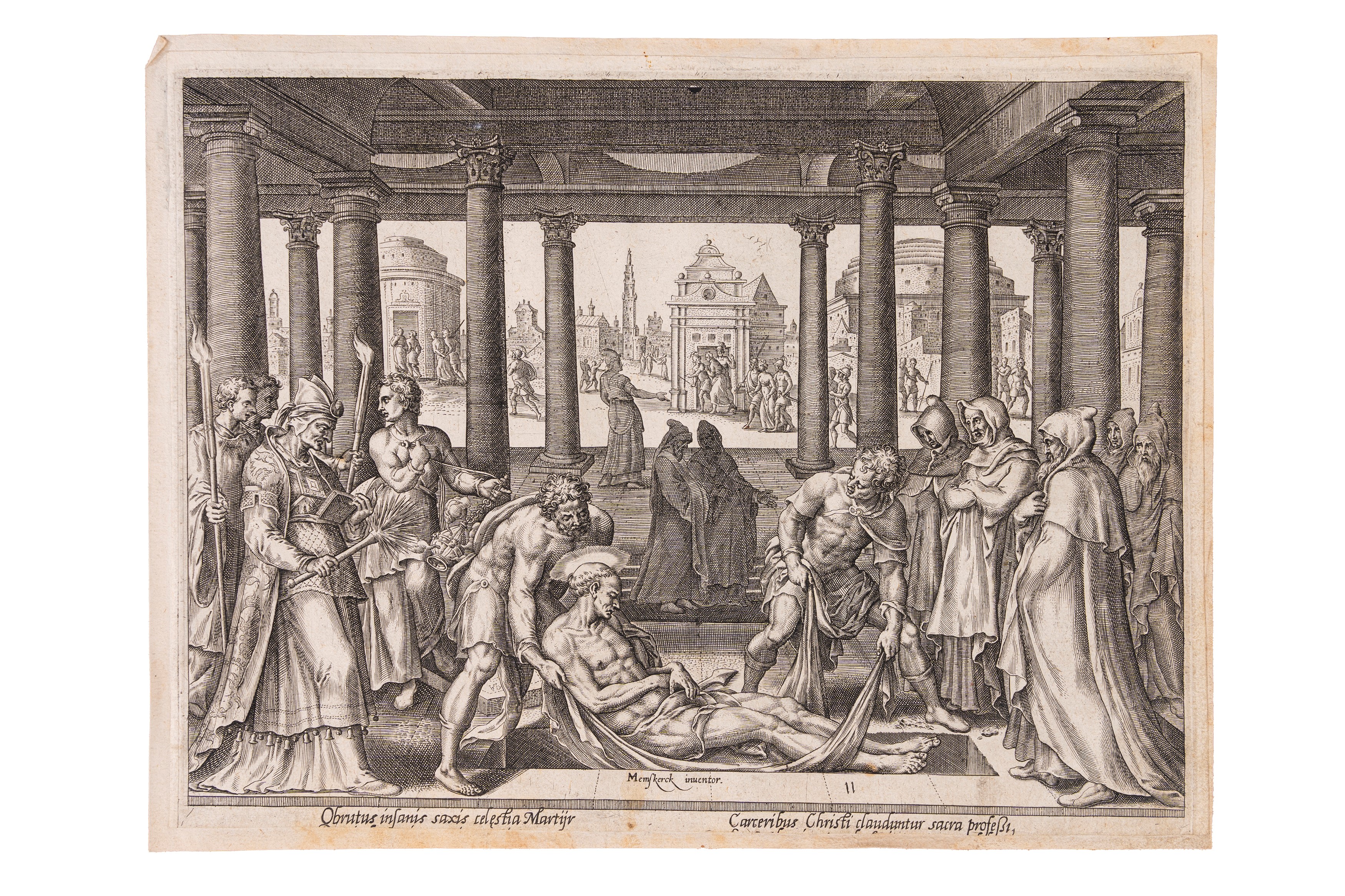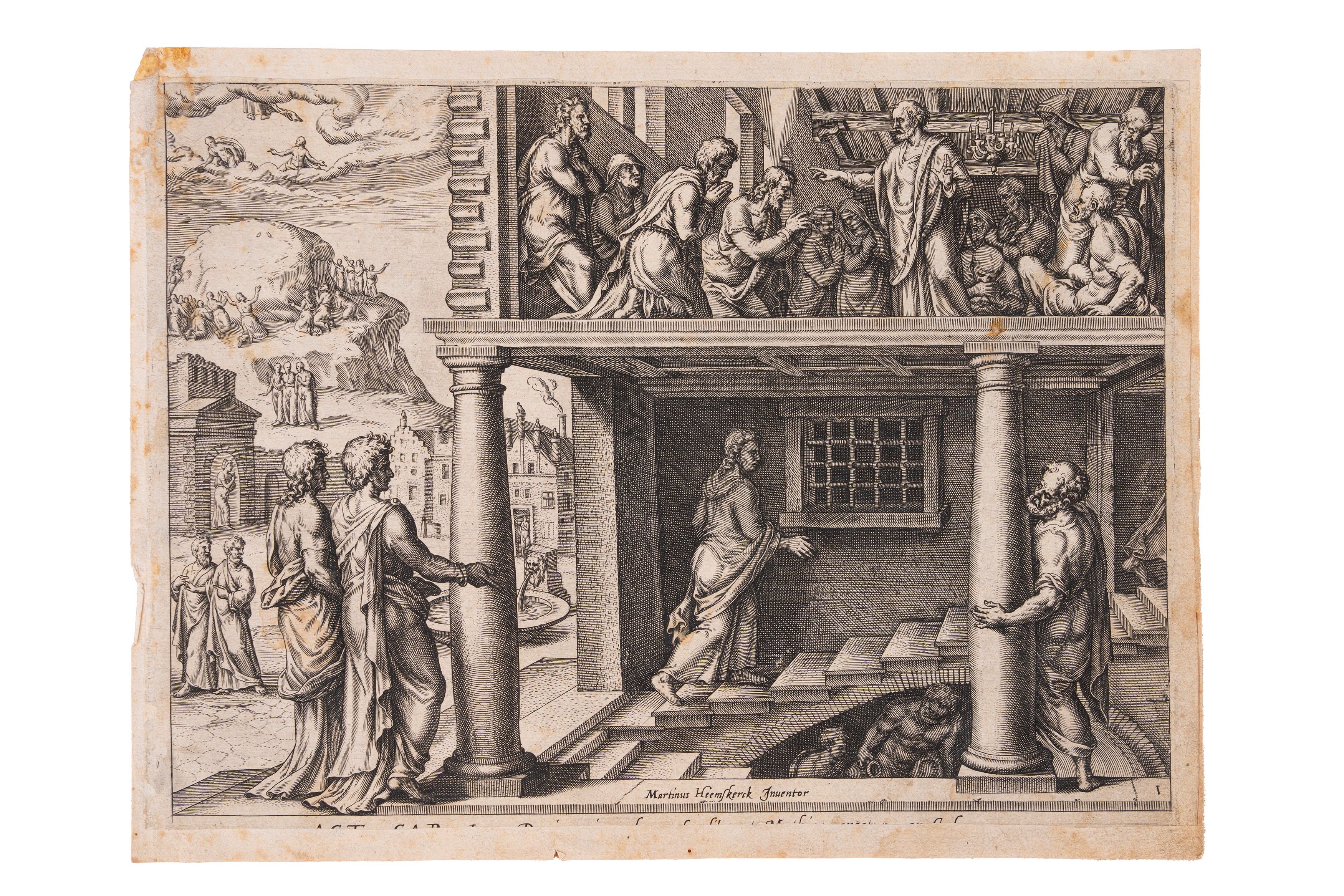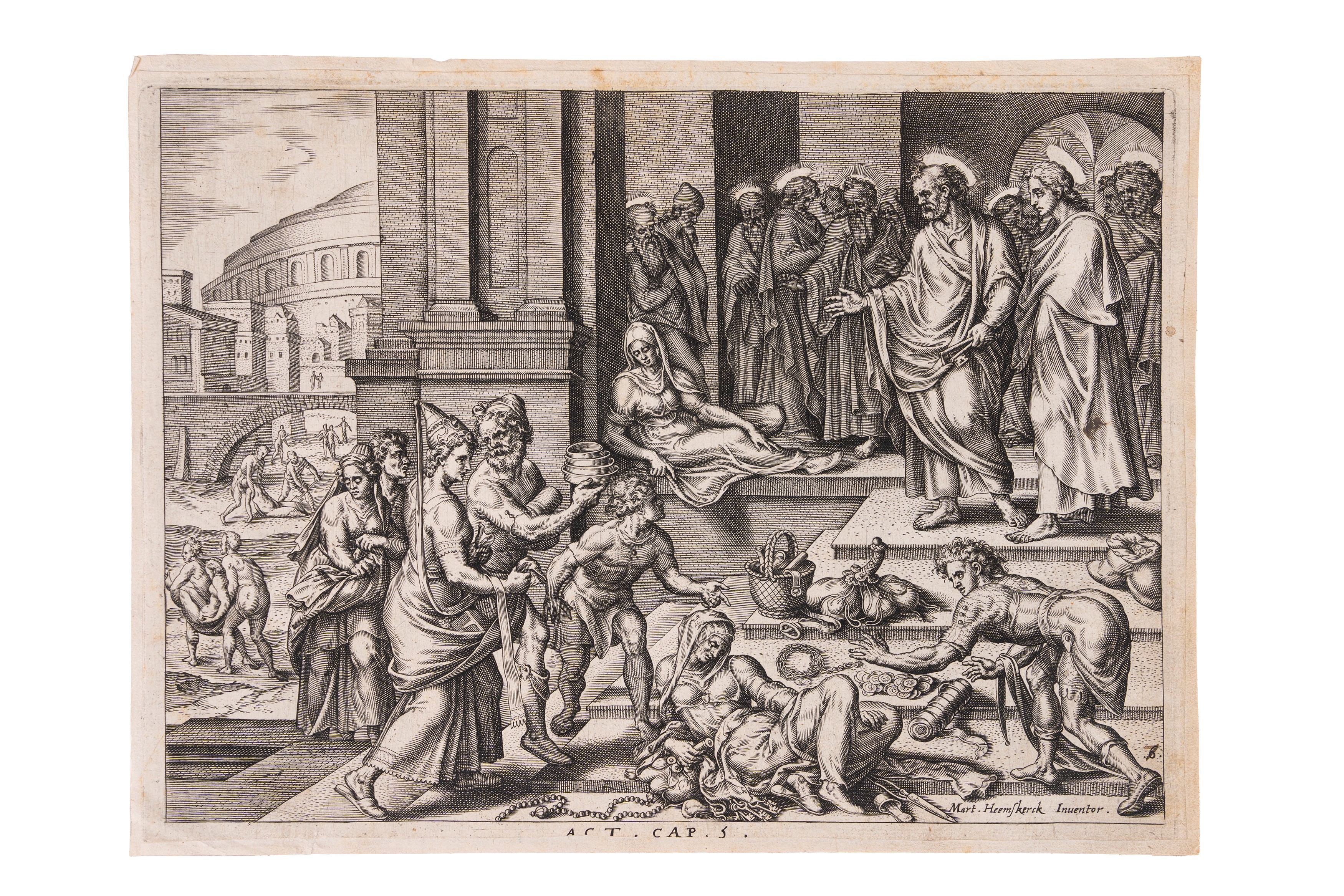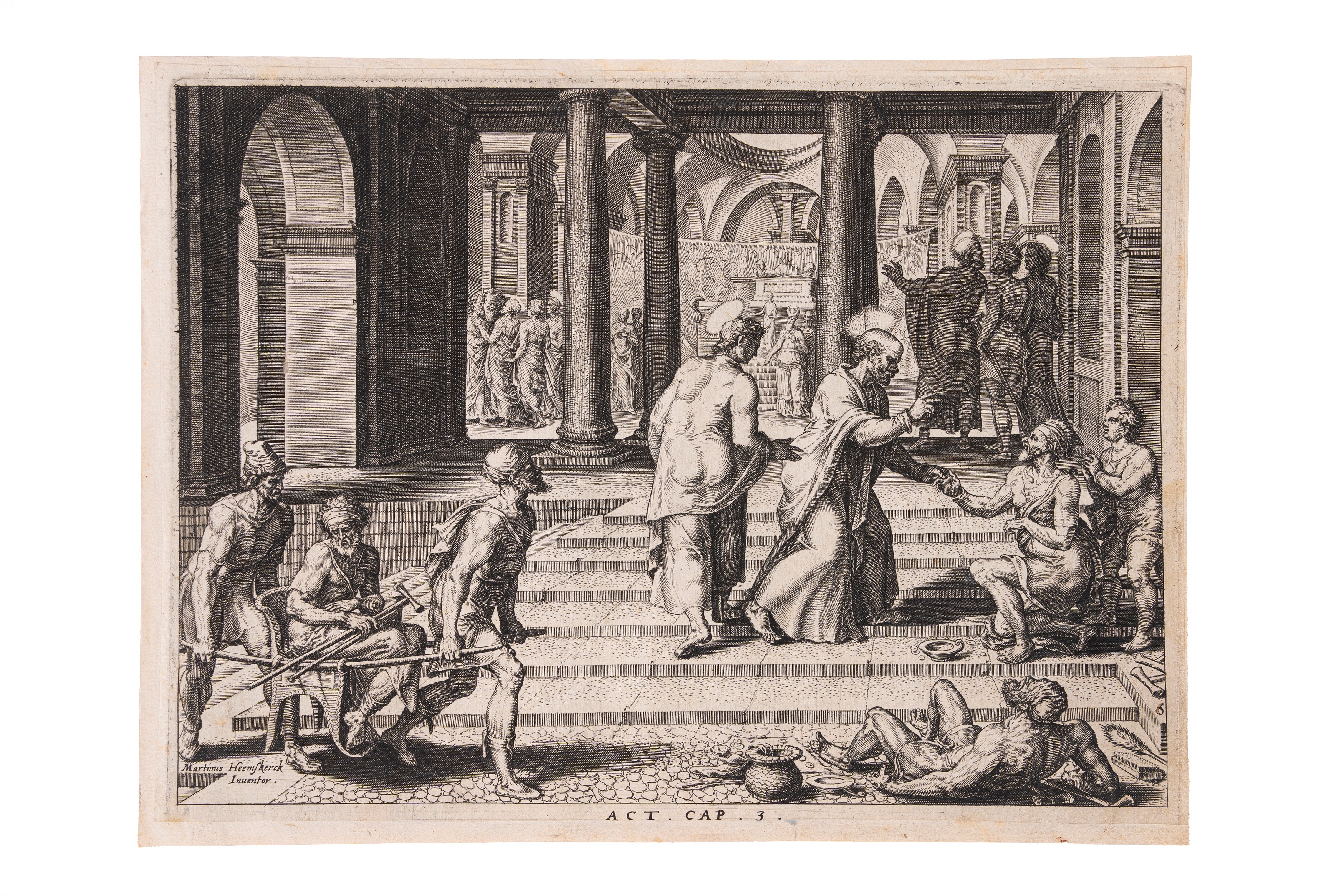 Insieme di 4 incisioni c.ca mm 201 x 275 controfondate della serie Acta Apostolorum incisa da Galle su disegni di Marteen van Heemskerck tra cui L'elezione di Mattia all'apostolato; La sepoltura di Santo Stefano; San Pietro guarisce lo storpio, qualche lieve fioritura.