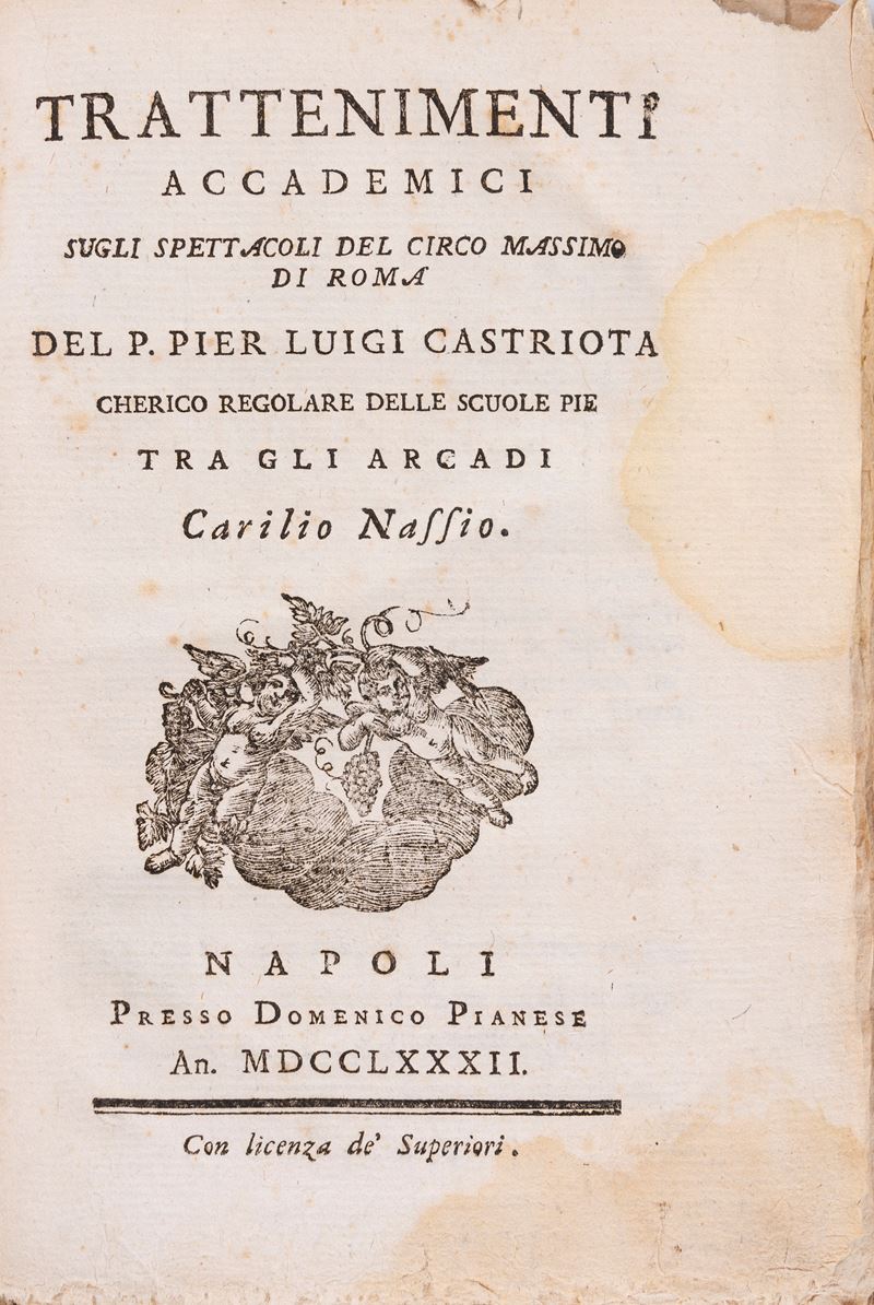 Napoli, presso Domenico Pianese, 1782. In-8°, legatura coeva in cartonato rivestito in carta decorata a mano; Vignetta xilografica al frontespizio. Testatine e iniziali xilografiche. Titolo all'occhietto: Trattenimenti accademici. Segni d'uso alla legatura (abrasioni e mancanze sui bordi delle carte, macchie). Distacco alla cerniera posteriore interna. Presenza di numerose gore d'umido, anche al frontespizio, e fioriture. Carte in barbe. Esemplare comunque nel complesso abbastanza buono.