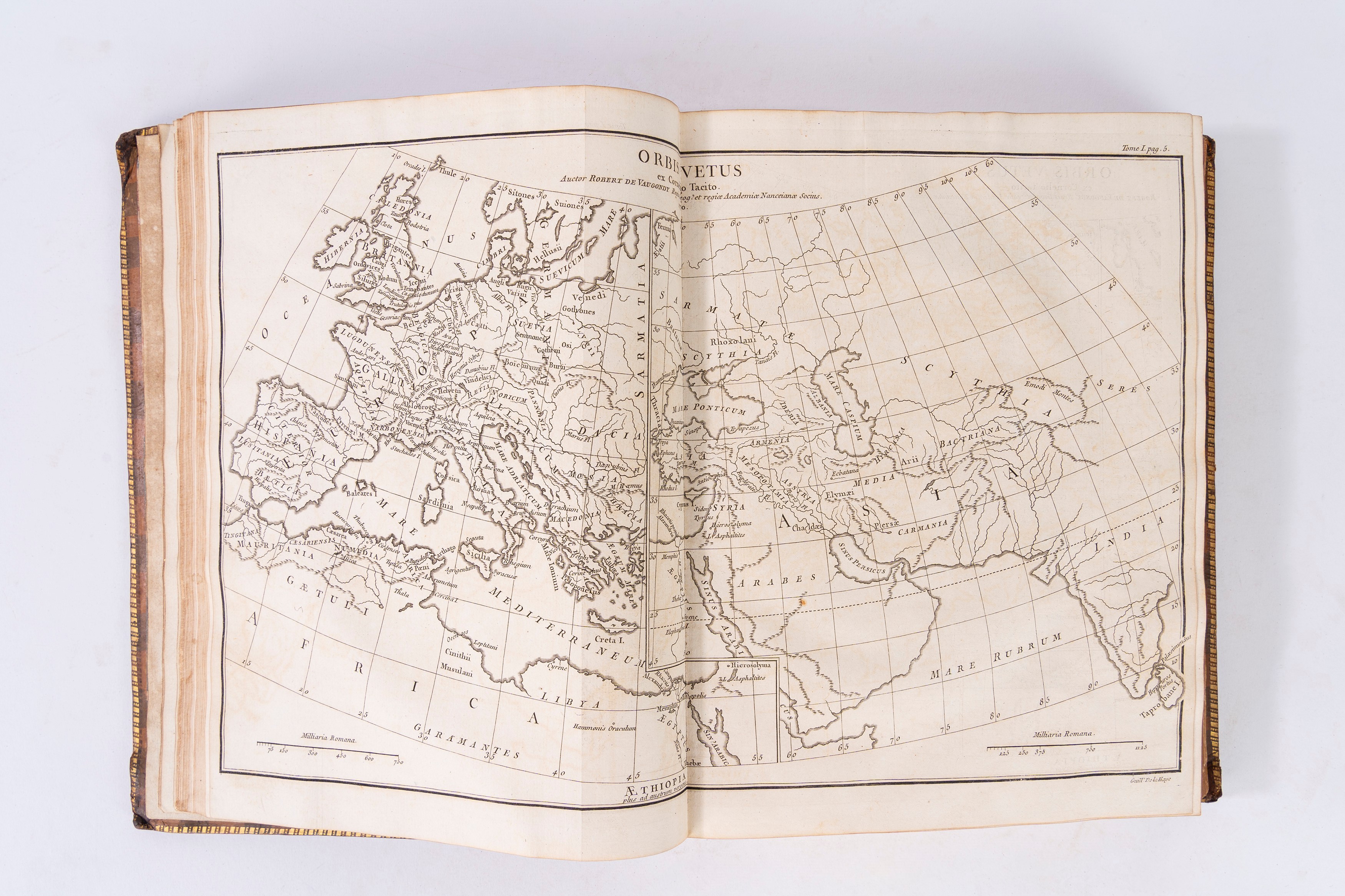 Parigi, Ludovici - Francisco Delatour, 1771. In 4°. 4 voll. Con 4 carte geografiche su doppia pagina e una tavola genealogica ripiegata al vol. I, lievi fioriture, carte di guardia marmorizzate, legatura coeva in vitello, piatti inquadrati da cornice in triplice filetto, dorsi riccamente ornati in oro, tasselli rosso e verdi con titoli in oro, tagli dorati piccole lacune alle cerniere, lievi difetti.