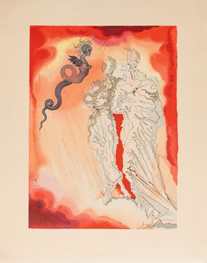 Bell'esemplare in edizione limitata impresso dalla Stamperia Valdonega di Verona su carta a mano dei Fratelli Magnani di Pescia. Le xilografie a colori che impreziosiscono l'opera furono senza alcun dubbio la più importante opera illustrativa di Dalì. L'apparato iconografico si compone di 100 tavole, di dimensione 355 x 280 mm. Furono necessari 5 anni di lavoro, dal '60 al '64 per incidere i 3500 legni per imprimere in progressiva i 35 colori di ogni singola tavola; l'opera di incisione delle lastre in legno e stata realizzata dal Maestro Raymond Jacquet sotto la diretta supervisione di Salvador Dalì che ha riversato, nell'illustrare la Divina Commedia, i motivi più rilevanti della sua ricerca metafisica e mistica.