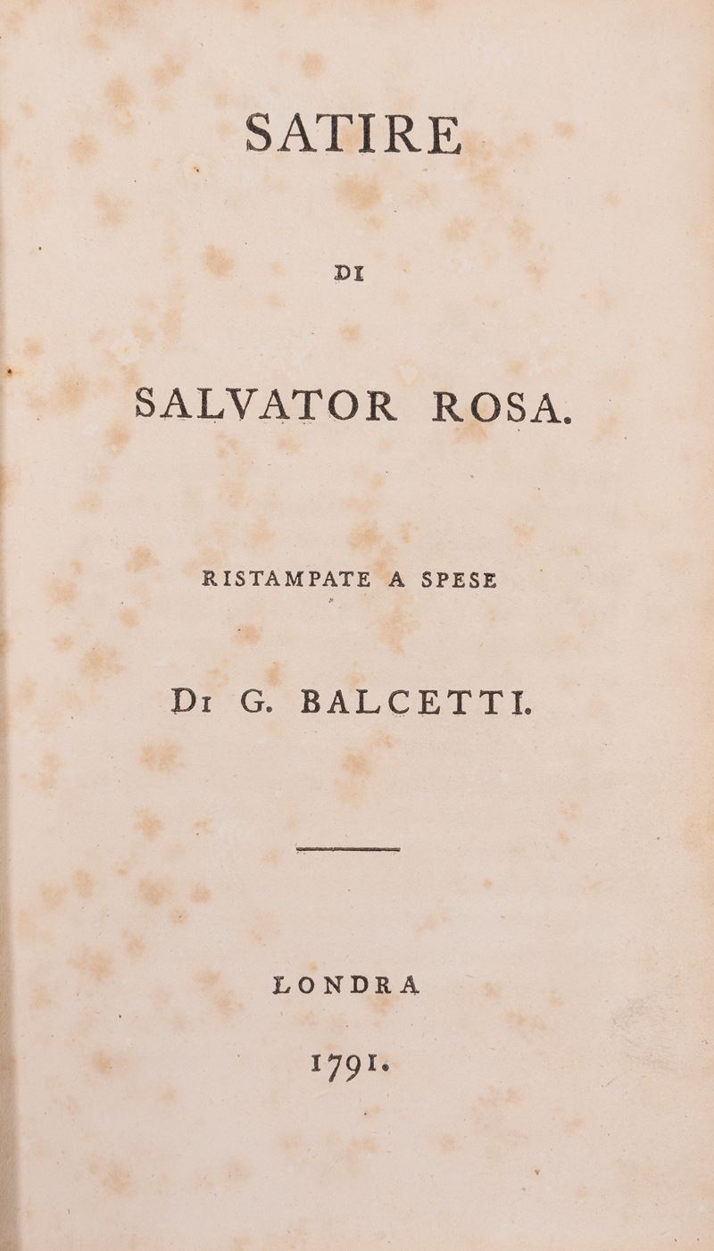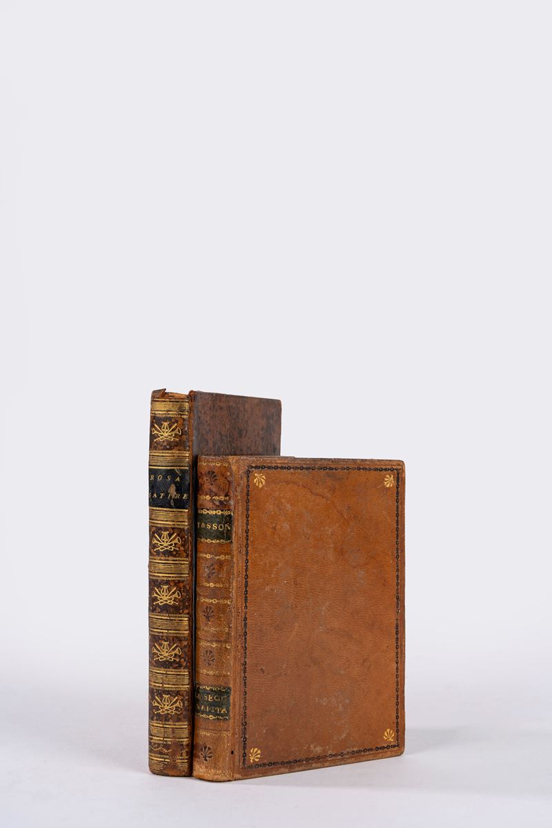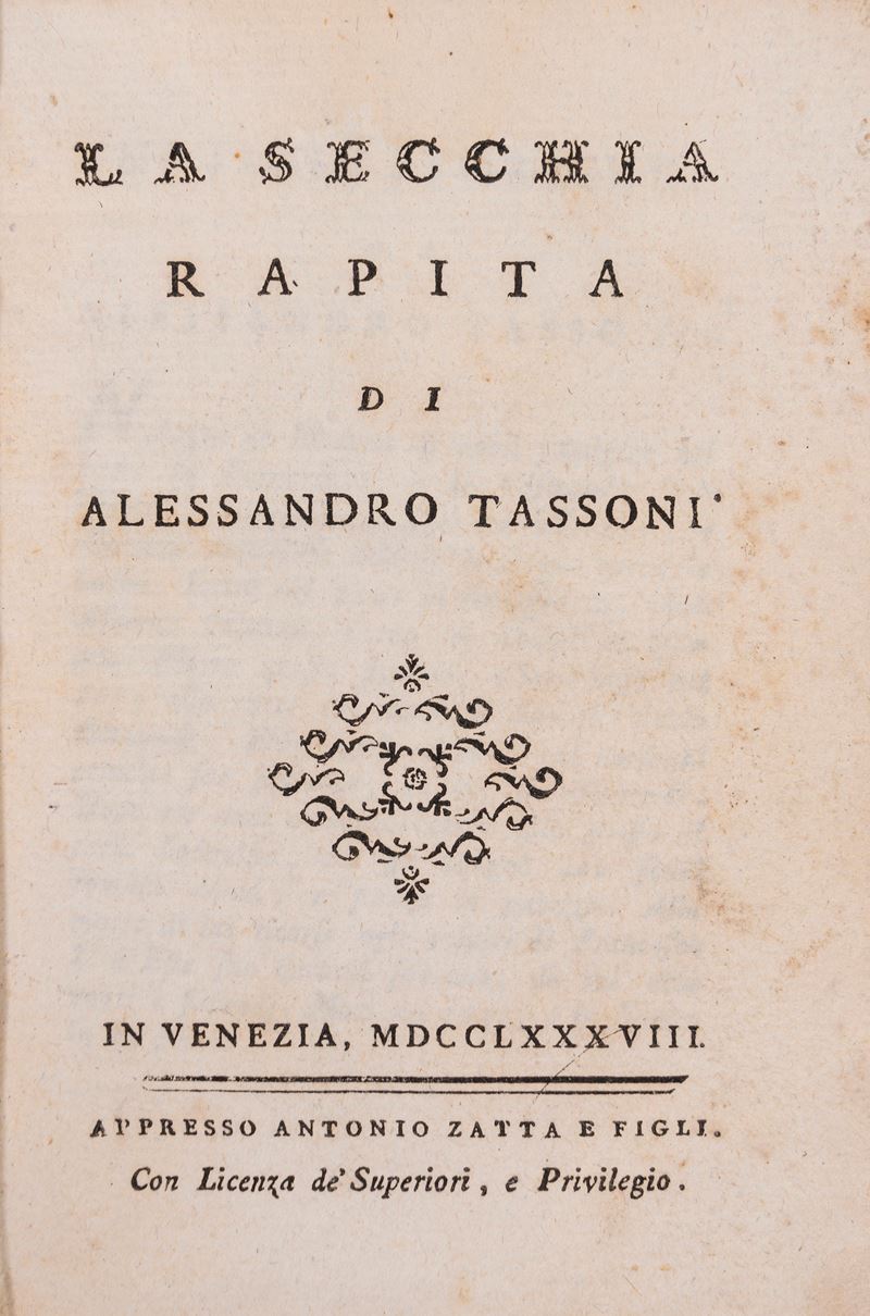 Londra, s.e., 1791. in 8°. Qualche lieve fioritura, legatura coeva in vitello, titolo entro tassello al dorso. § Tassini, Alessandro, La Secchia rapita, Venezia, Antonio Zatta e figli, 1788. In 16°. Legatura in marocchino, fregi ai piatti in nero e oro, titolo entro tasselli al dorso.
