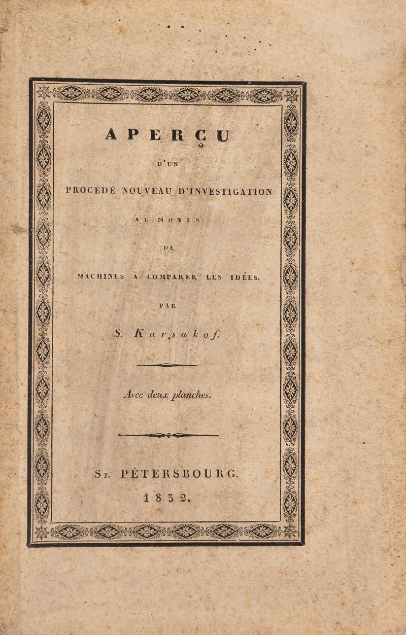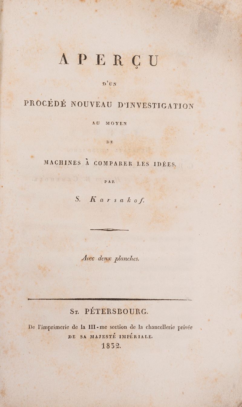 Korsakov, statistico presso il Ministero della Polizia russa a San Pietroburgo, fu un pioniere nel concetto di “pensiero meccanizzato” o intelligenza artificiale. Le sue “macchine per il confronto delle idee”, descritte e illustrate nel presente opuscolo, possono “essere considerate come il primo tentativo di progettare un dispositivo meccanico in grado di eseguire operazioni intellettuali quali l'analisi, il confronto e la selezione dei dati” (Shilov e Silantiev, p. 71). Certamente sono state stampate pochissime copie di questo opuscolo, poiché è quasi sconosciuto agli studiosi. Le “macchine per confrontare le idee” di Korsakov anticiparono di quasi due decenni le macchine logiche di Alfred Smee, il cui Process of Thought Adapted to Words and Language fu pubblicato nel 1851, ma i suoi contributi pionieristici al pensiero meccanizzato rimasero oscuri e in gran parte non studiati fino a tempi recenti.