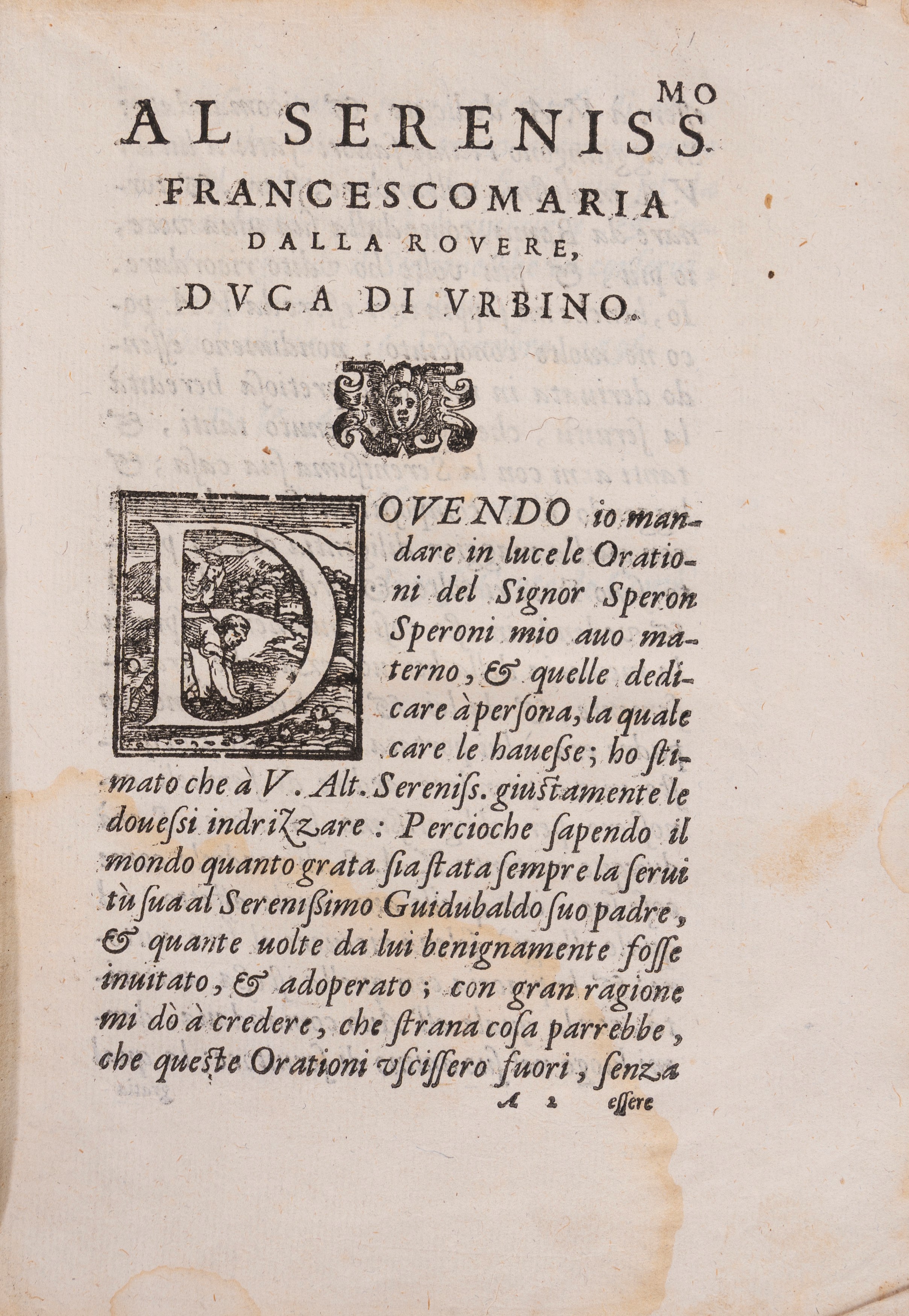 Prima e unica edizione di questa raccolta delle orazioni di Sperone Speroni, a cura di I. Conti, il cui nome appare nella pref. a c. πA3r.