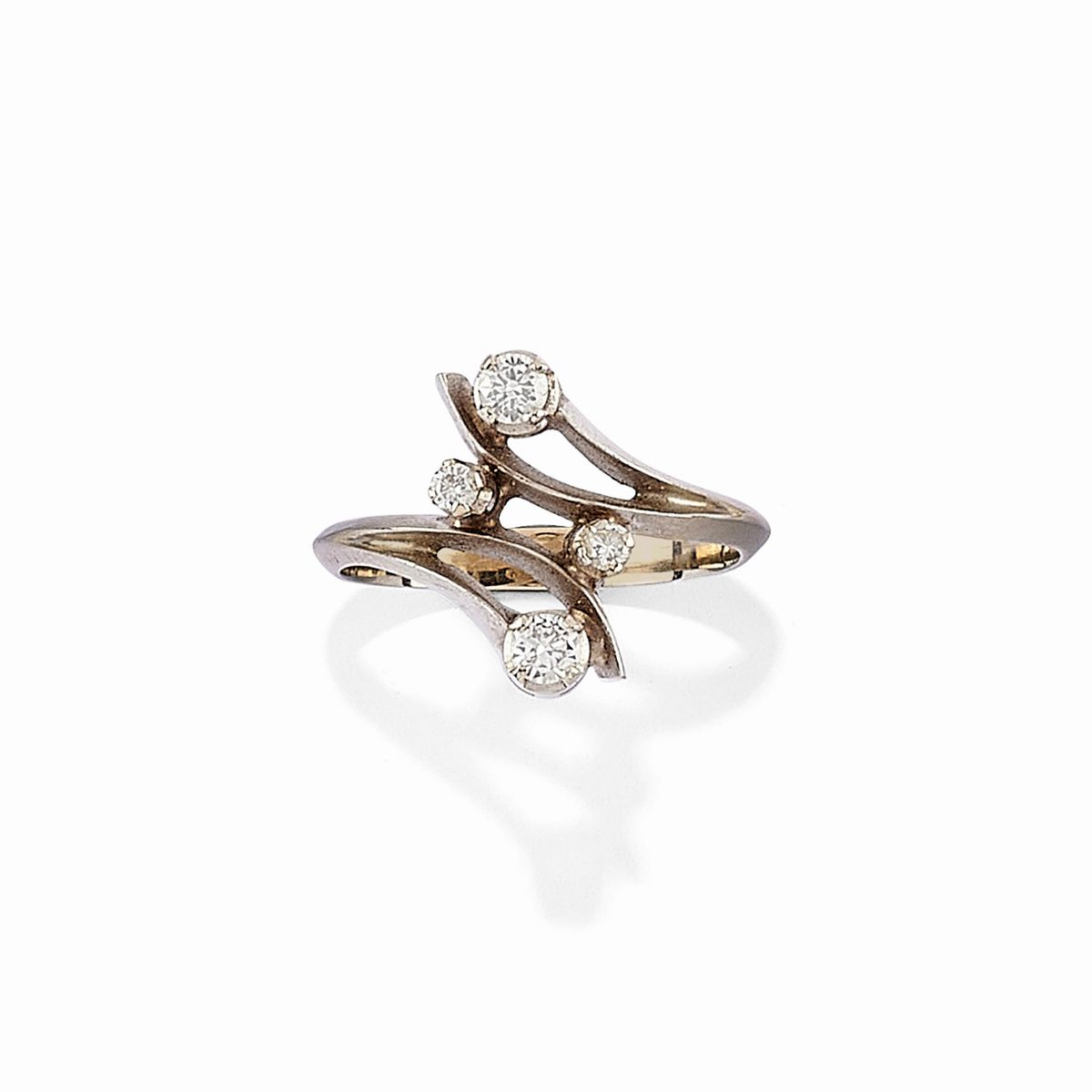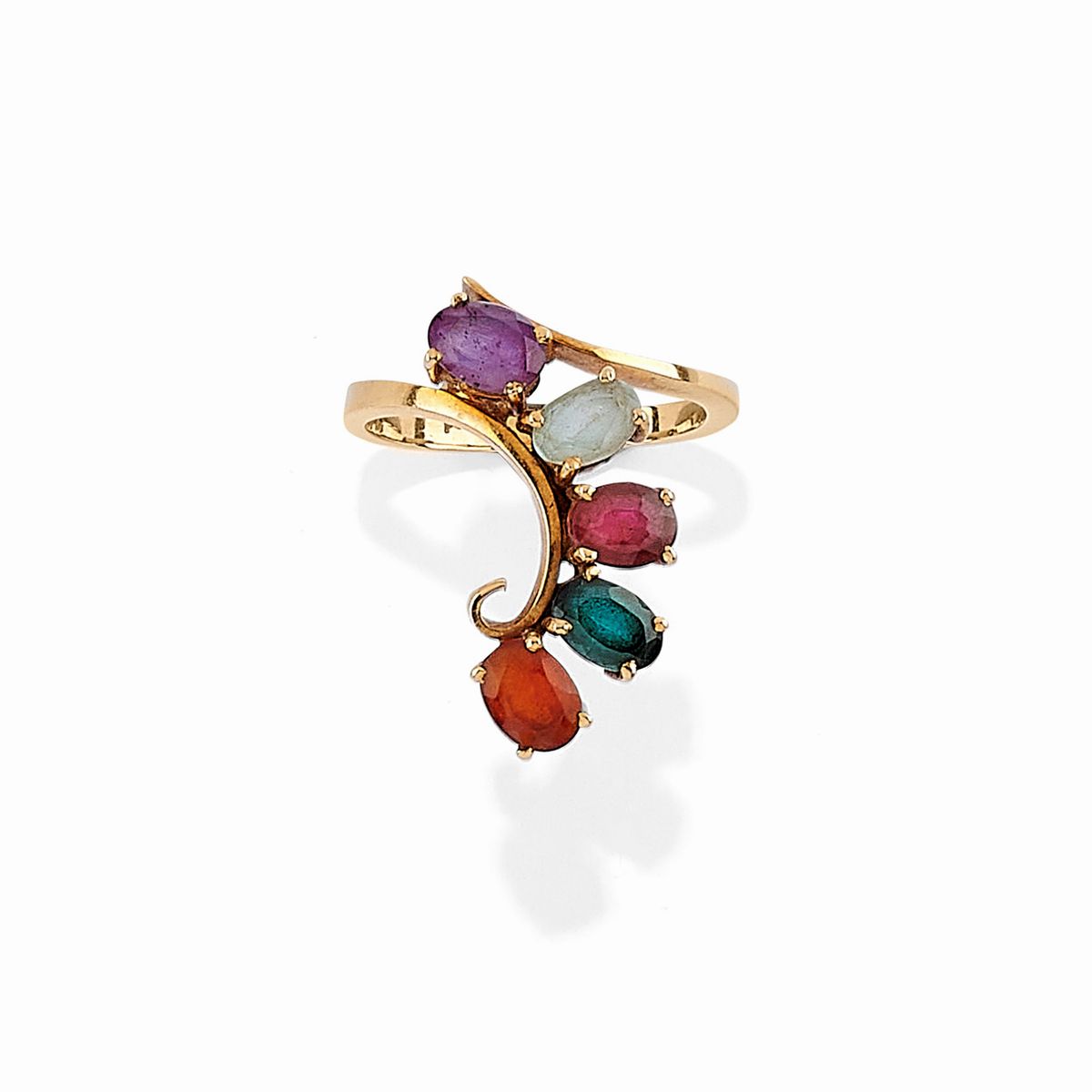 in oro bicolore 18K, uno con diamanti taglio brillante per totale ct 0,25 circa, l'altro con pietre colorate taglio ovale, di forme stilizzate.