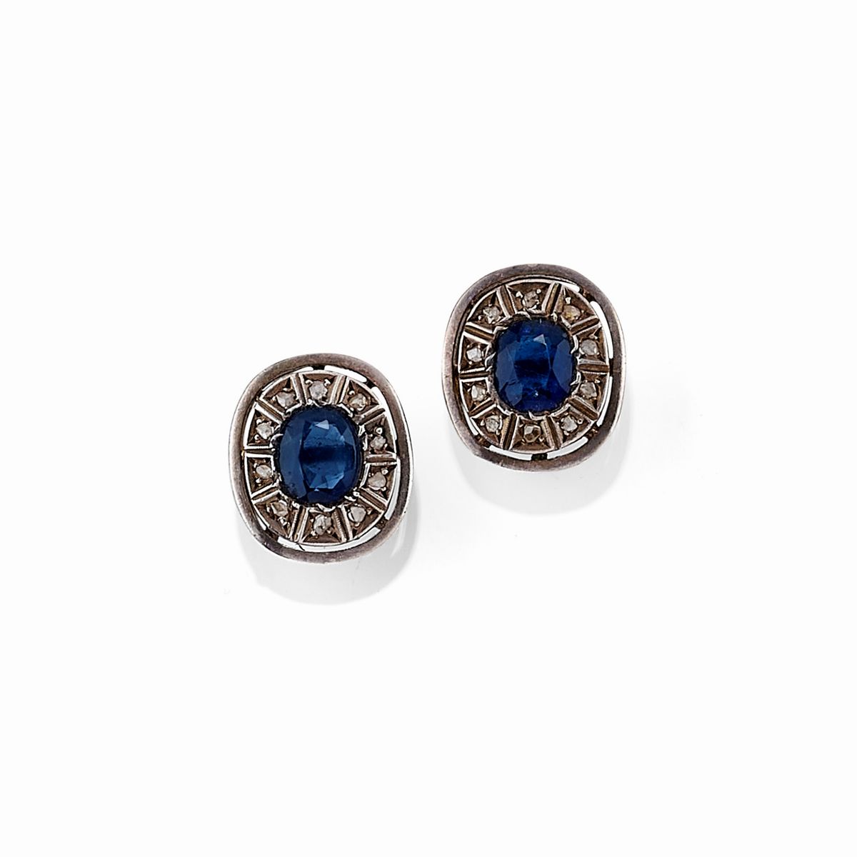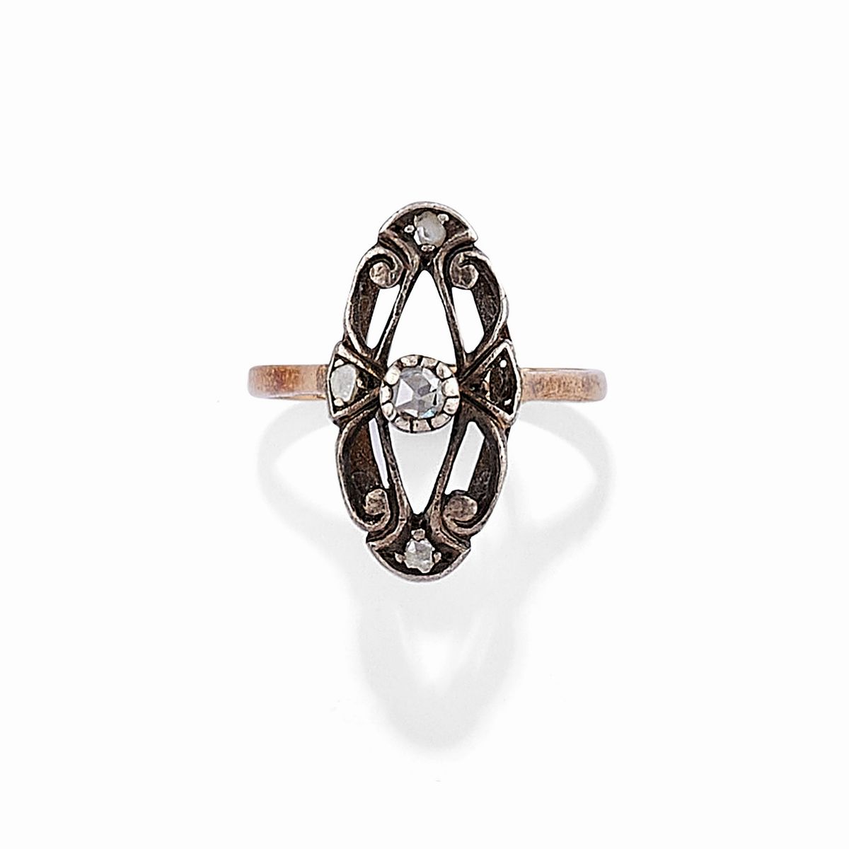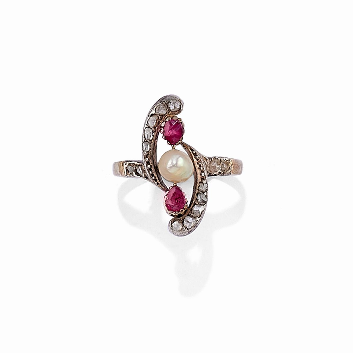 in argento, oro giallo 18K, un anello con rubini taglio goccia, diamanti taglio rosa e perla (prob. naturale), un anello a losanga con diamanti taglio rosa, una coppia di orecchini con zaffiri sintetici e diamanti taglio rosa, uno spillone con rubino taglio ovale e diamanti taglio rosa.