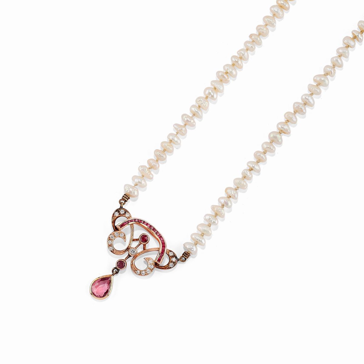 in oro giallo 18K, una con motivi a losanga e perle coltivate di mm 7,00 circa, l'altra con perle di fiume, centrale in rubini taglio carré e goccia, diamanti taglio brillante.