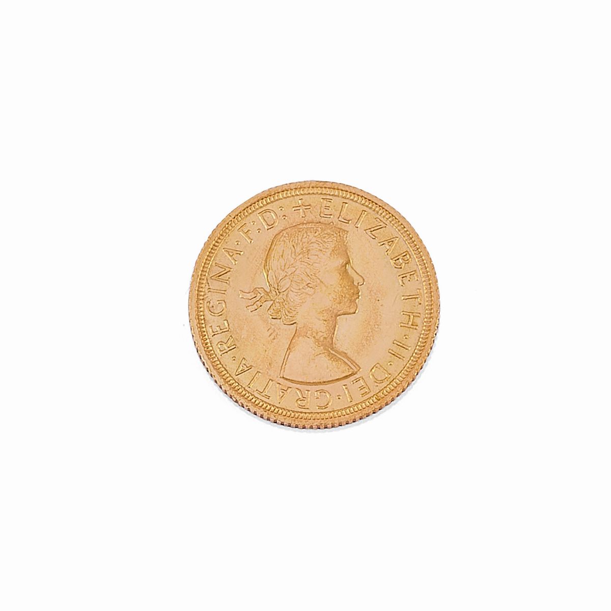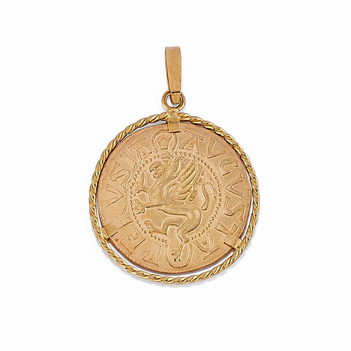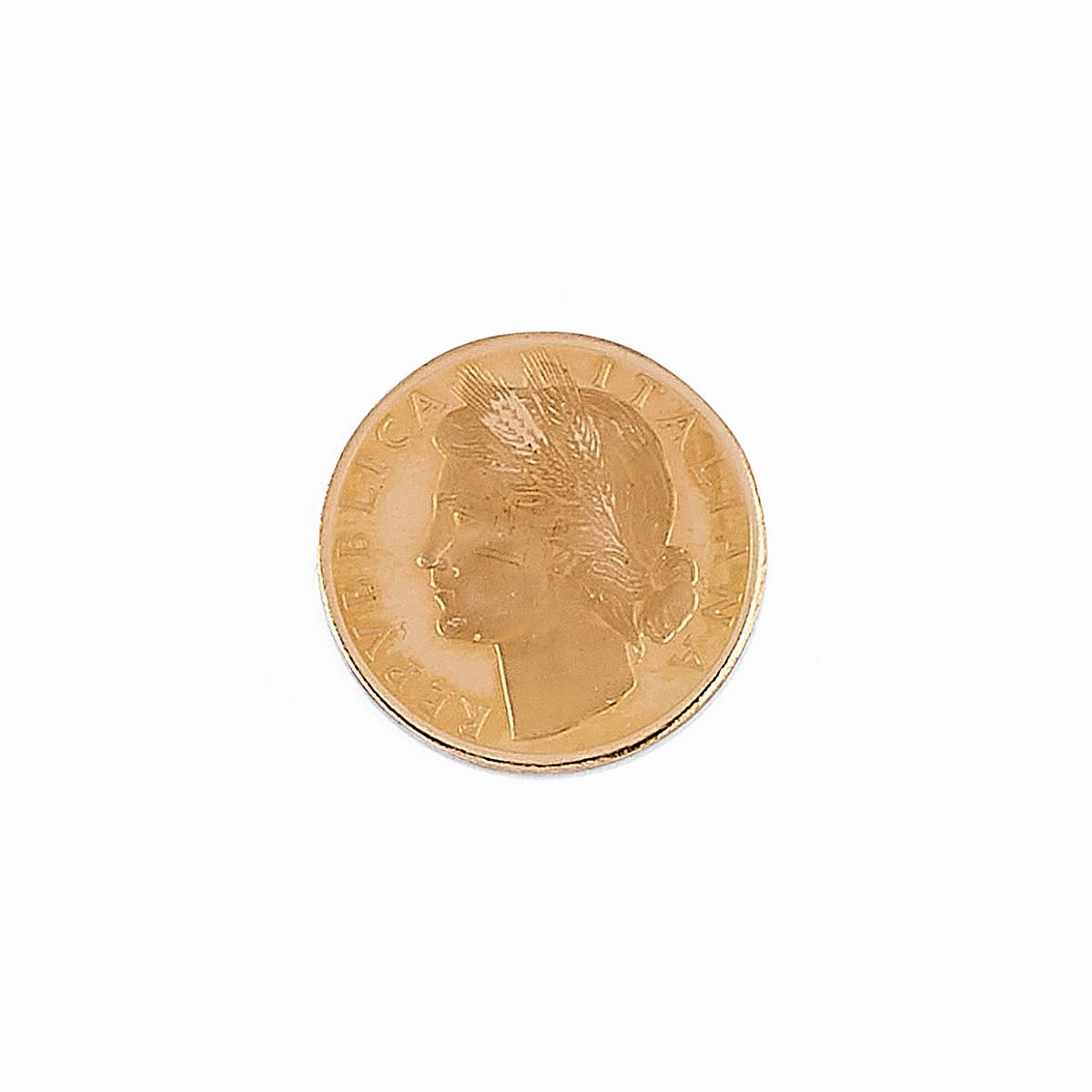una medaglia titolo 750 Repubblica Italiana L.1, una medaglia titolo 750 trattenuta da ciondolo e una sterlina d'oro 7,31 grammi di oro puro.