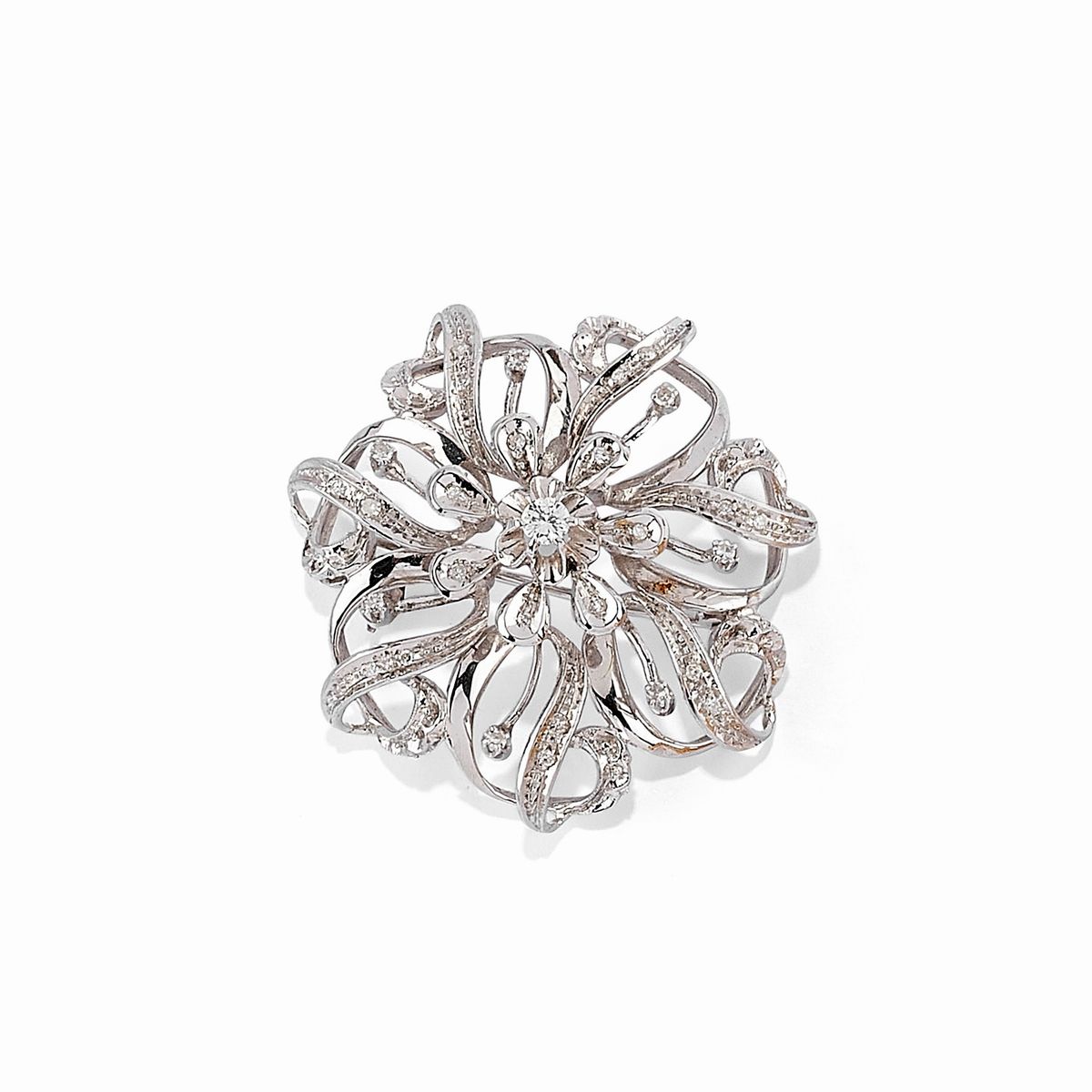 in oro bicolore 18K, una floreale con diamanti taglio brillante e huit-huit, l'altra realizzata a raggiera con microperle e diamanti taglio vecchio, al centro cammeo scolpito.