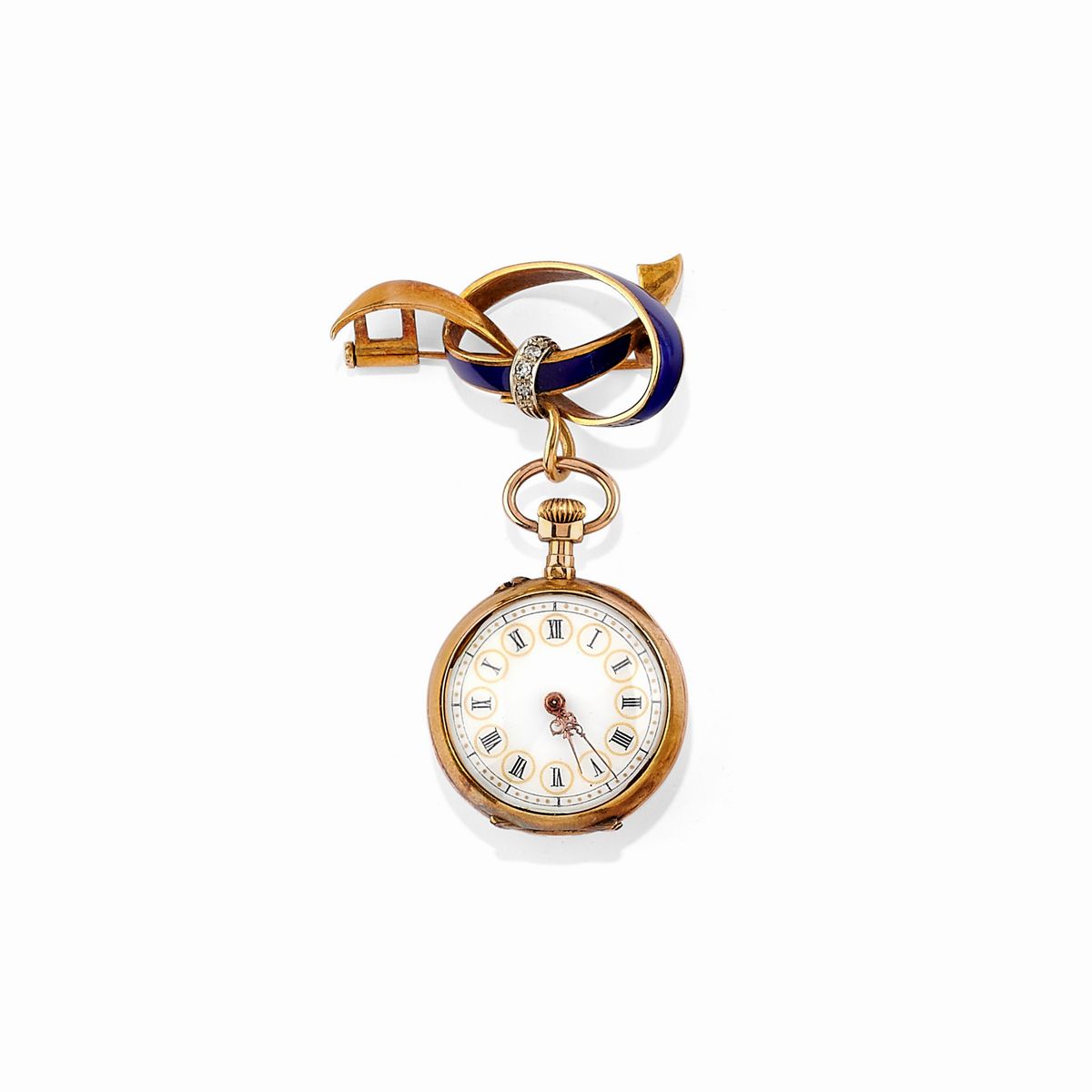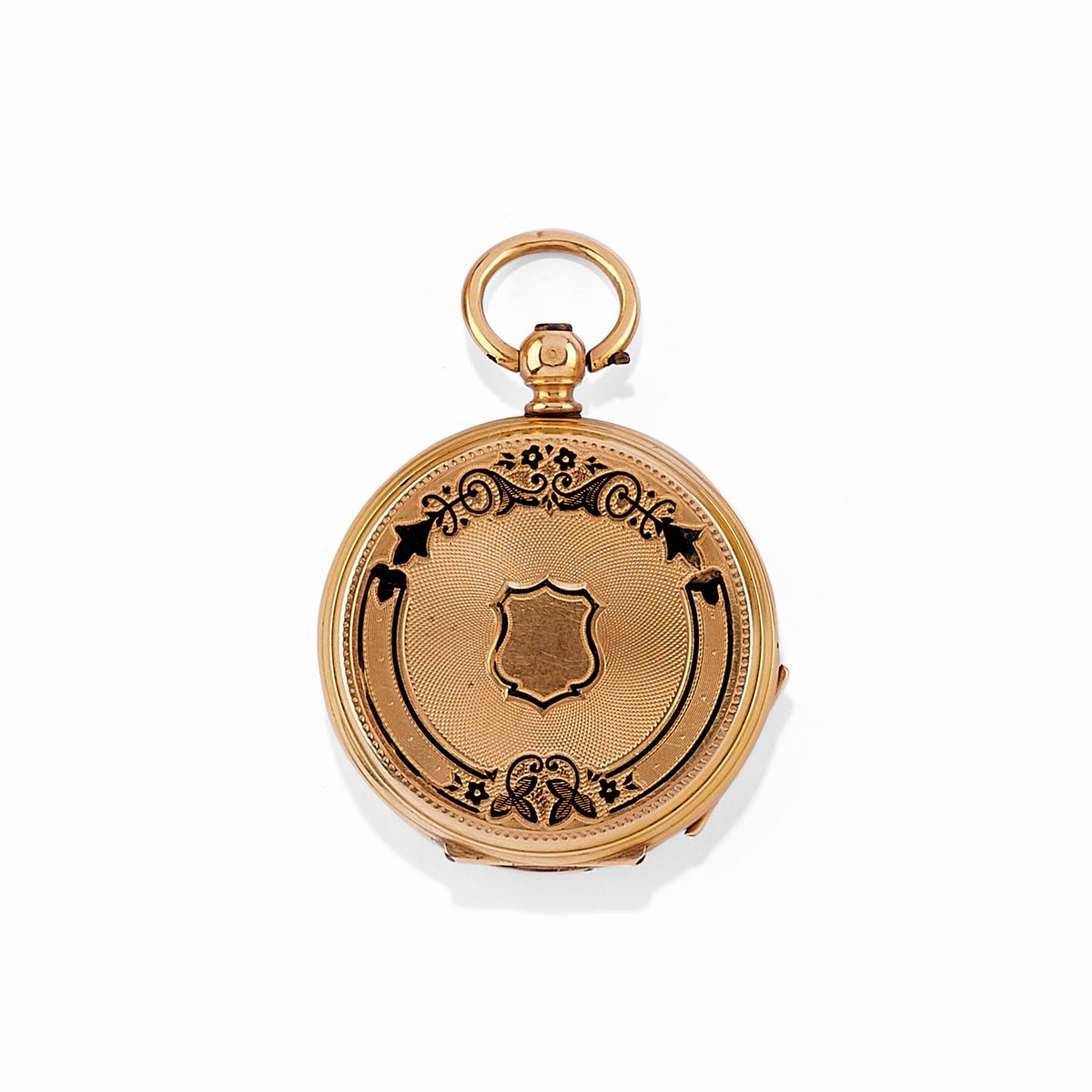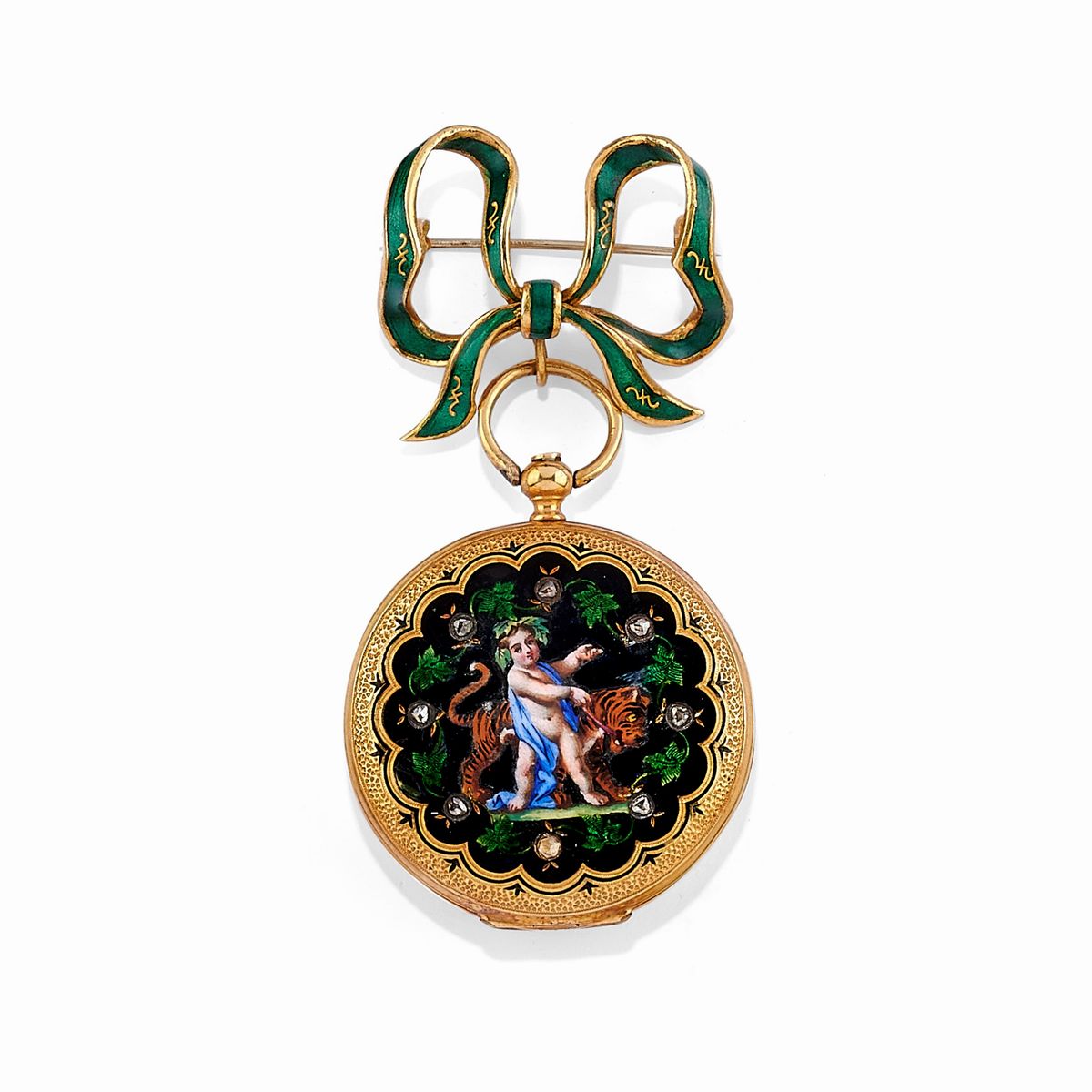 in oro giallo 18K, movimenti a carica manuale, con incisioni floreali, diamanti taglio rosa e smalti policromi, difetti (da revisionare).