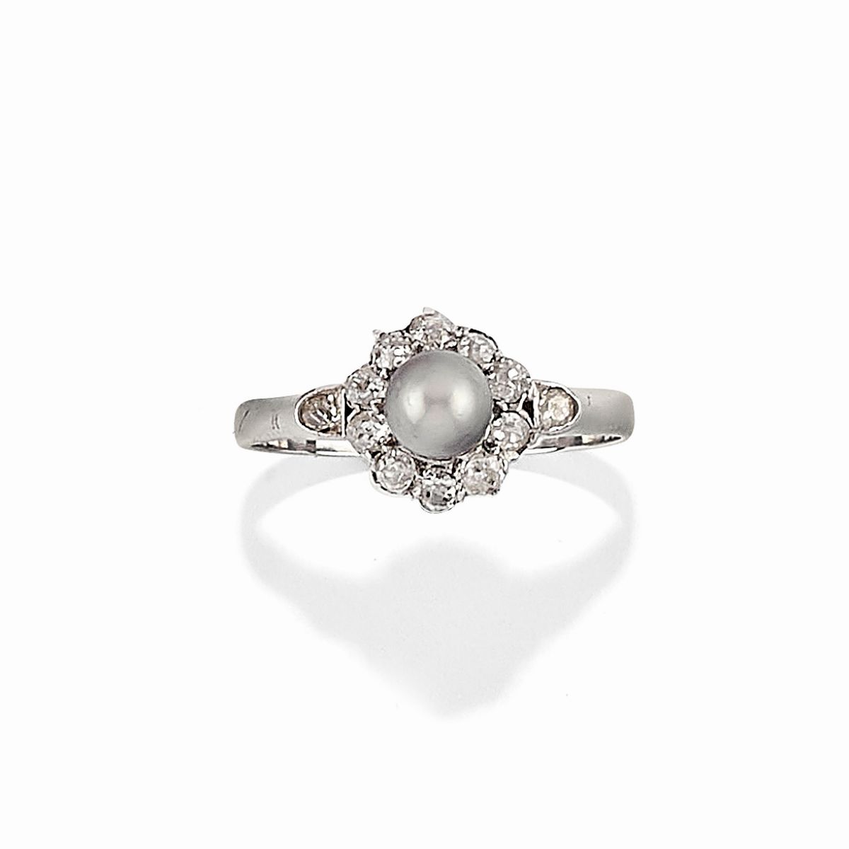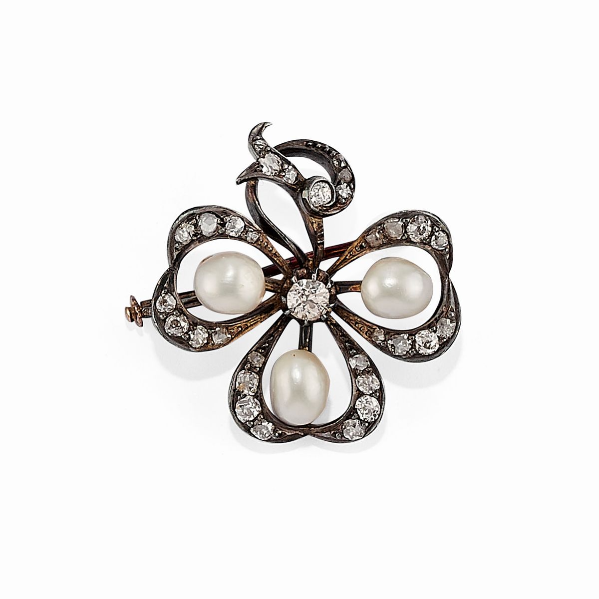 in argento, oro bianco 18K, spilla fine XIX secolo realizzata a trifoglio con diamanti taglio vecchio e perle (prob. naturali), anello con perla Tahiti e piccoli diamanti taglio vecchio.